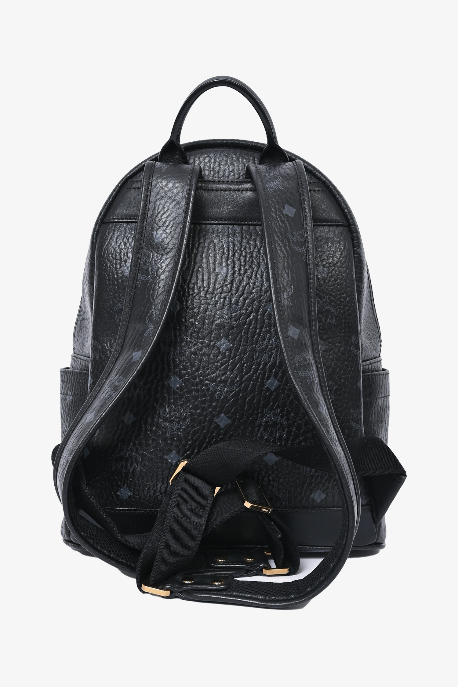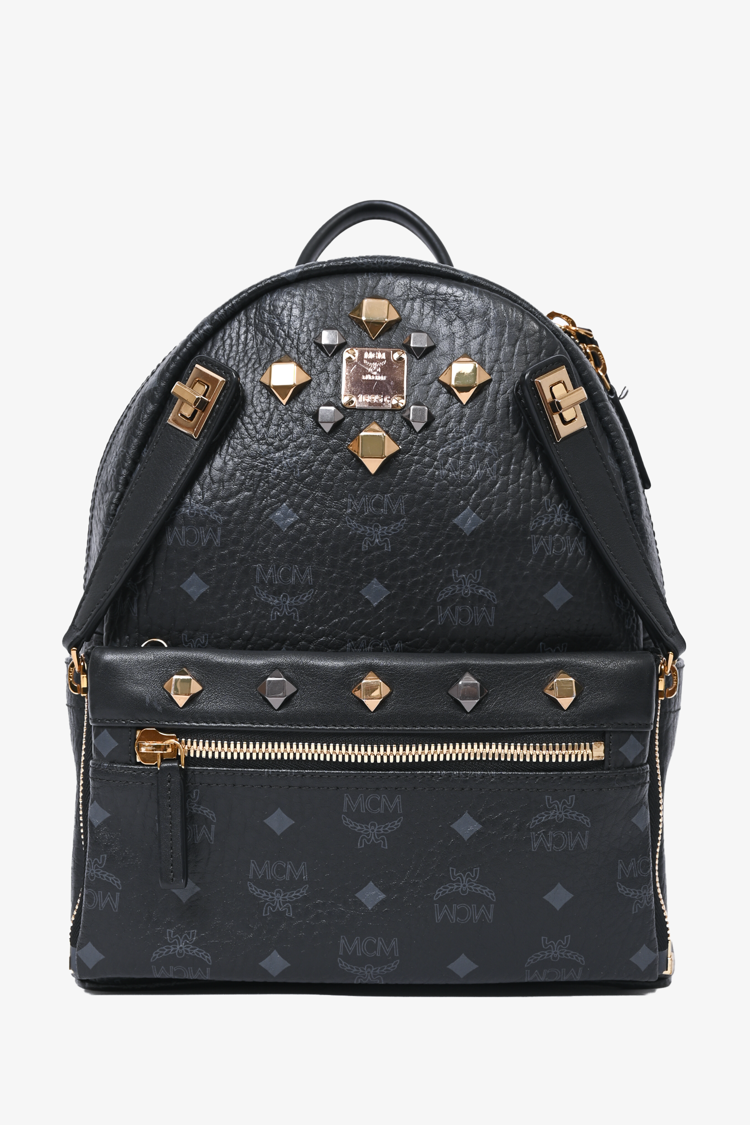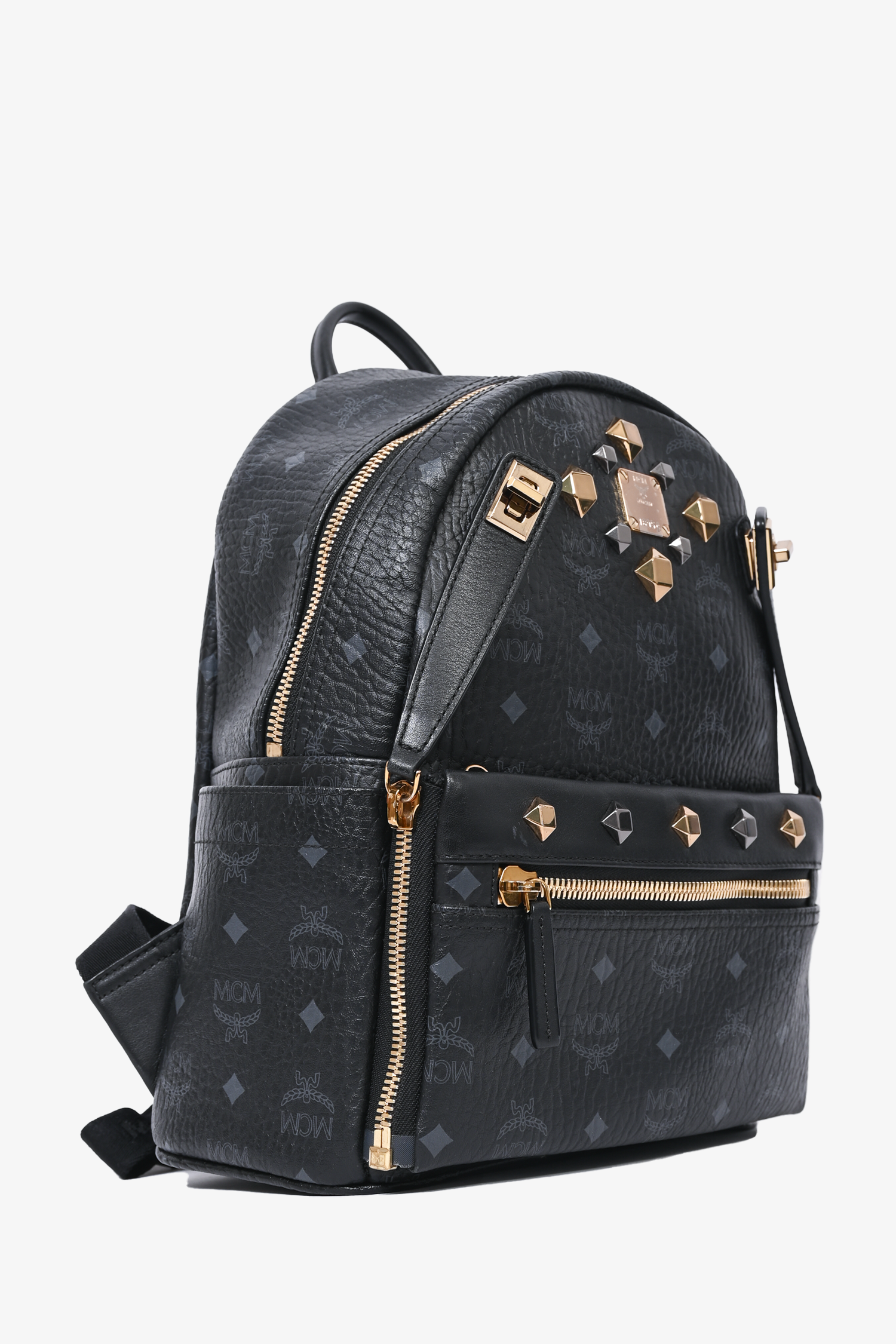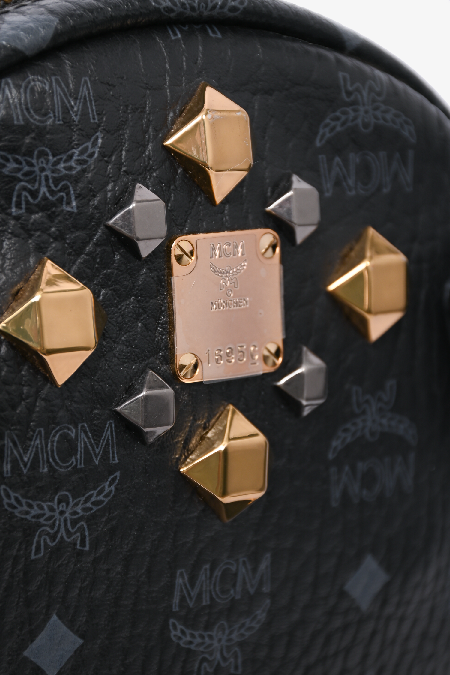 Refresh availabilityMCM Monogram Leather Backpack. Single top handle. Top zip closure. Adjustable backpack straps. 2 side slip pockets. 3 Front pocket; 1 zip, 1 slip, 1 slip with magnetic closure. Leather interior lining. 2 interior slip pockets. Gold and gunmetal-tone hardware. Removable front exterior pouch. Tonal stitching.