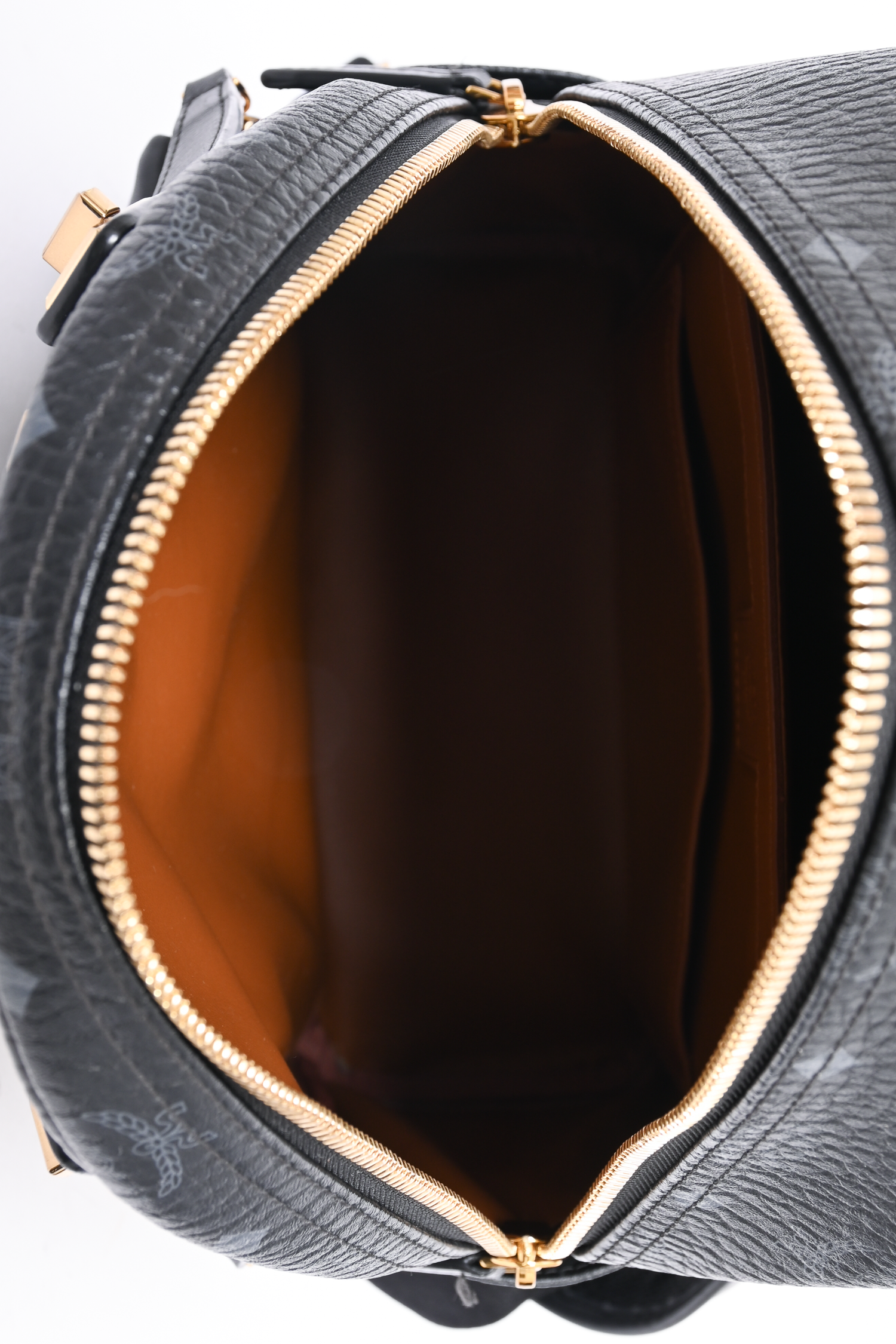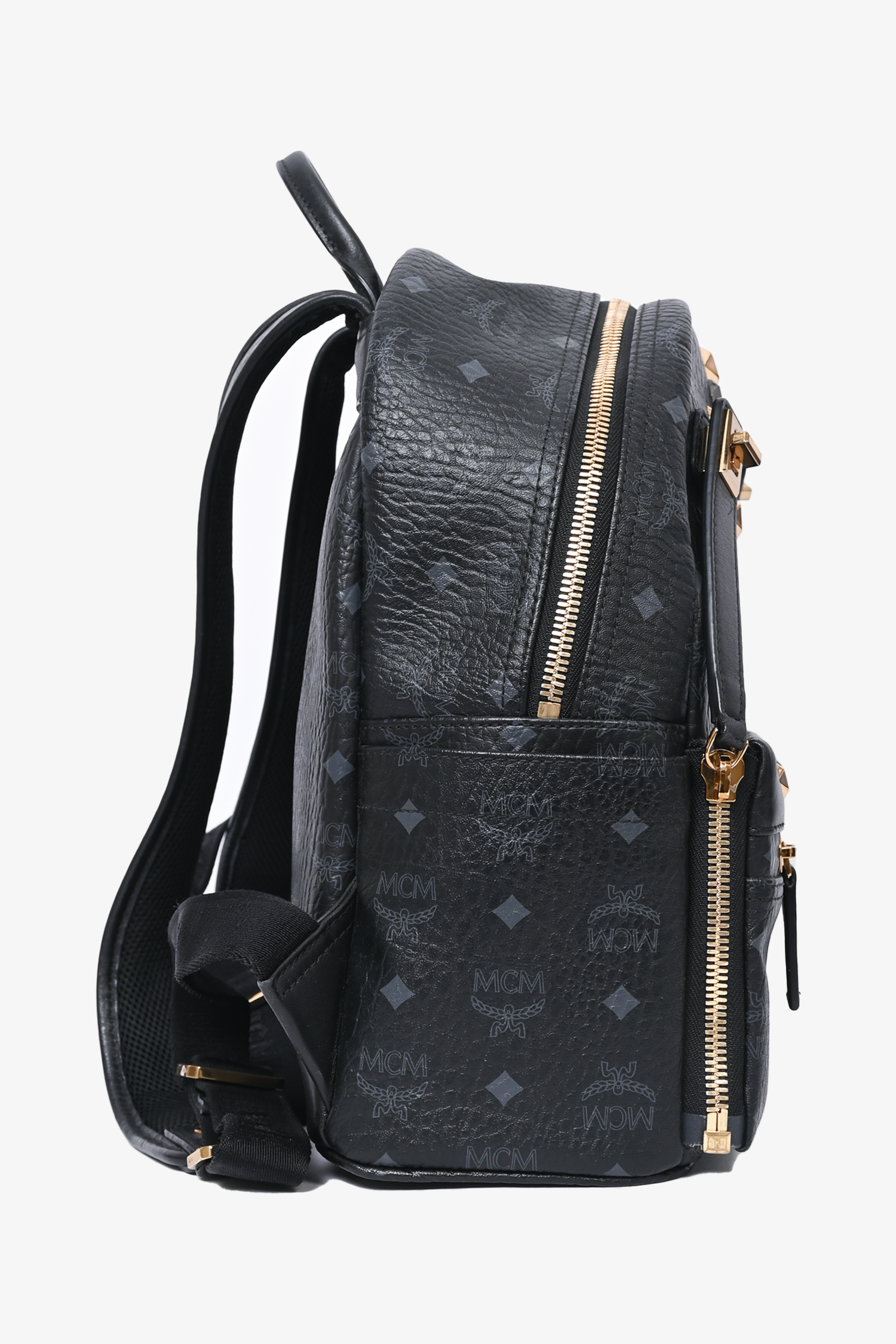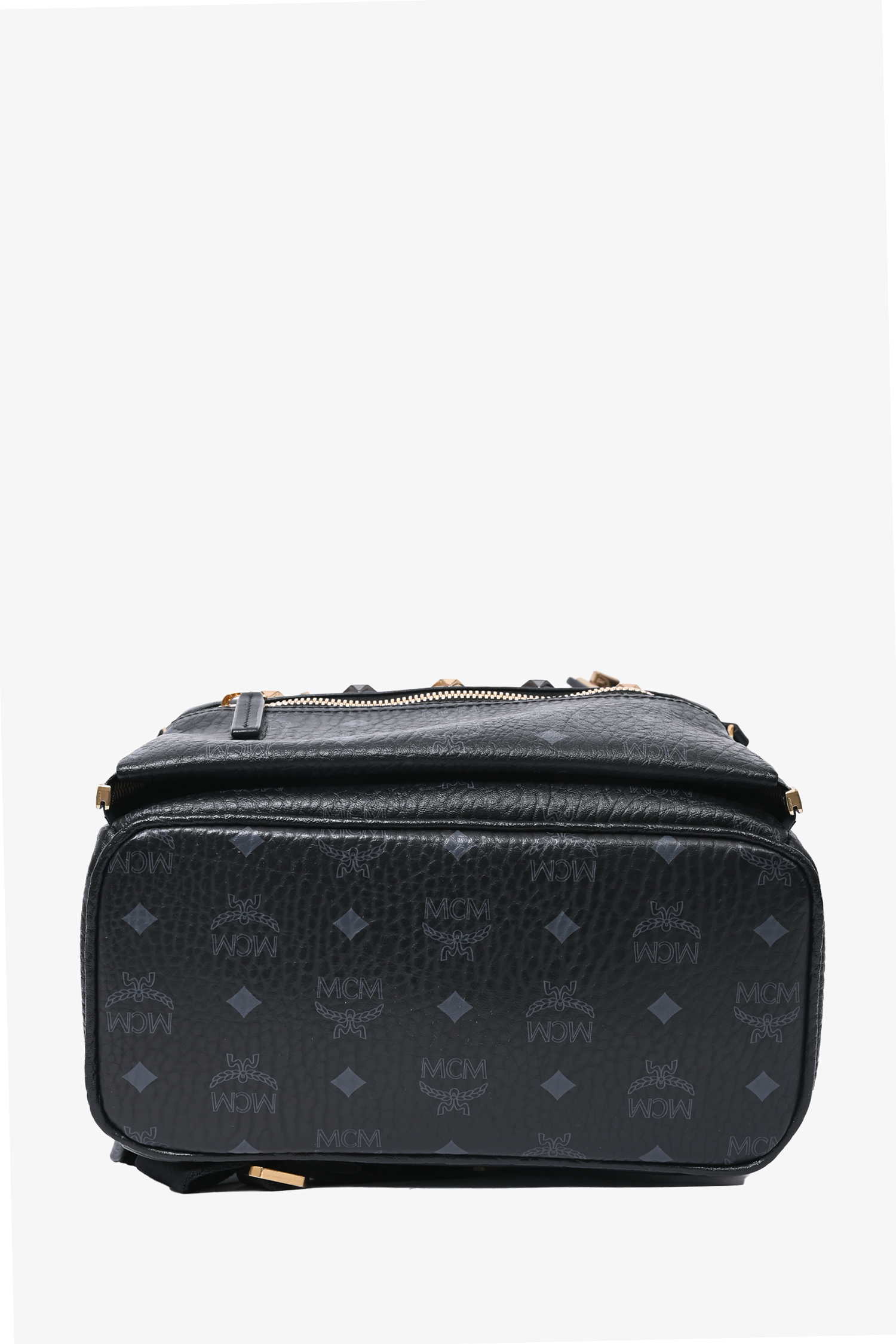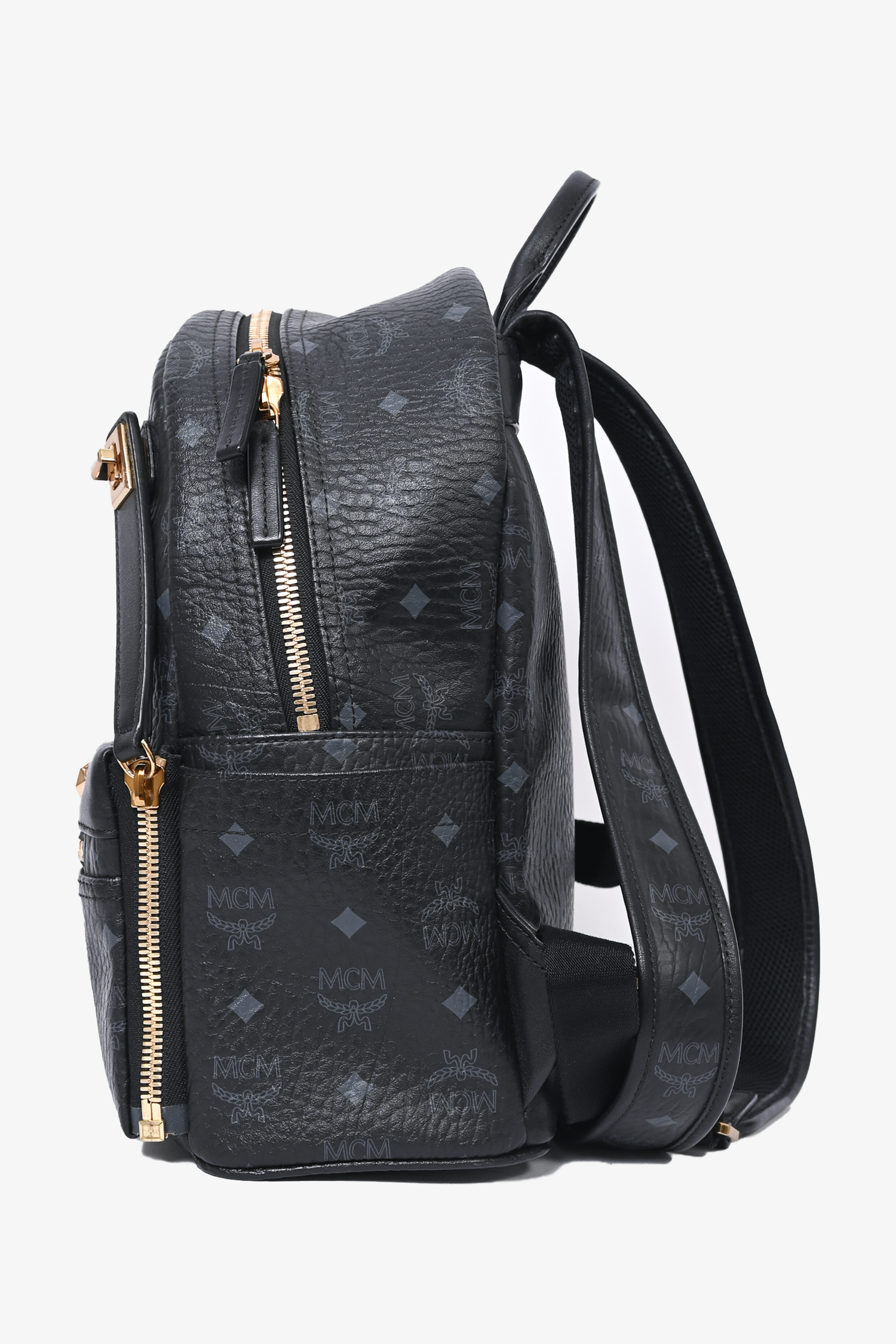 Refresh availabilityMCM Monogram Leather Backpack. Single top handle. Top zip closure. Adjustable backpack straps. 2 side slip pockets. 3 Front pocket; 1 zip, 1 slip, 1 slip with magnetic closure. Leather interior lining. 2 interior slip pockets. Gold and gunmetal-tone hardware. Removable front exterior pouch. Tonal stitching.