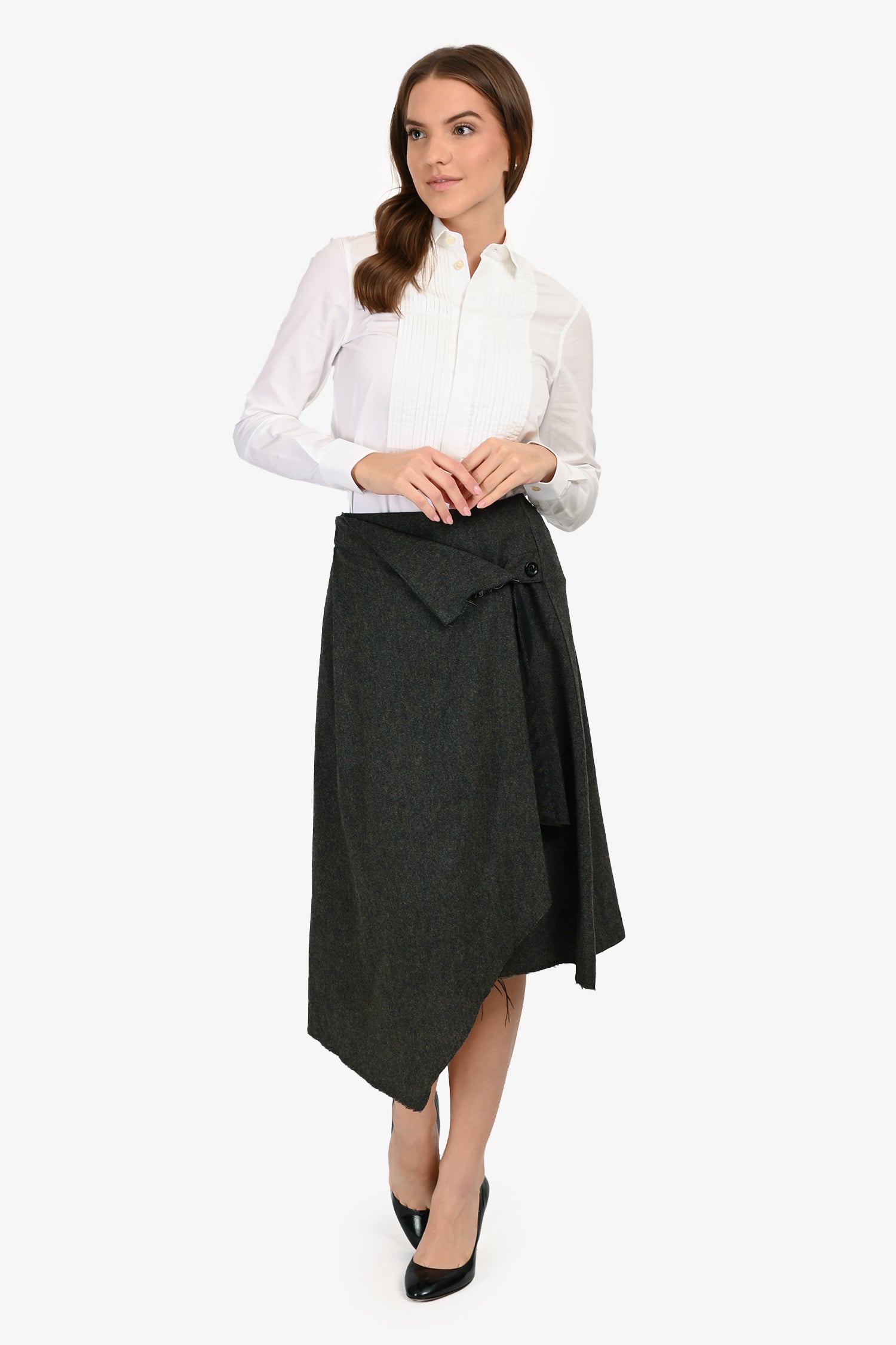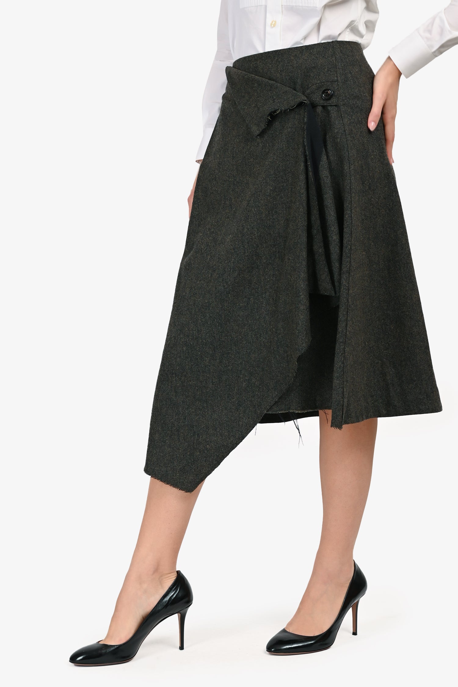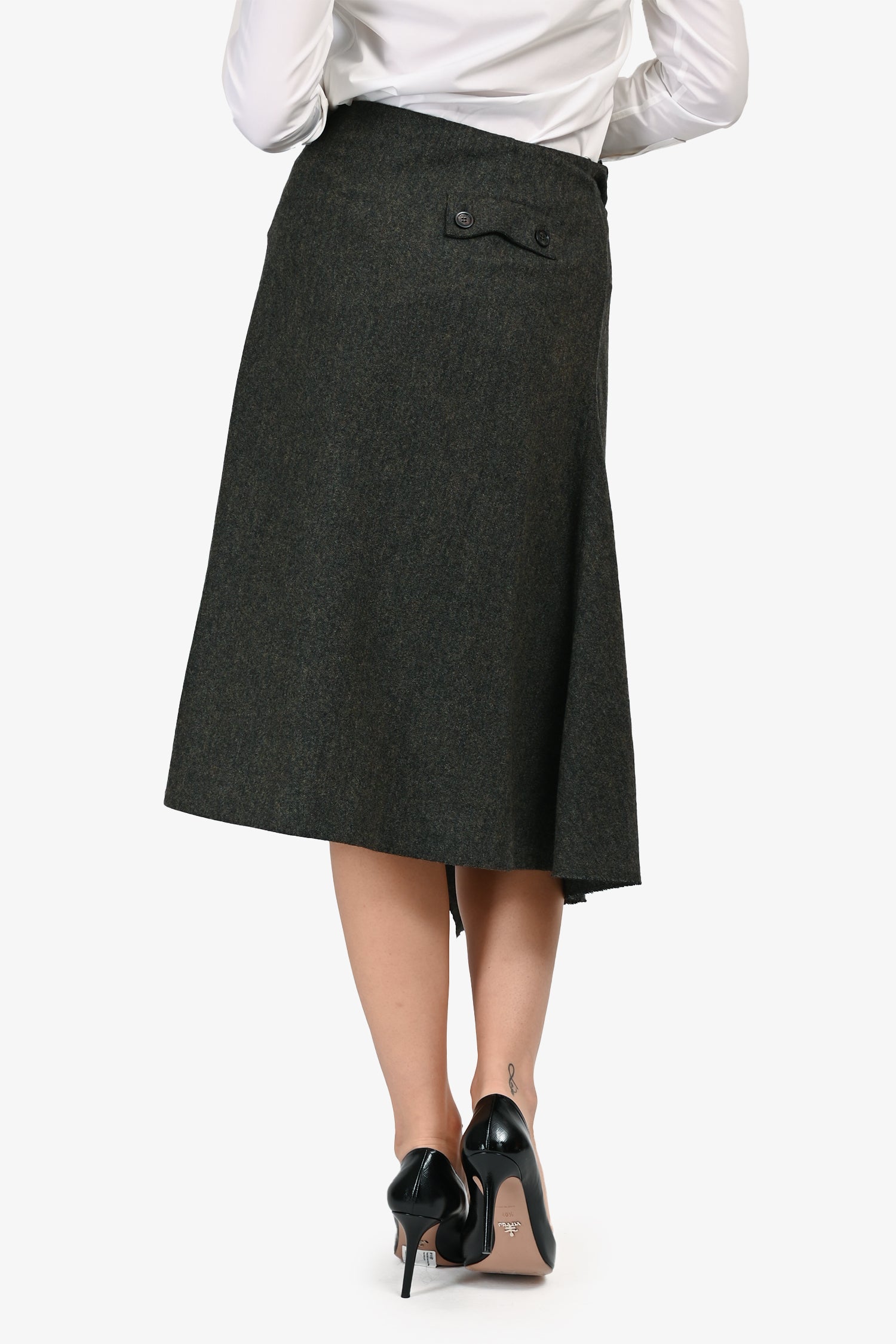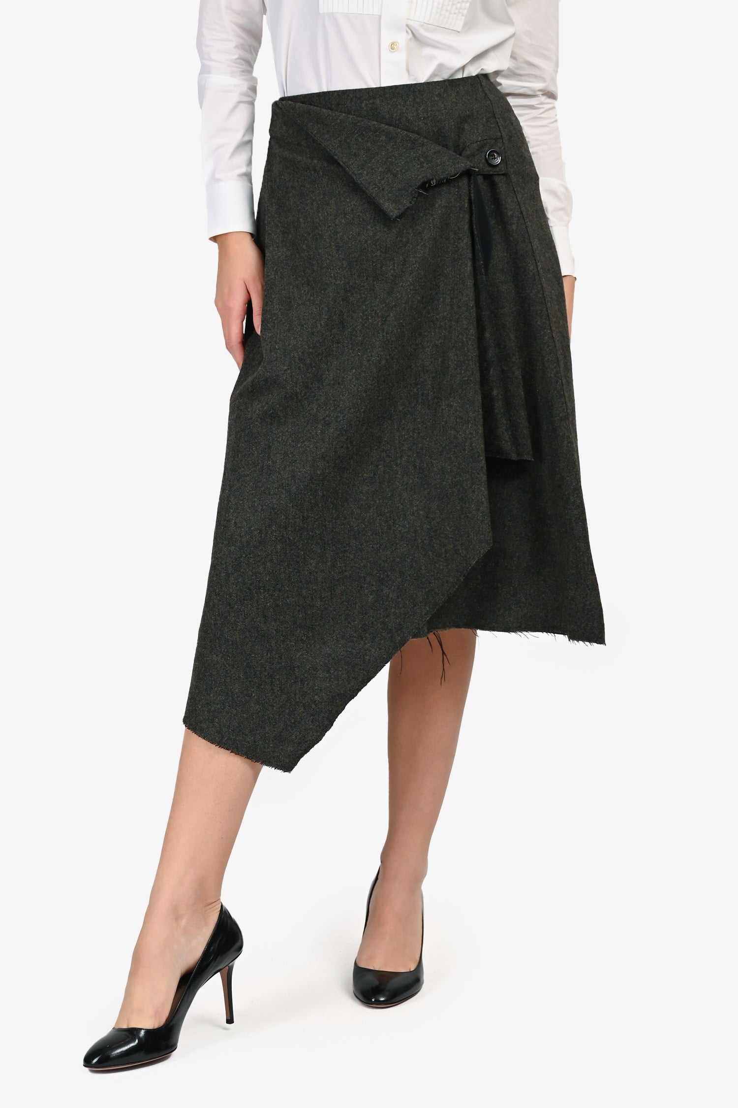 Refresh availabilityMCQ Alexander McQueen Grey Wool Asymmetrical Skirt. Pull-on. Single asymmetrical front button closure. Rear slip pocket with button closure. Raw bottom edge detail. Tonal stitching.