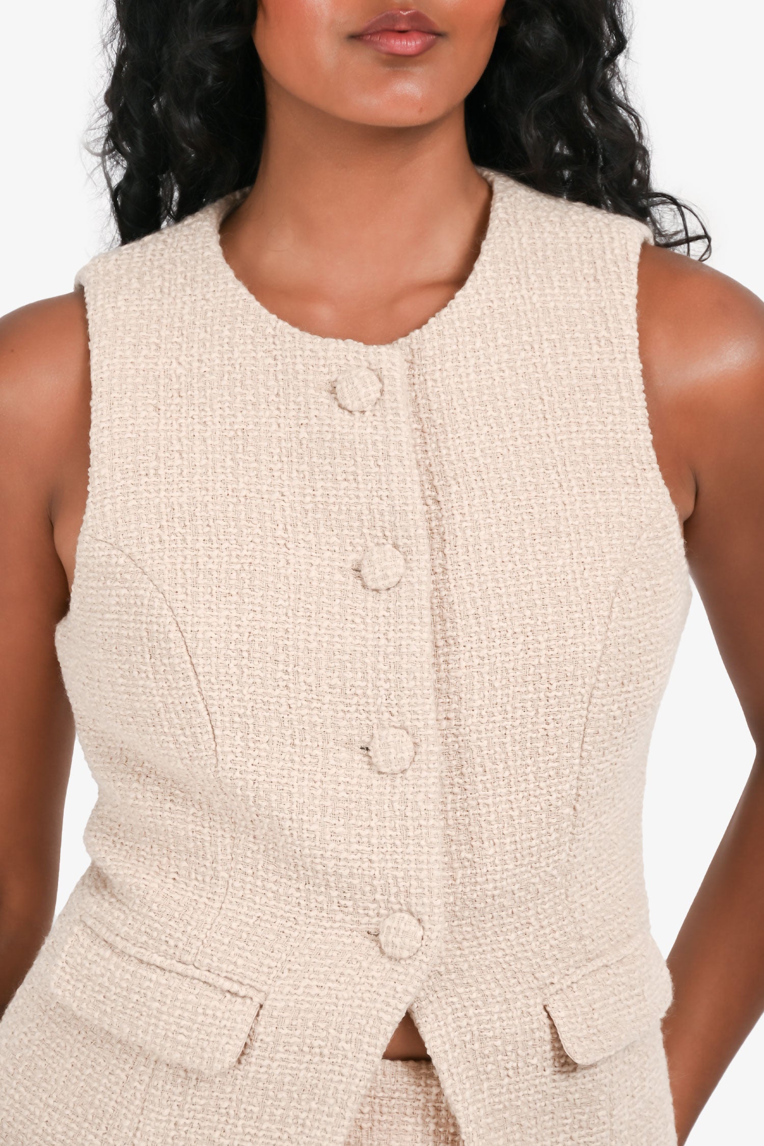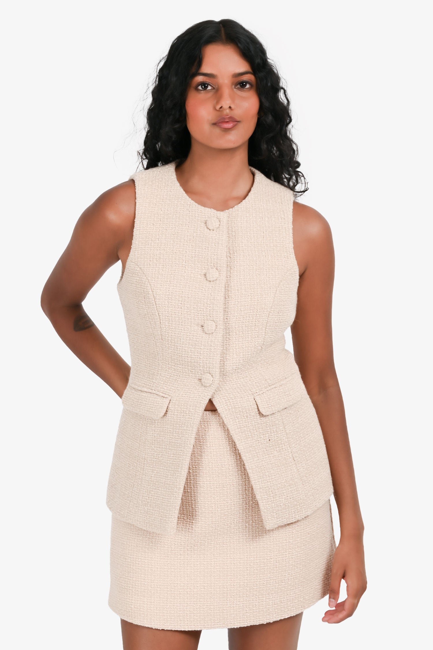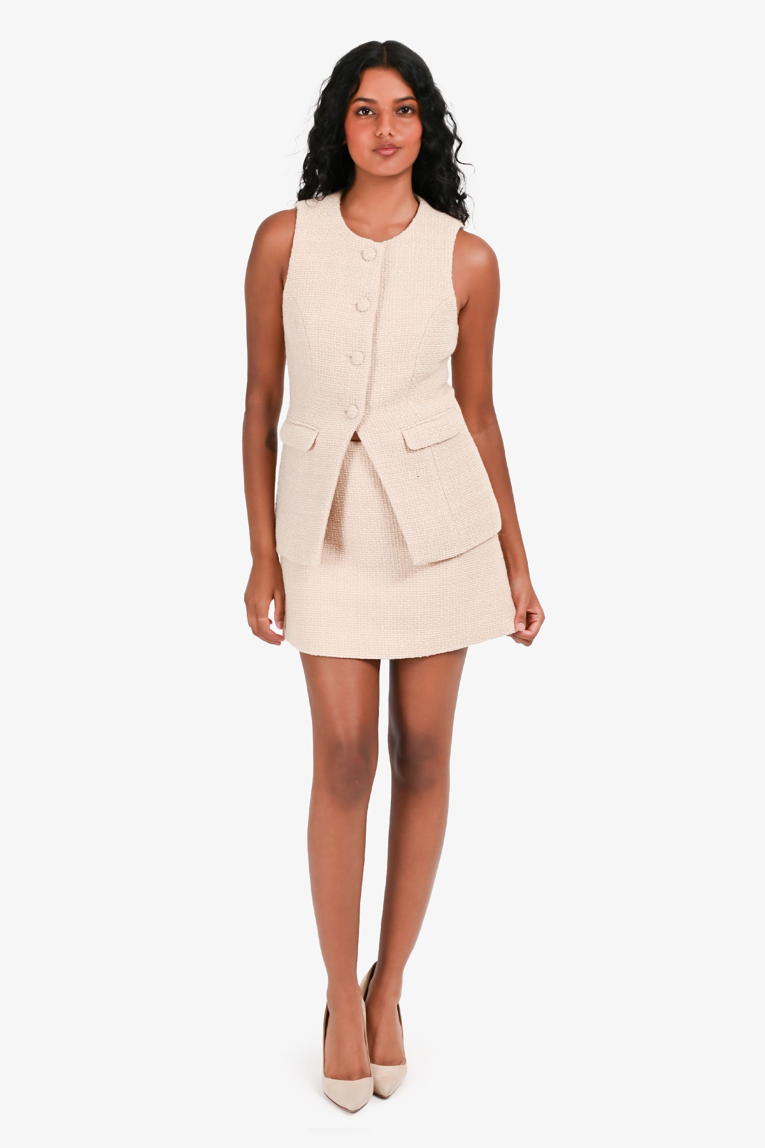 Refresh availabilityMeshki Beige 'Camilla' Tweed Vest + Mini Skirt Set. Structured sleeveless vest with V-neckline and front button closure. Matching mini skirt with fitted waistband and concealed back zip closure. Fully lined. Tonal stitching.