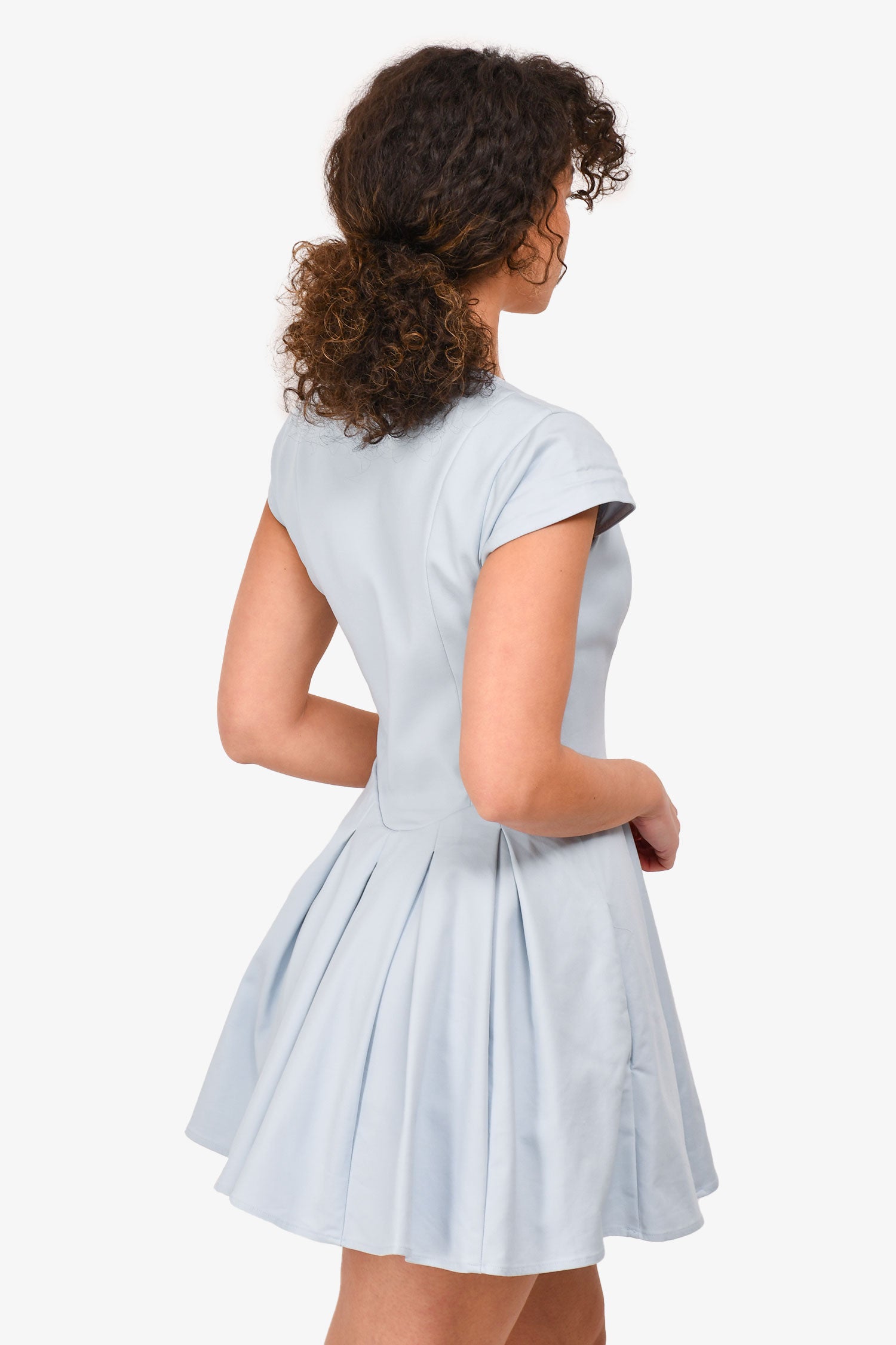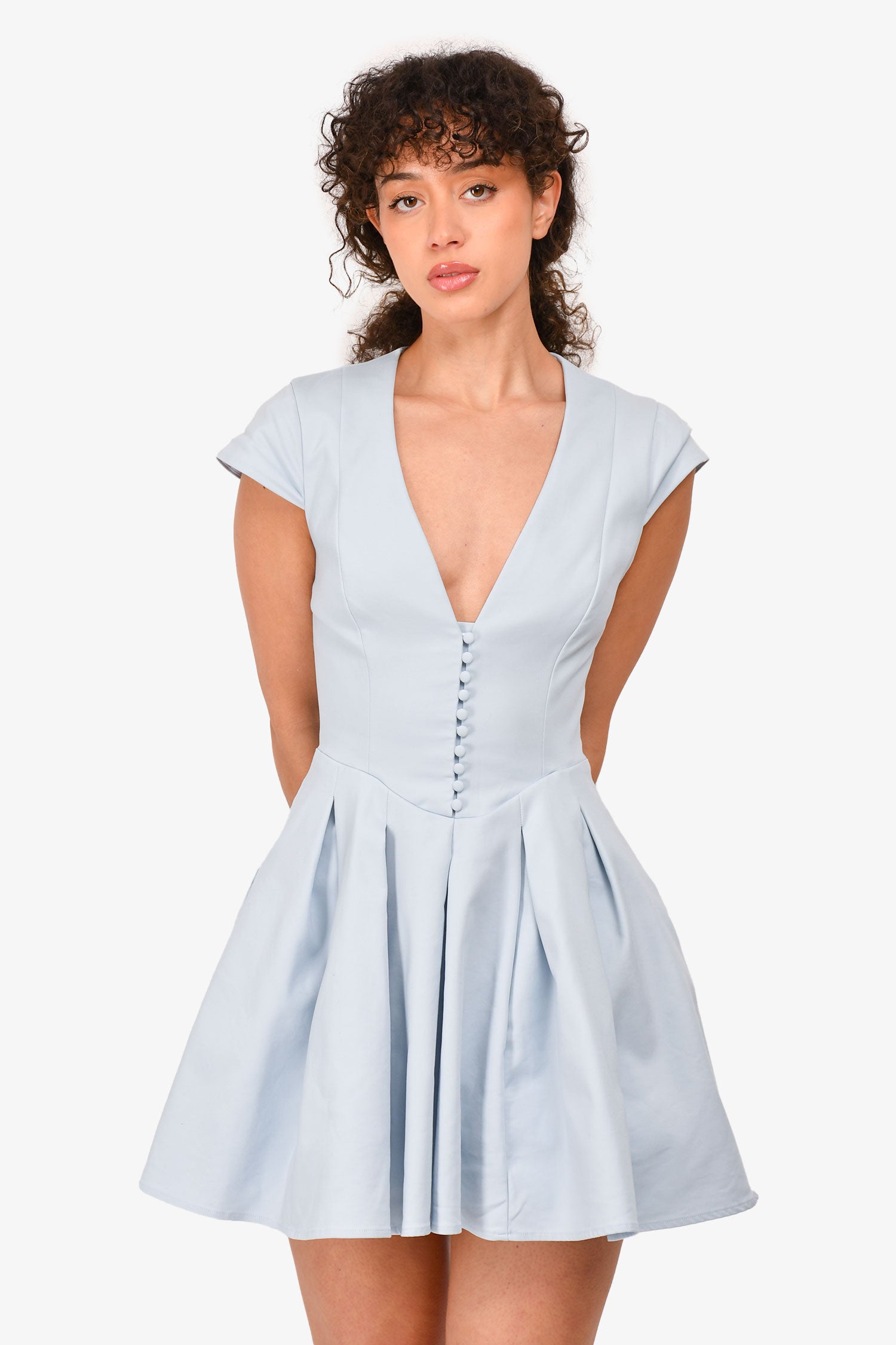 Refresh availabilityMeshki Light Blue Cotton Keely Mini Dress. Covered front fabric button with loop. Double lined interior, 1 lightweight cotton and 1 mesh. Tonal stitching.