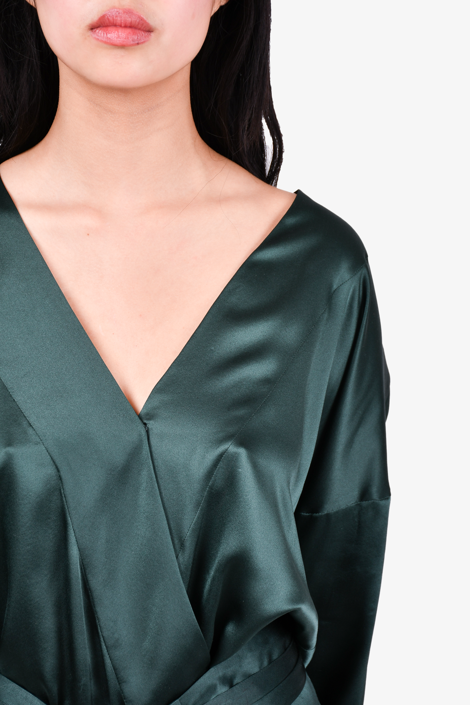 Refresh availabilityMichelle Mason Green Silk Bodysuit + Pant Set. Front zipper and hook detail with tie belt. Side pockets. Snap bottom closure. Tonal stitching.