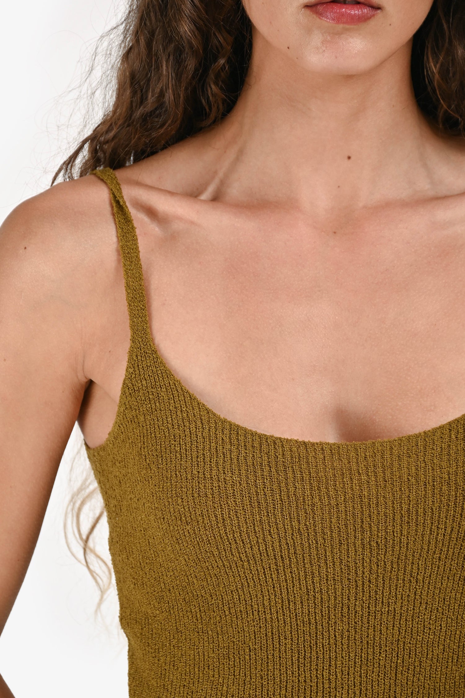 Refresh availabilityMijeong Park Army Green Boucle Knit Tank Top. Scoop neckline. Sleeveless design. Soft textured bouclé knit fabric. Fitted silhouette. Pull-on style. Tonal stitching.