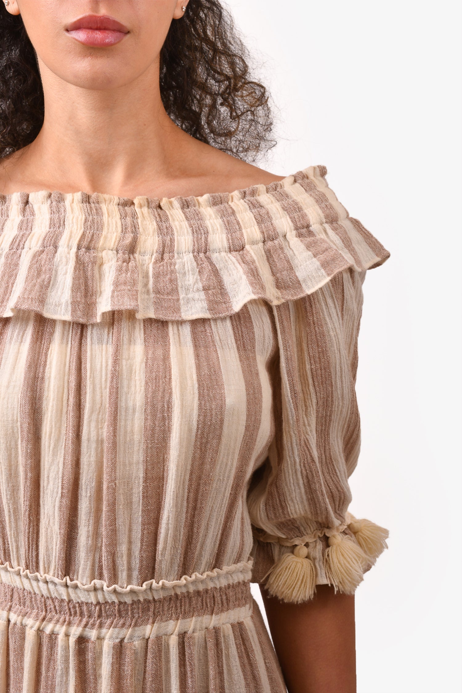 Refresh availabilityMISA Los Angeles Beige/White Stripe Maxi Dress with Fringe Detail. Elasticated off-the-shoulder style neckline. Tassel detail. Elasticated waistband. Tonal stitching.