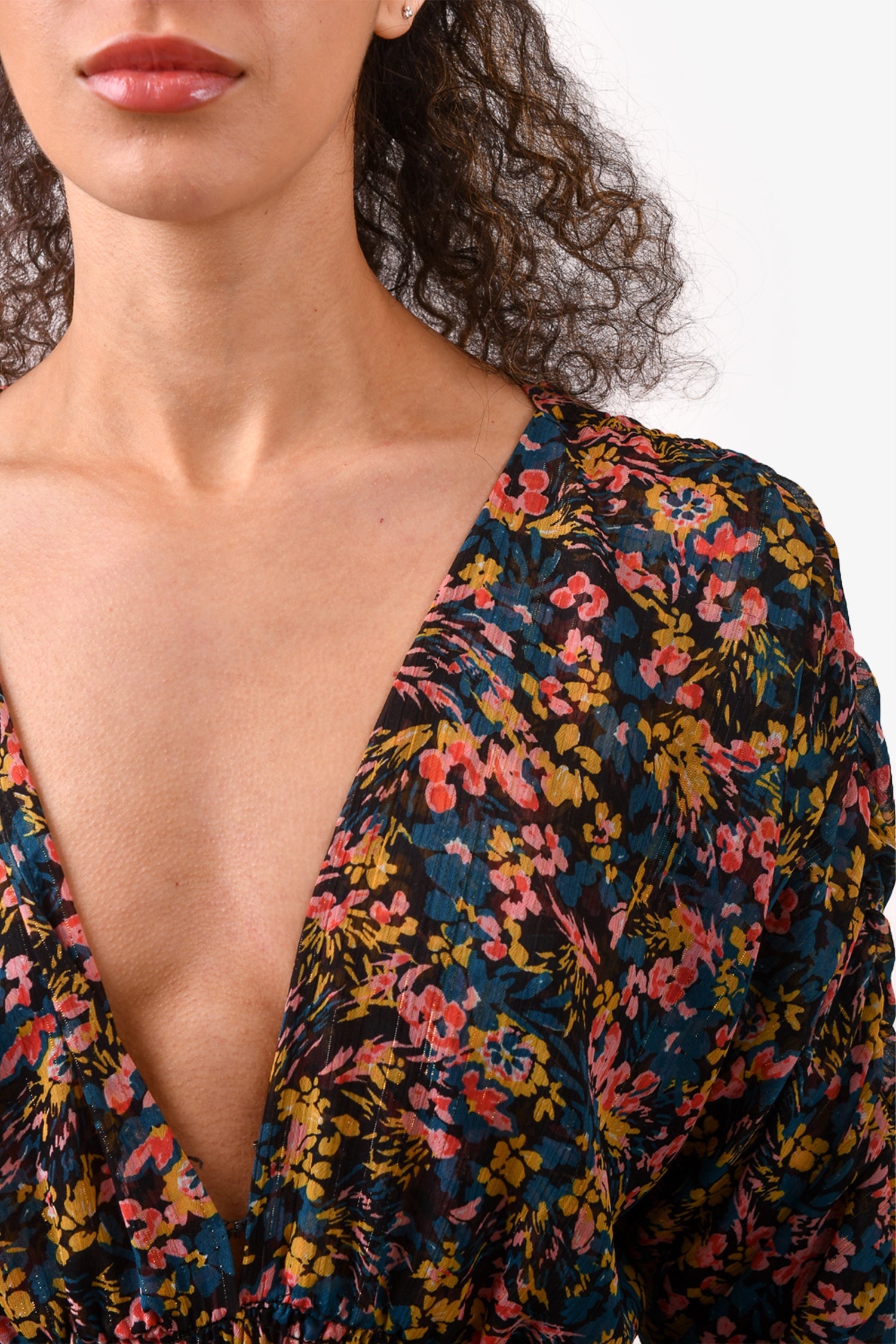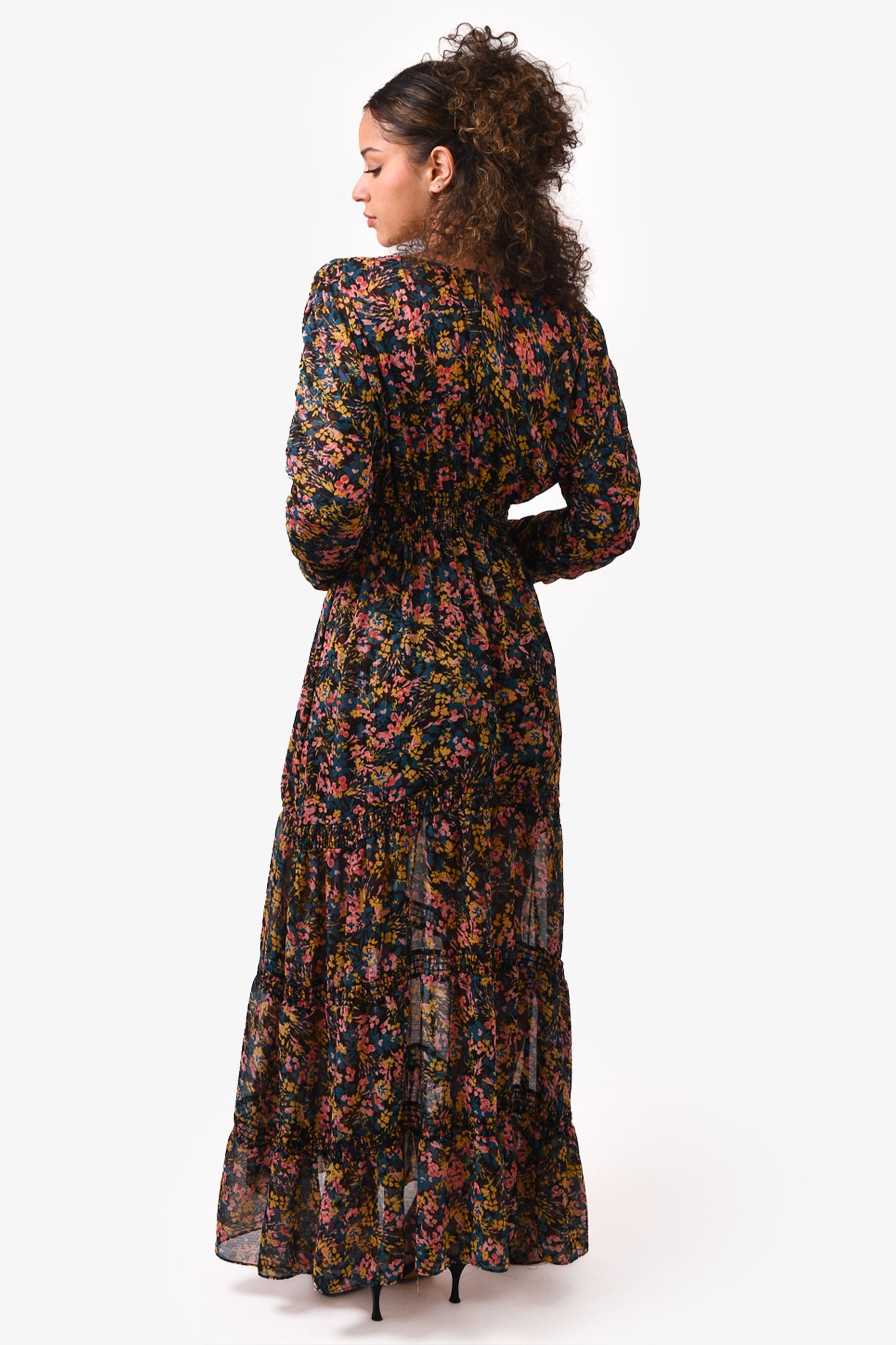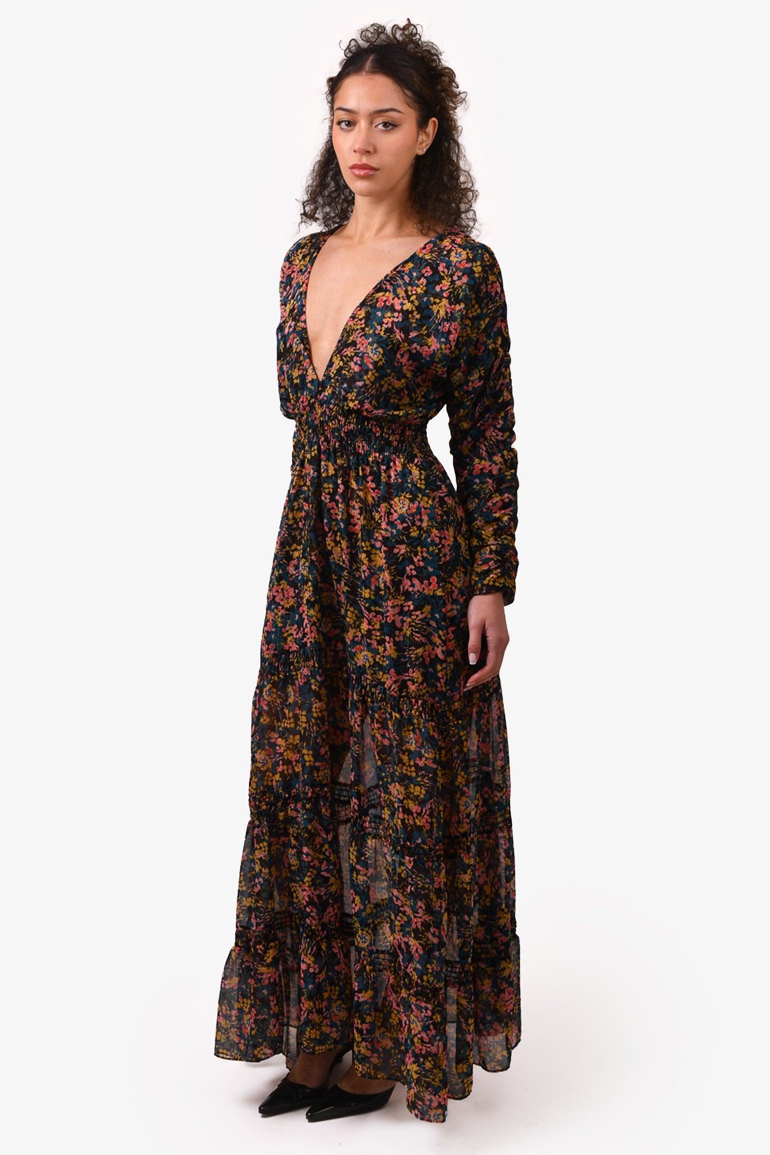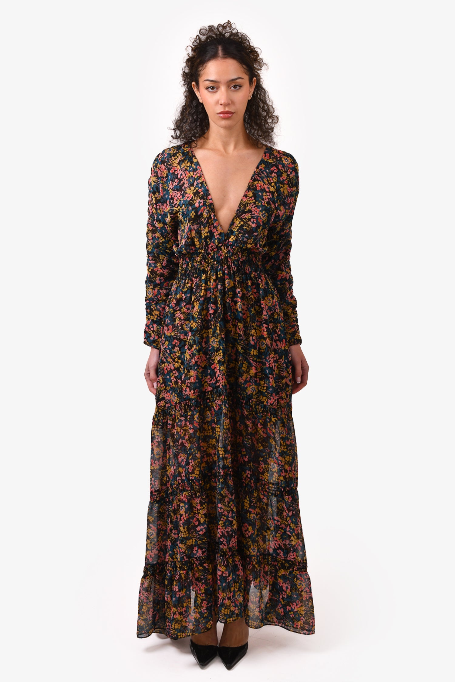 Refresh availabilityMISA Los Angeles Teal/Yellow Floral Print Maxi Dress with Ruched Sleeves. V-neckline. Elasticated waist. Tiered skirt. Tonal stitching.