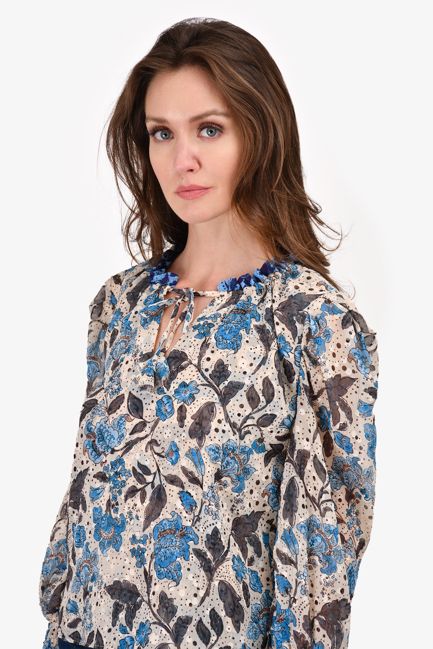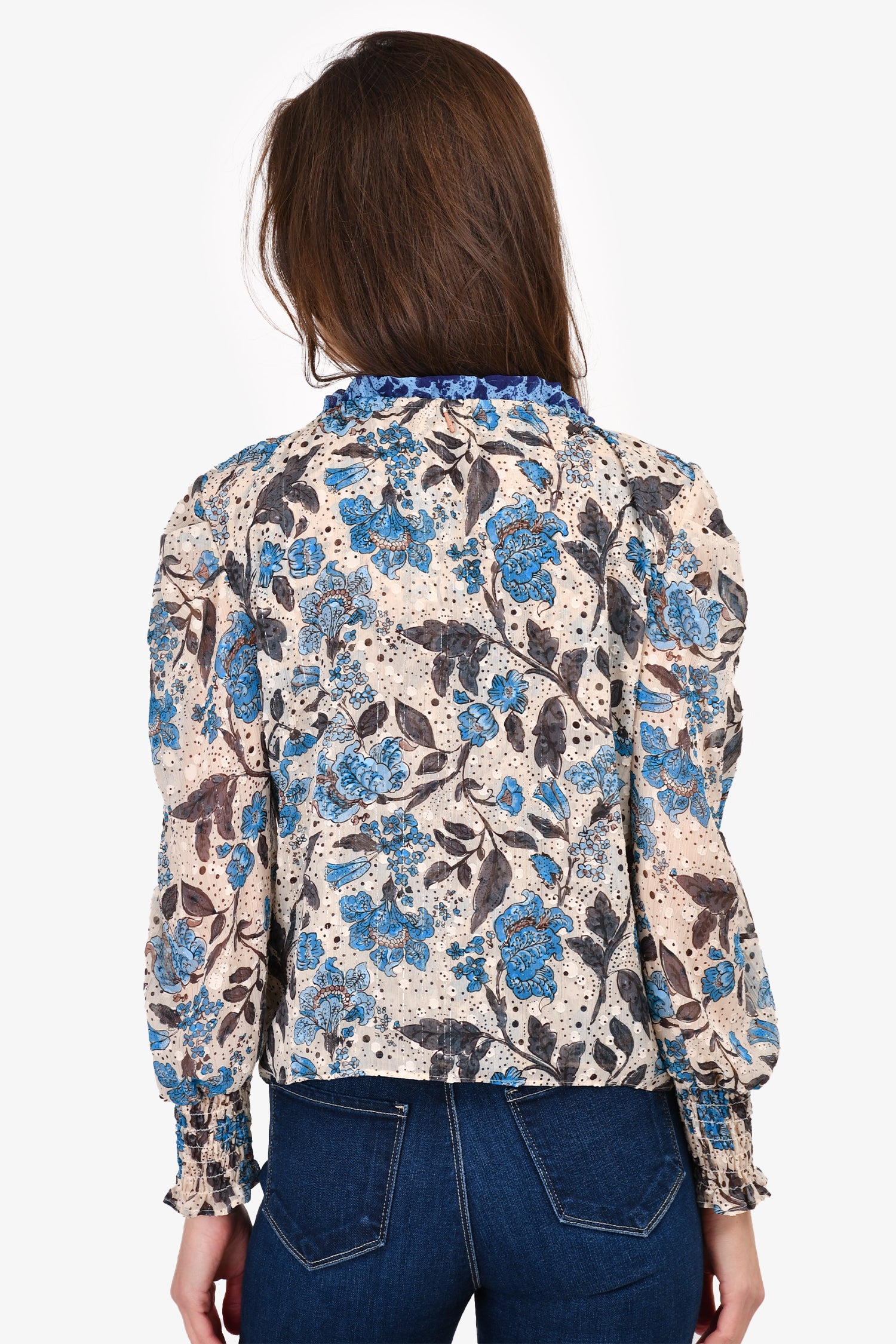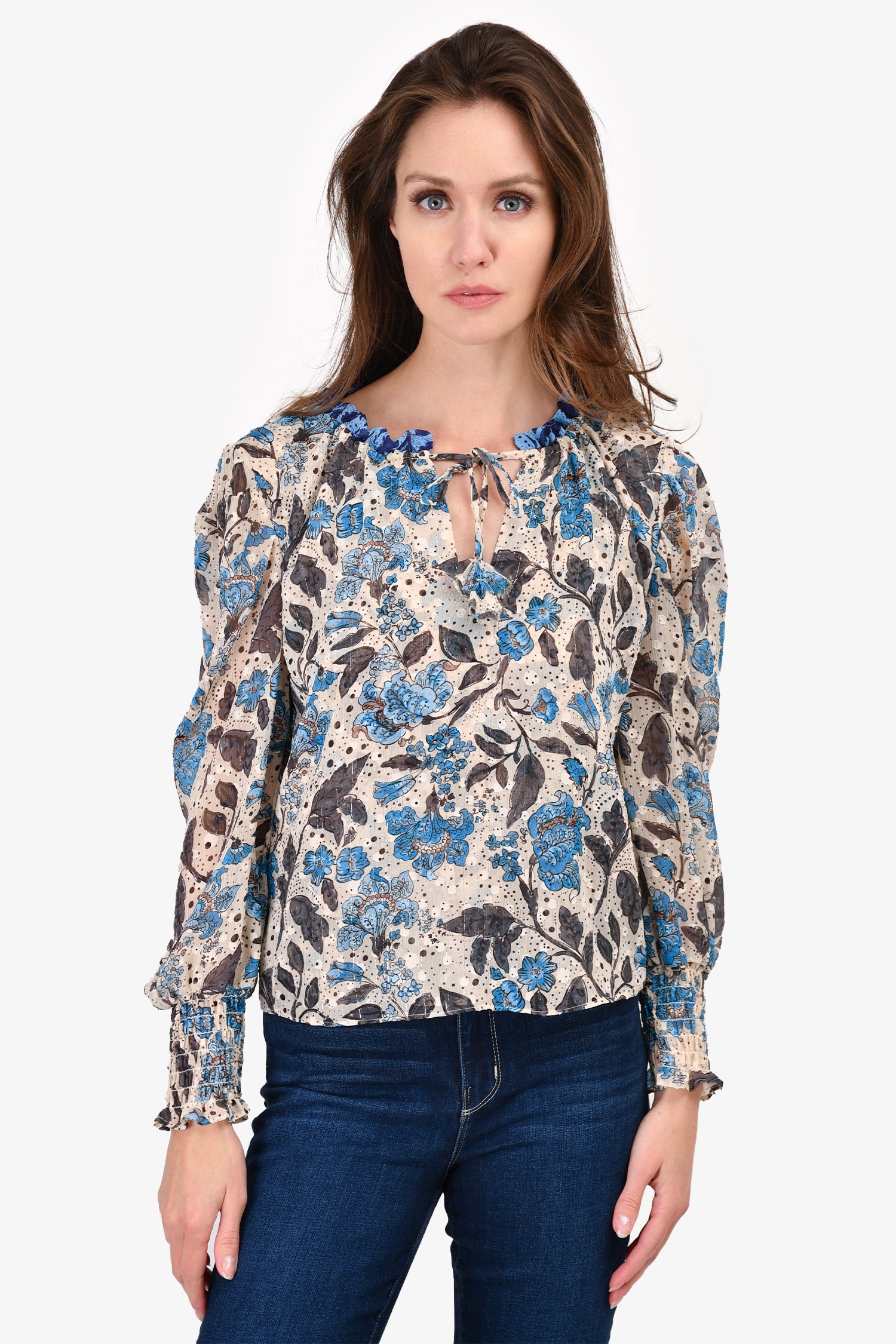 Refresh availabilityMisa Los Angeles White/Blue Floral Printed Blouse. Tie-up closure on the neckline. Elasticized cuffs. Pull-on.