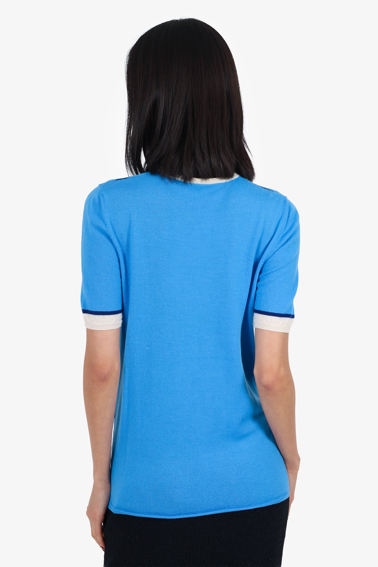 Miu Miu 2018 Blue Wool Striped Red Logo Short Sleeve Sweater Size 44