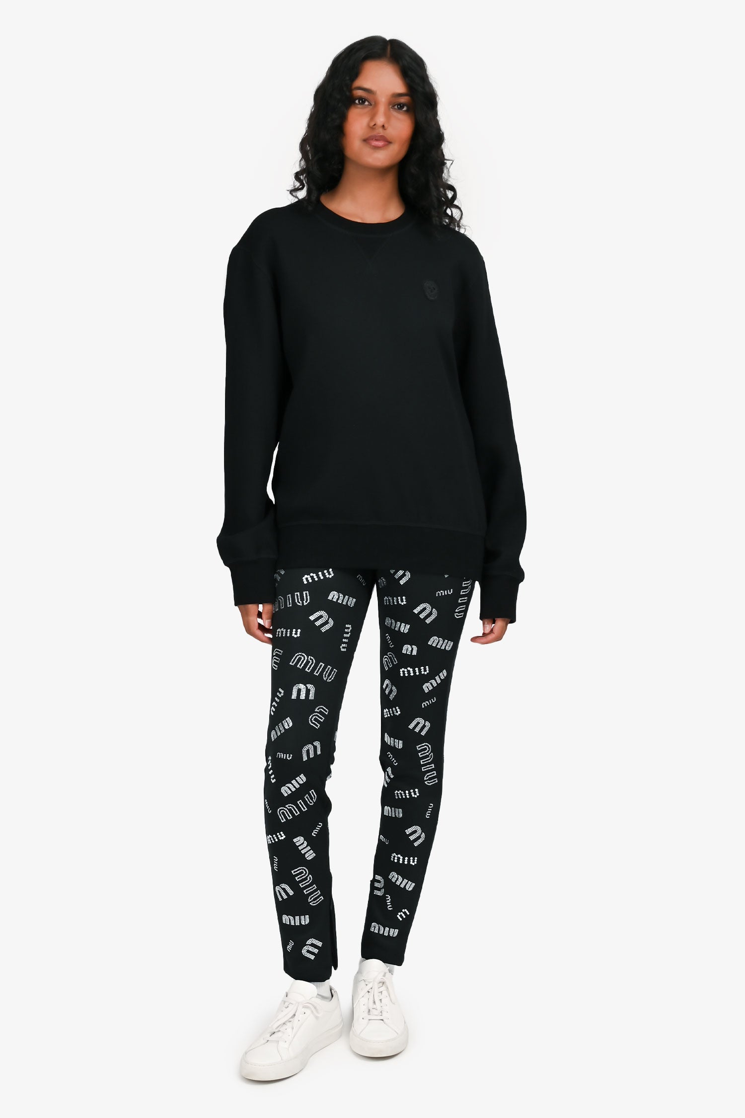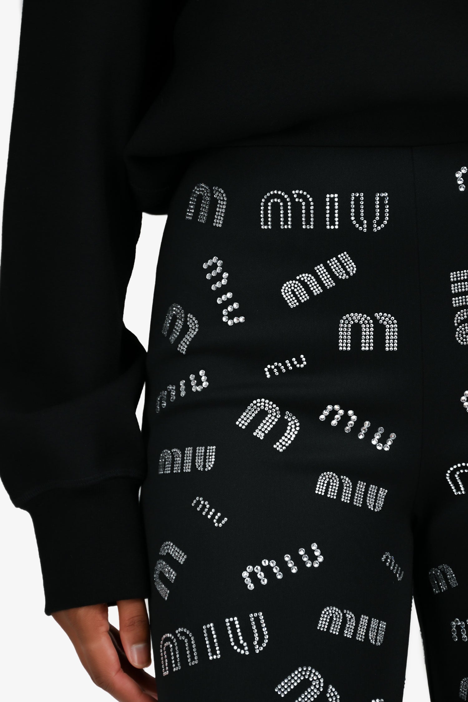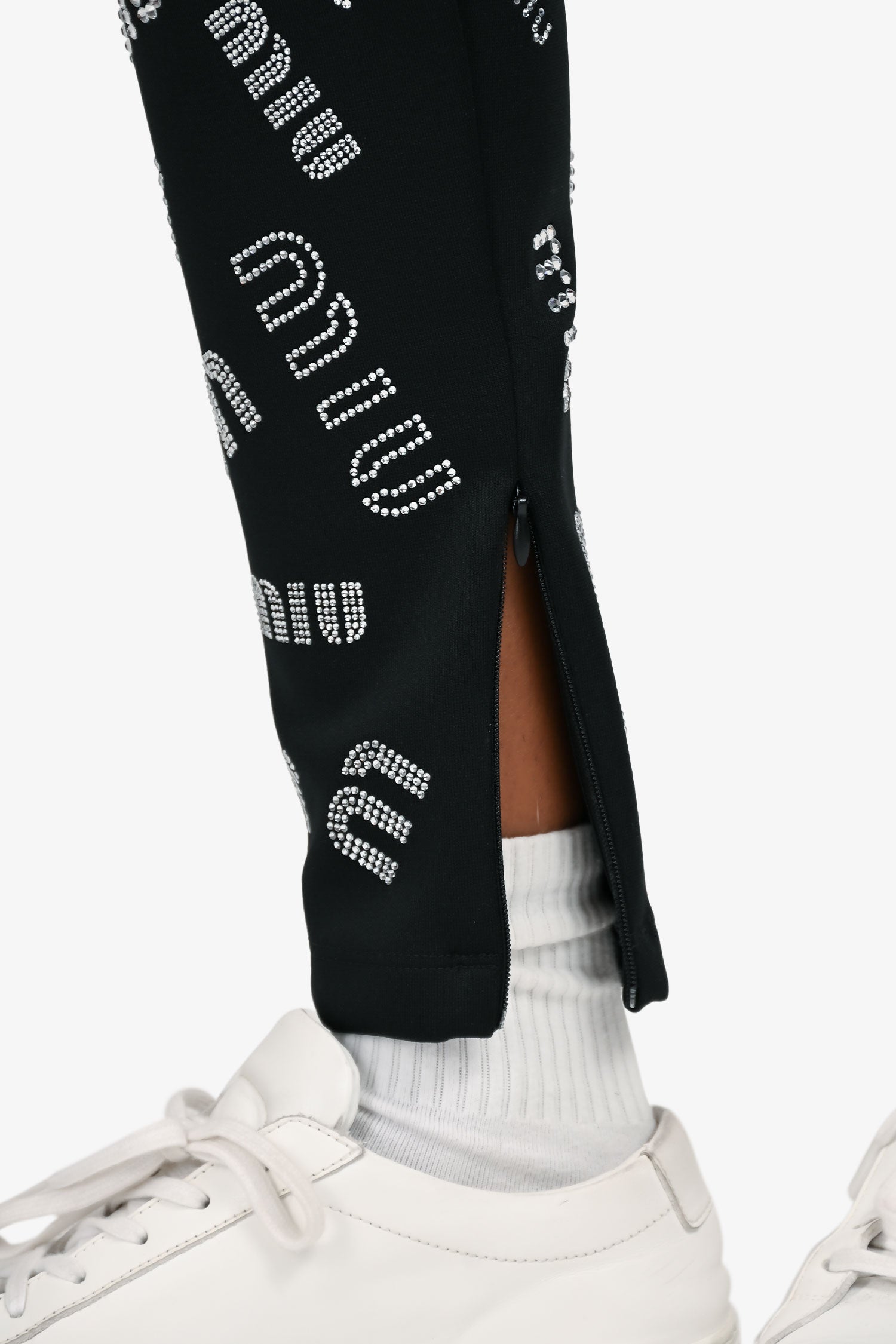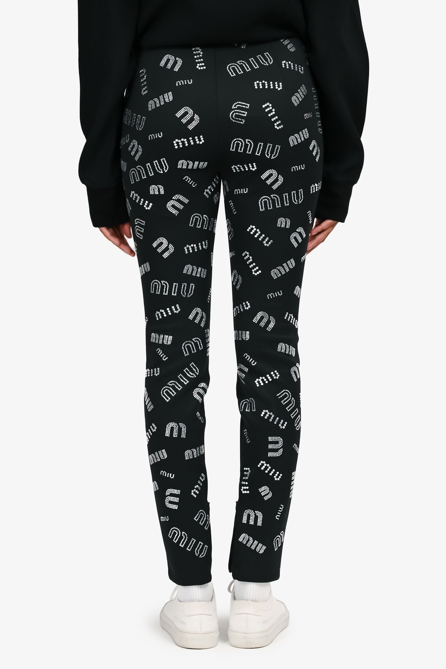 Refresh availabilityMiu Miu 2019 Black Crystal Embellished Logo Leggings. Elastic waistband. Pull-on style. Zipped cuffs. Tonal stitching.