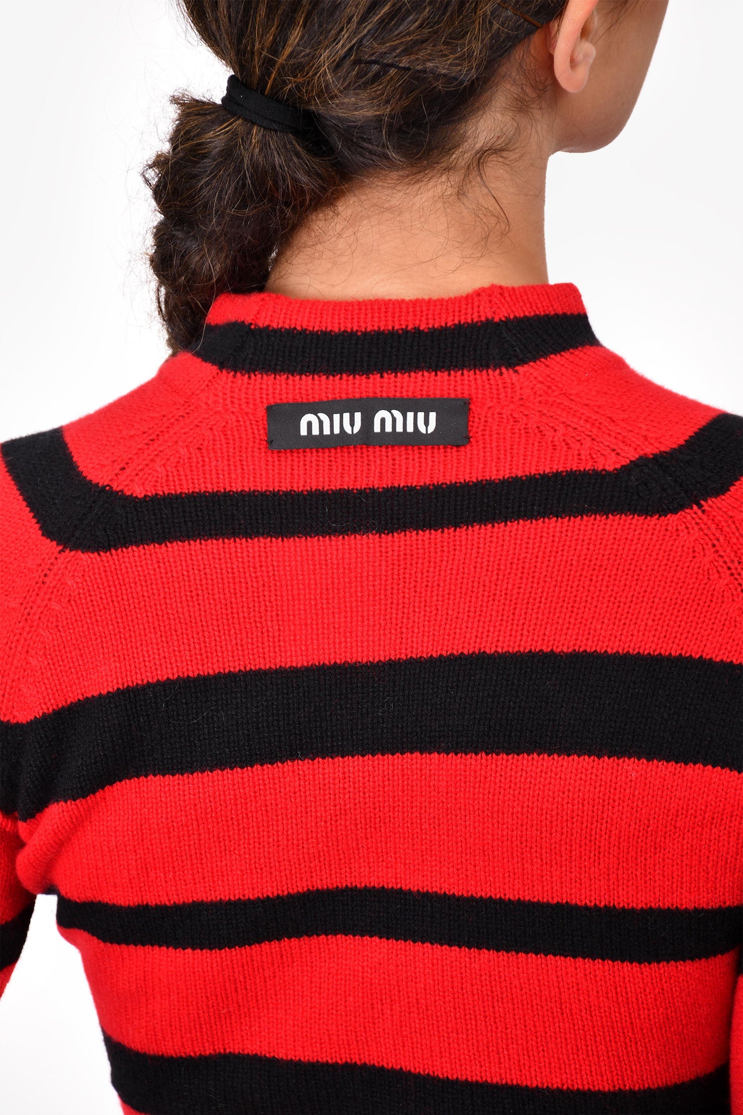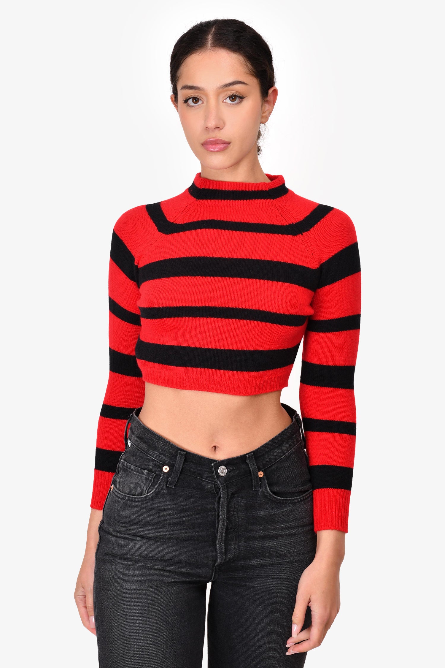 Refresh availabilityMiu Miu 2019 Red & Black Cashmere Striped Cropped Top. Quarter sleeve. Ribbed at the hem and sleeves. Tonal stitching.