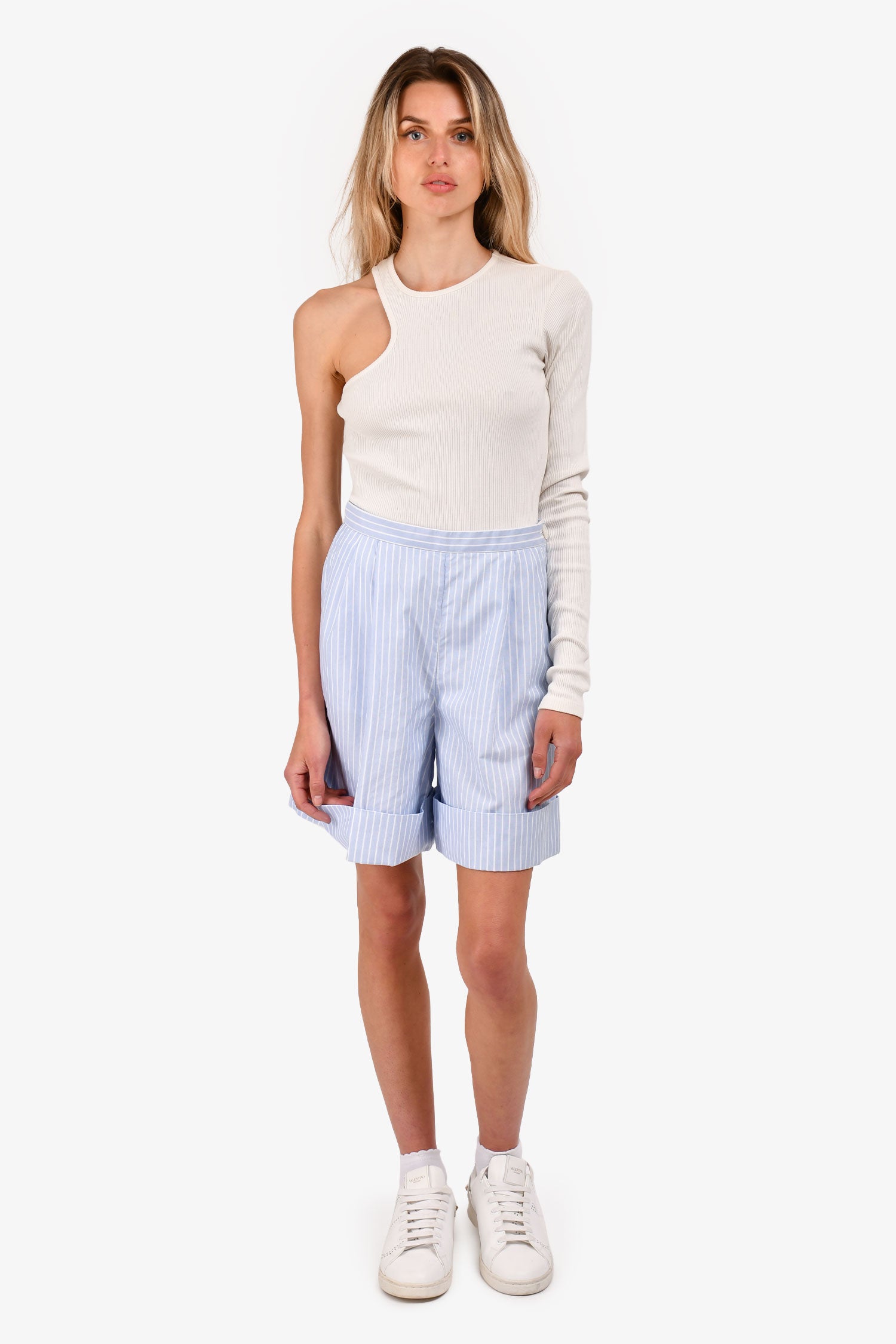 Refresh availabilityMiu Miu 2020 Light Blue Striped Cotton Cuffed Shorts. High-rise waist. Cuffed hems. Side pockets and back welt pockets. Side YKK zip fly with button closure. Tonal stitching.