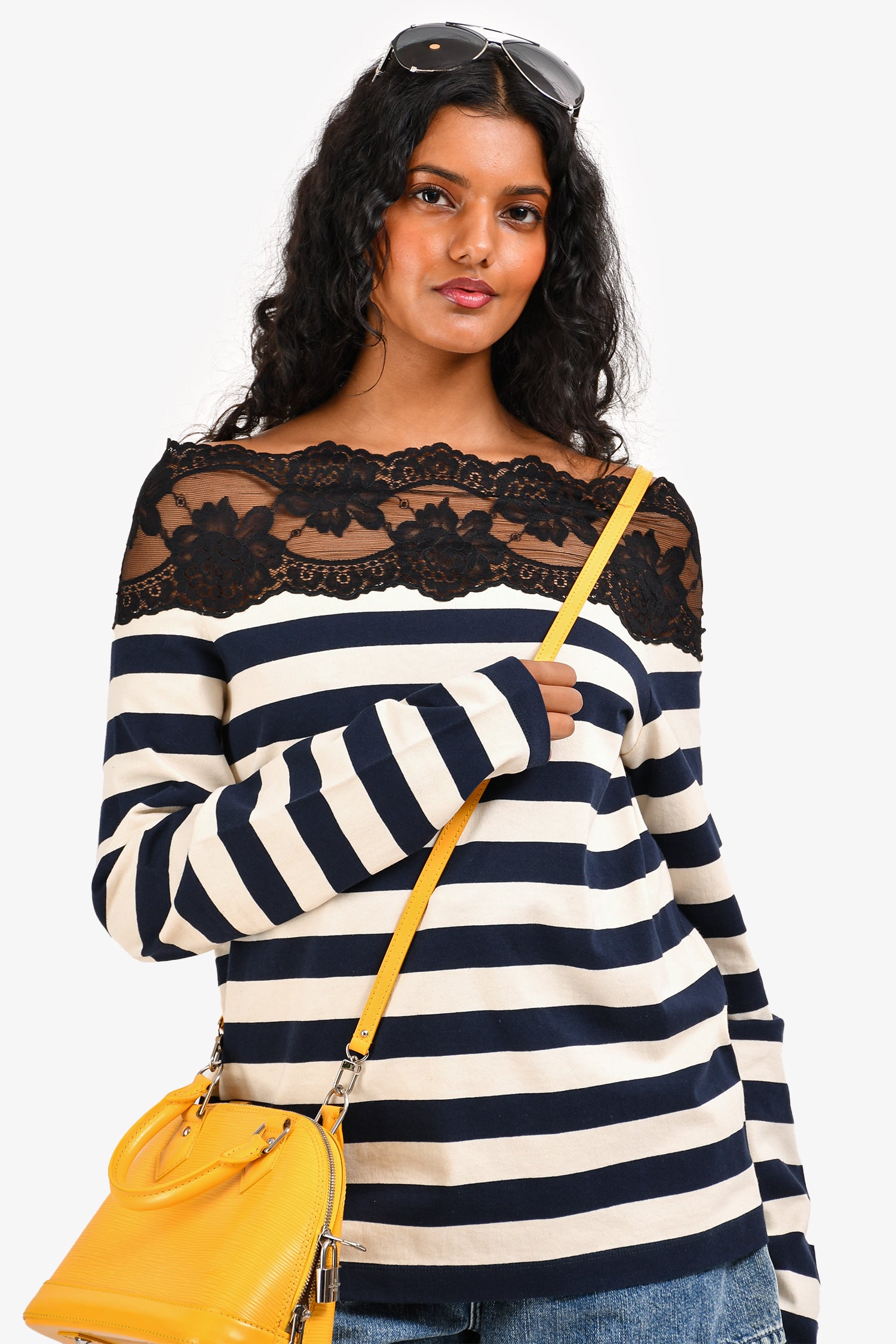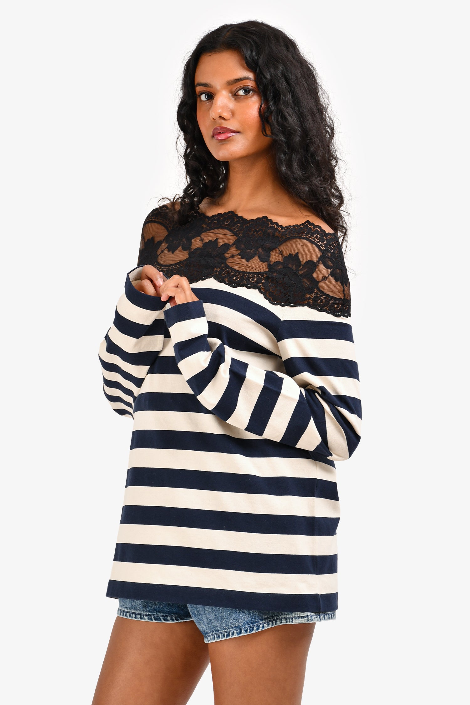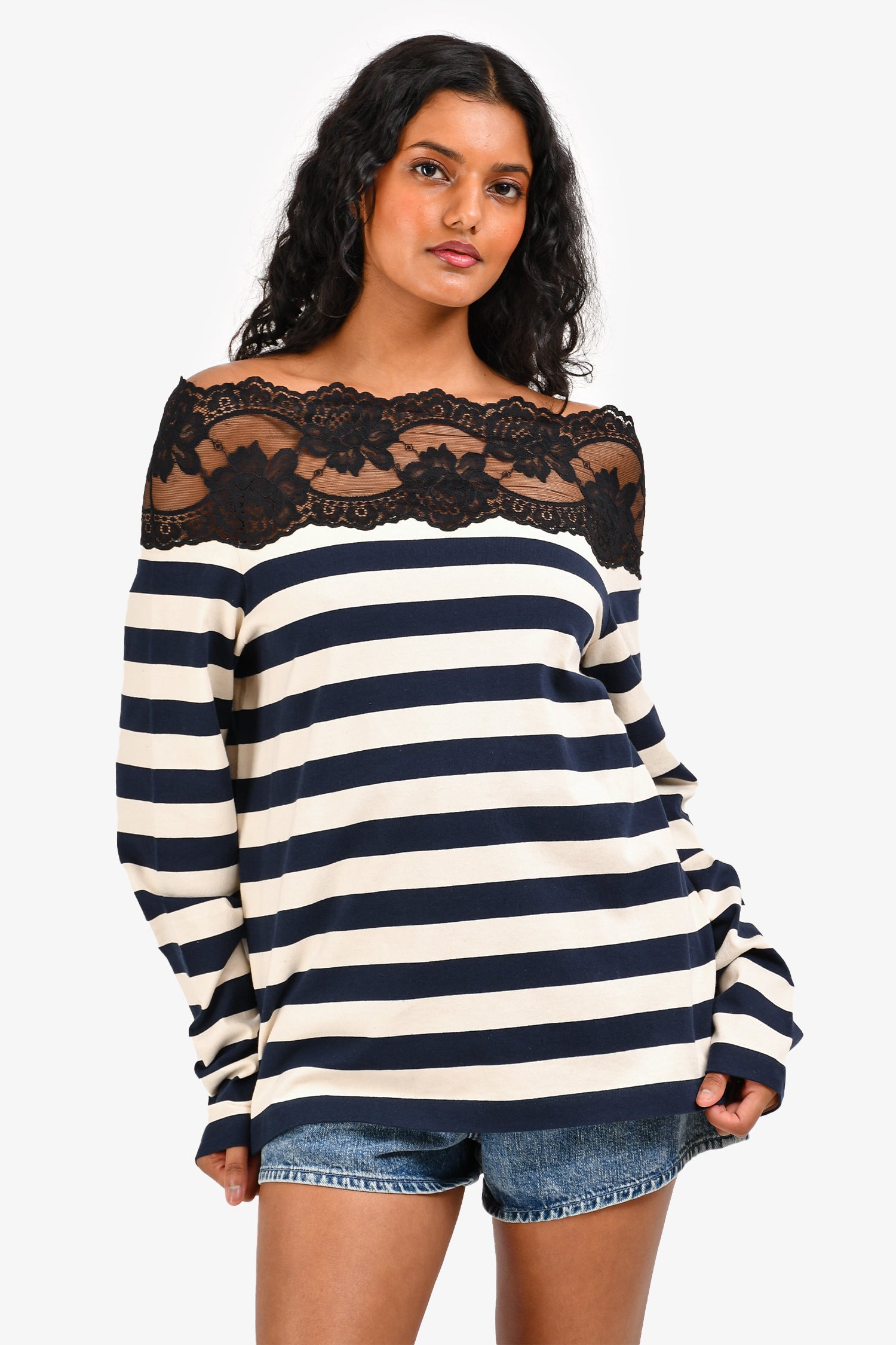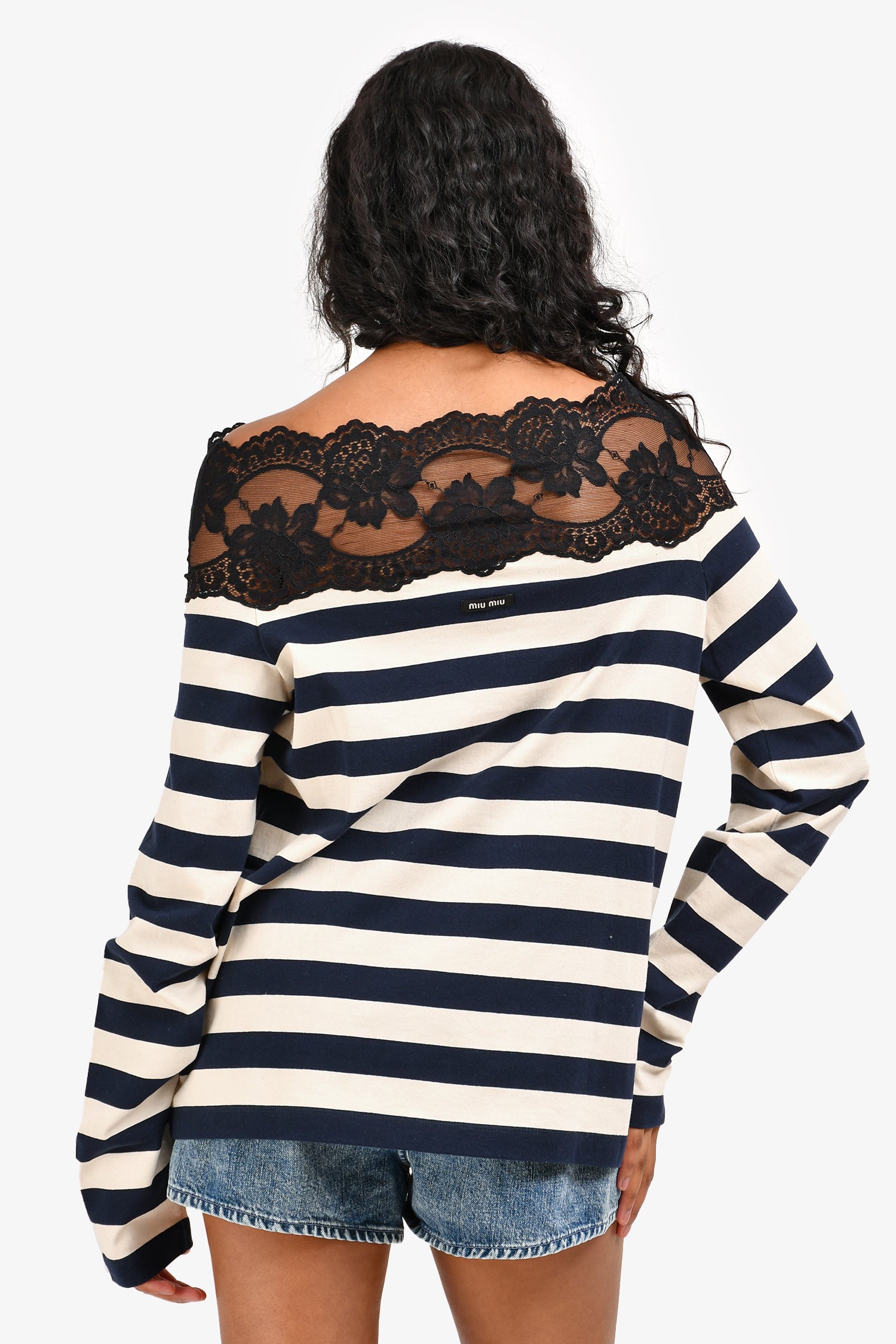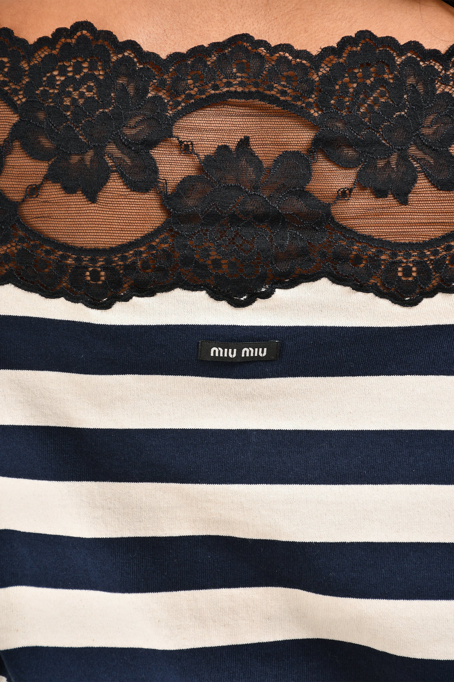 Refresh availabilityMiu Miu 2020 Navy Cream Striped Lace Detailed Off Shoulder Long Sleeve Top. Long sleeves. Tonal stitching.