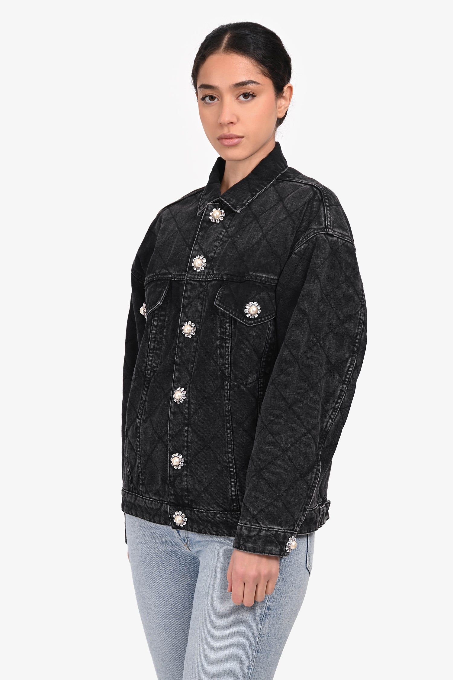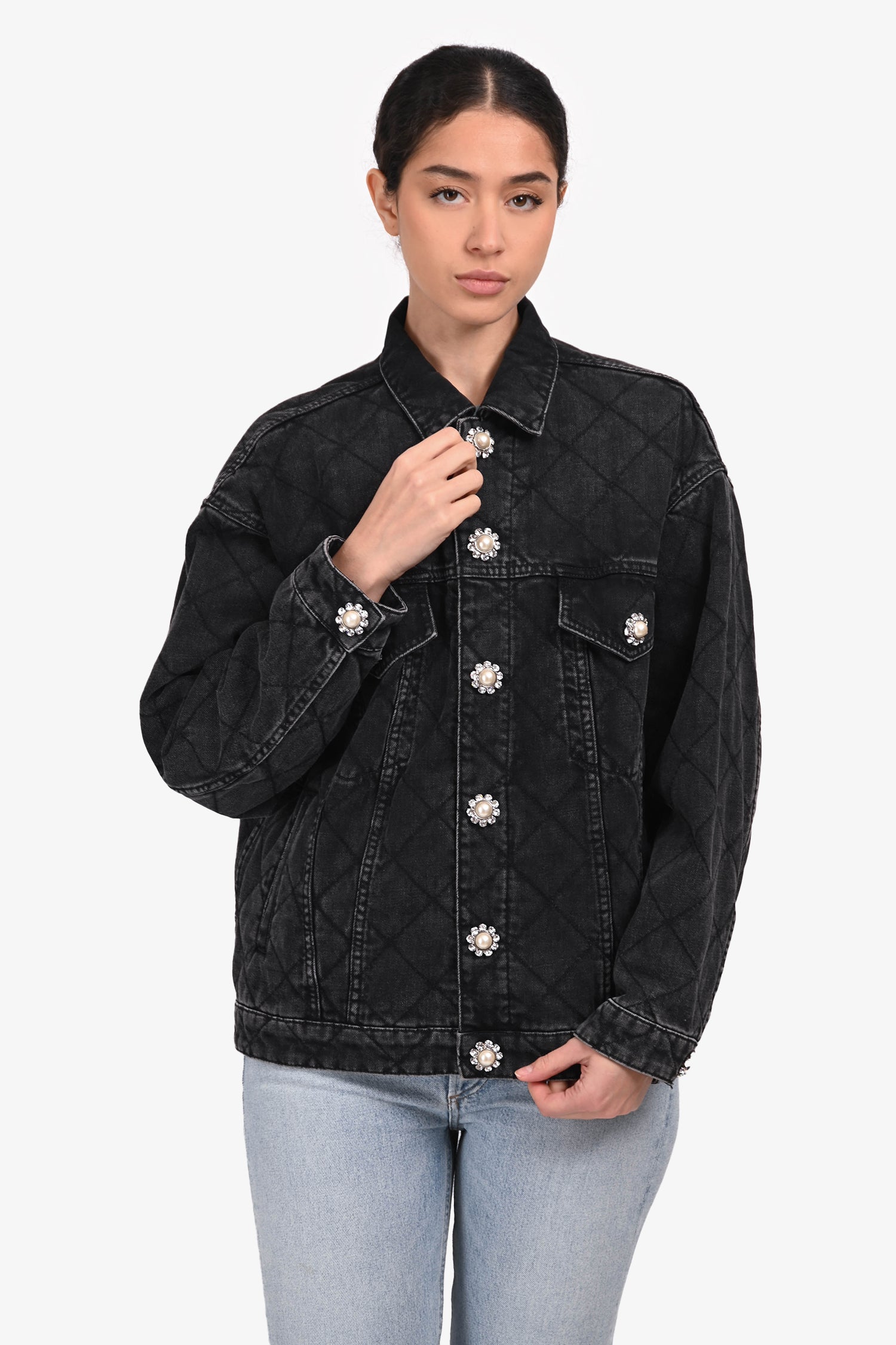 Miu Miu 2021 Black Denim Quilted Crystal/Faux Pearl Button Up Jacket Size 38