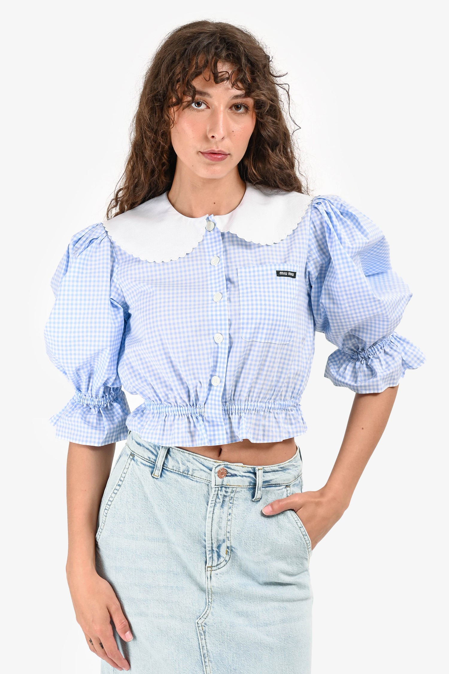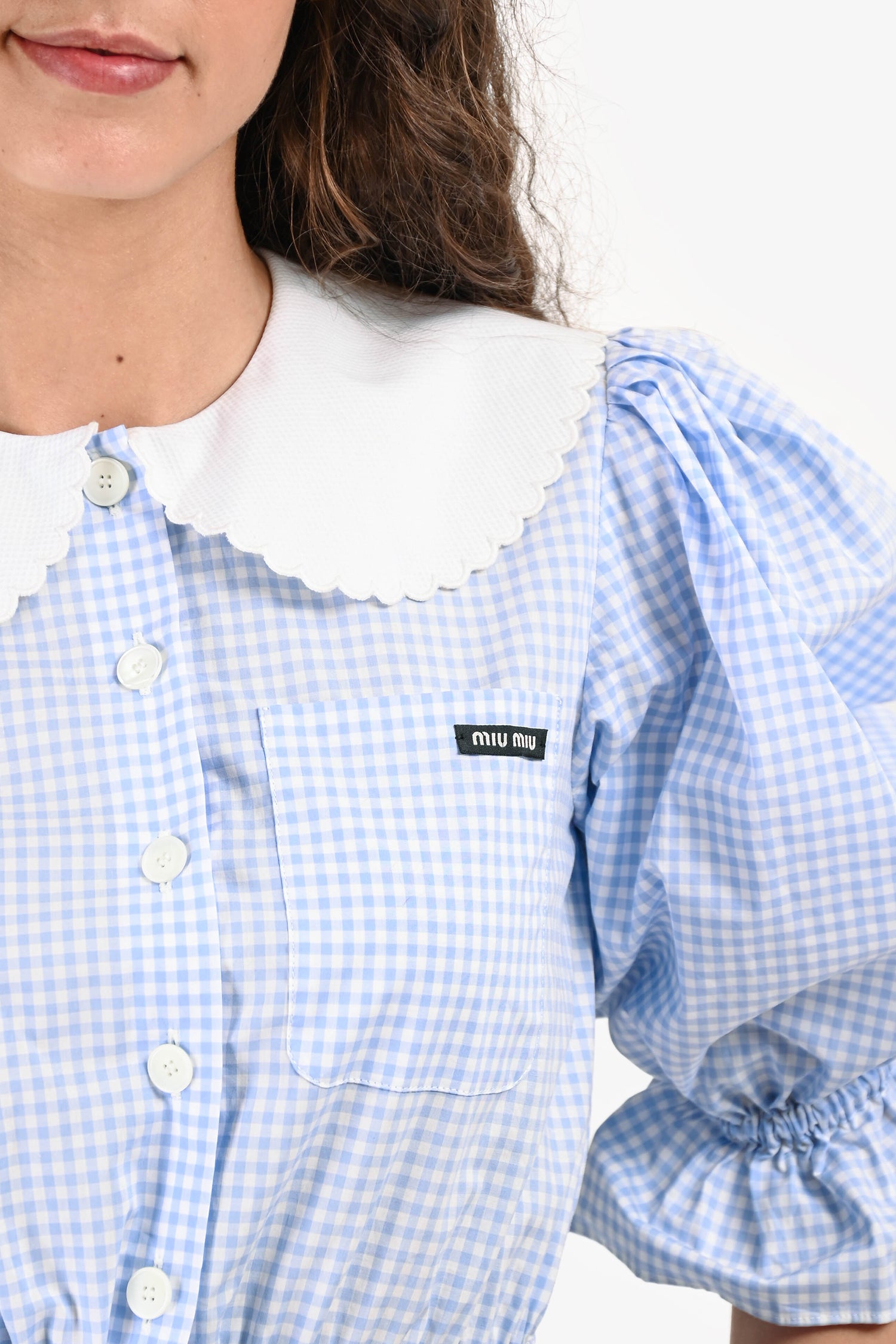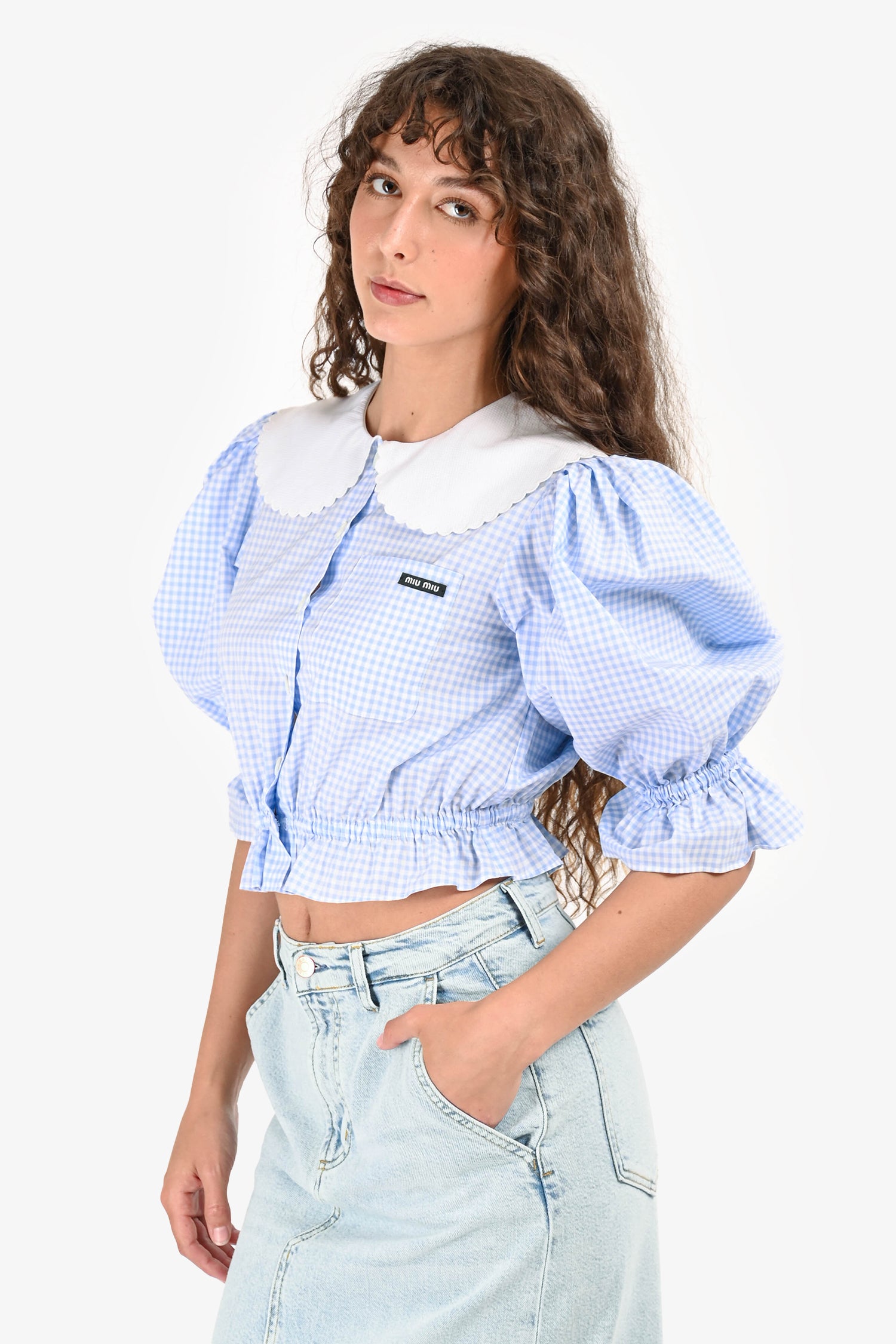 Refresh availabilityMiu Miu 2021 Blue Gingham Peterpan Collar Blouse. Rounded Peter Pan collar with contrast trim. Long sleeves with subtle puff detail. Front button closure. Tonal stitching.