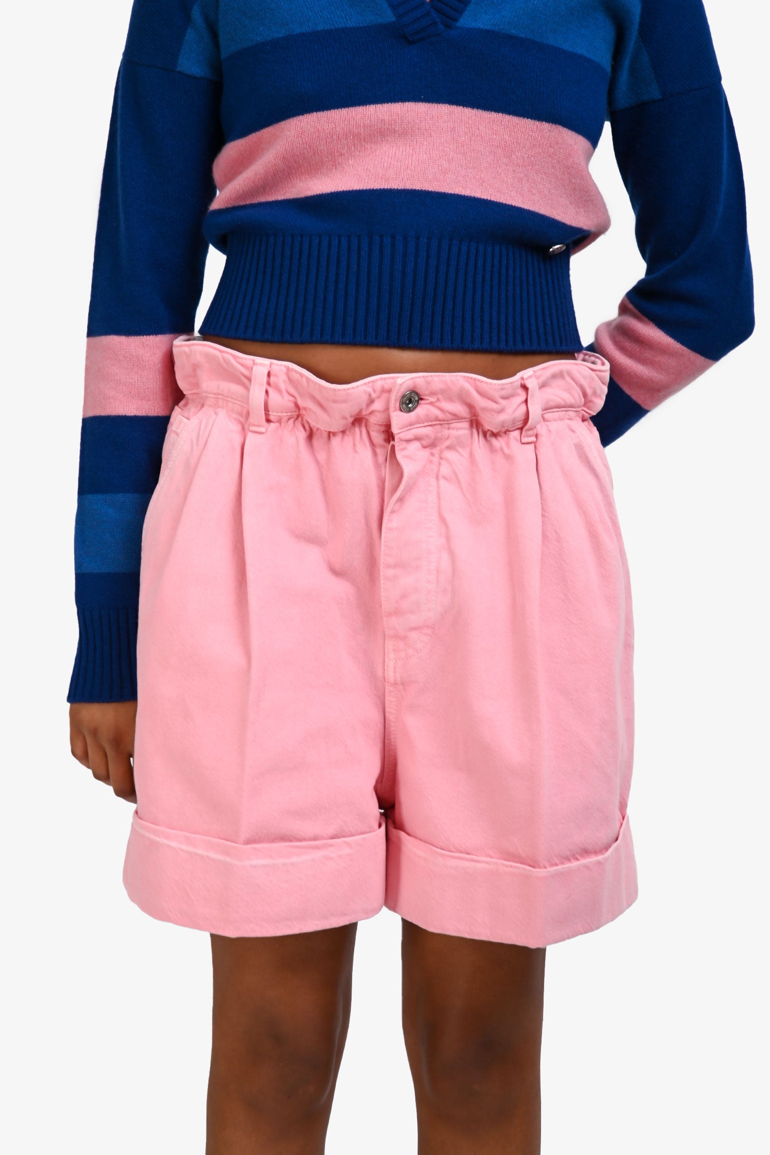 Refresh availabilityMiu Miu 2021 Pink Denim Paper Bag Waisted Shorts. Front button-up closure. Waistband belt loops. 4 exterior pockets; 2 slip pocket, 2 rear slip. Silver-tone hardware. Tonal stitching.