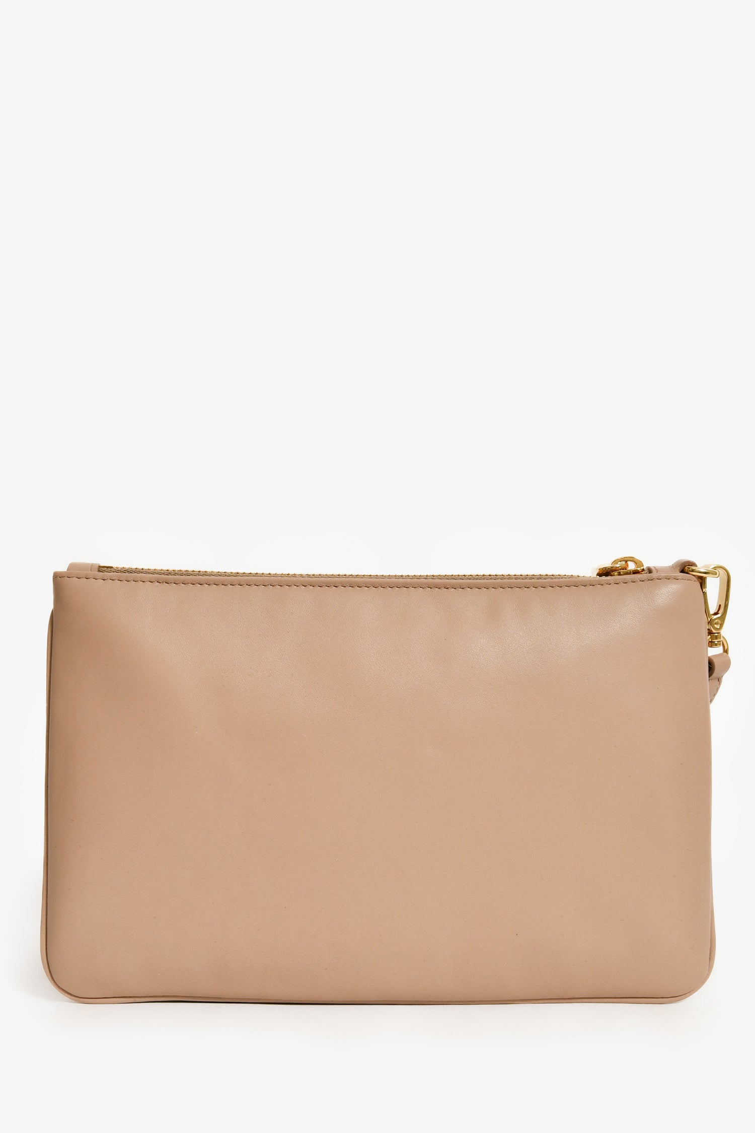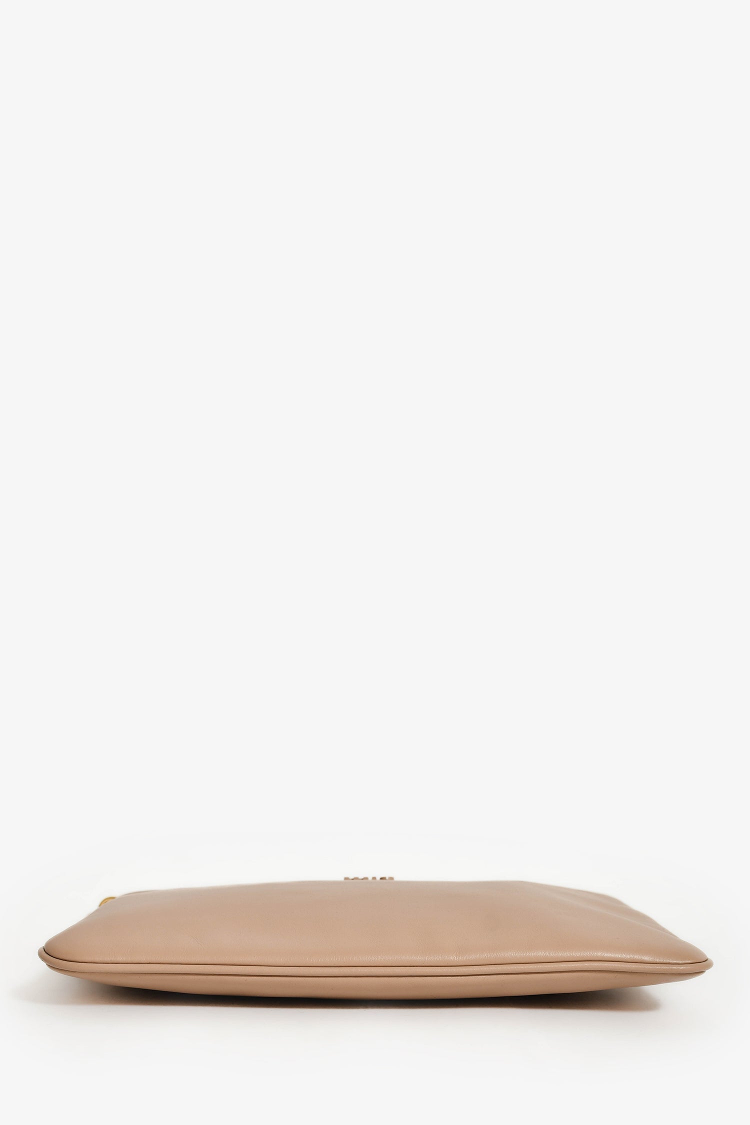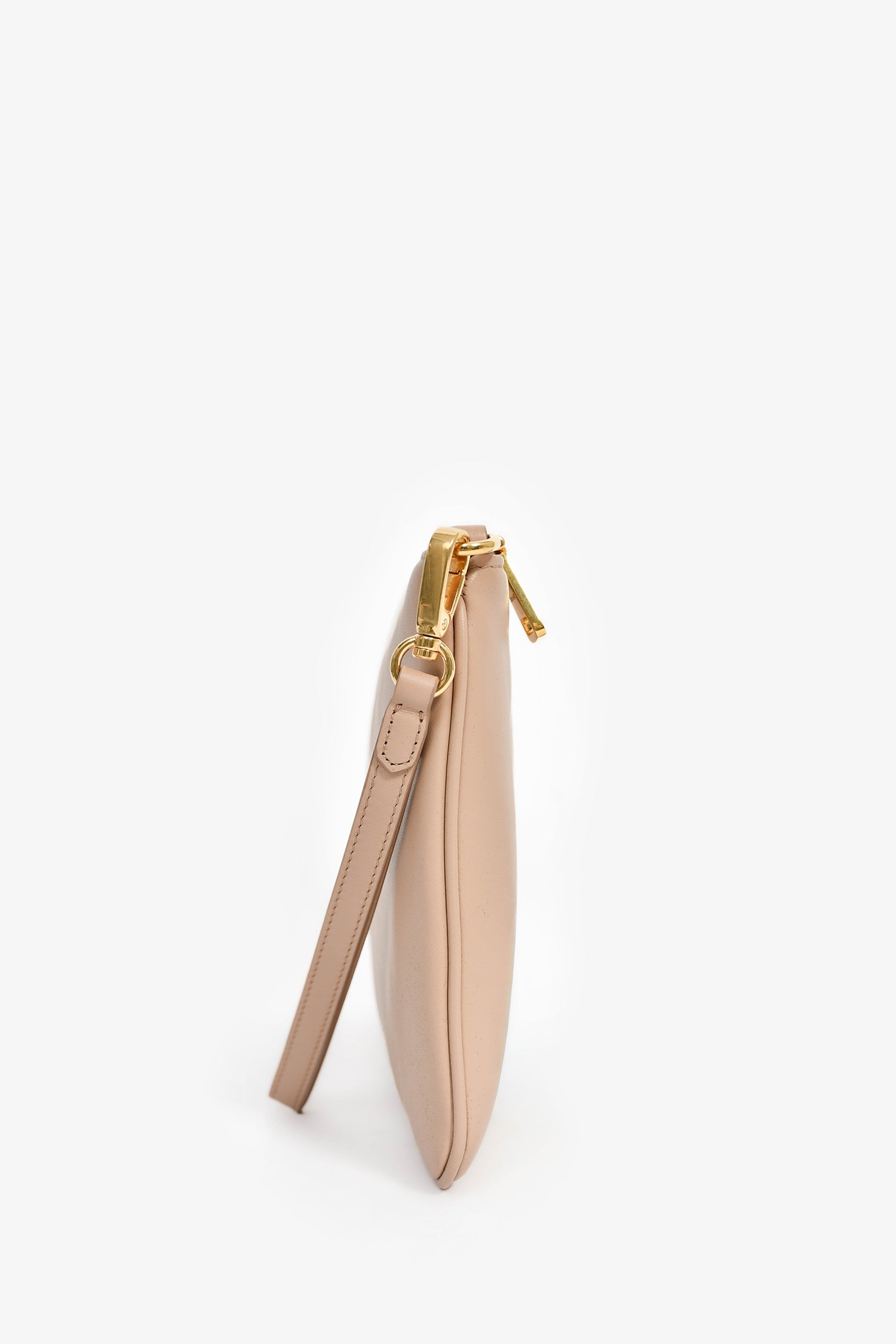 Refresh availabilityMiu Miu Beige Leather Logo Zip Pouch. Top zipper. Attached wristlet. Lined interior. Gold-tone hardware. Tonal stitching.