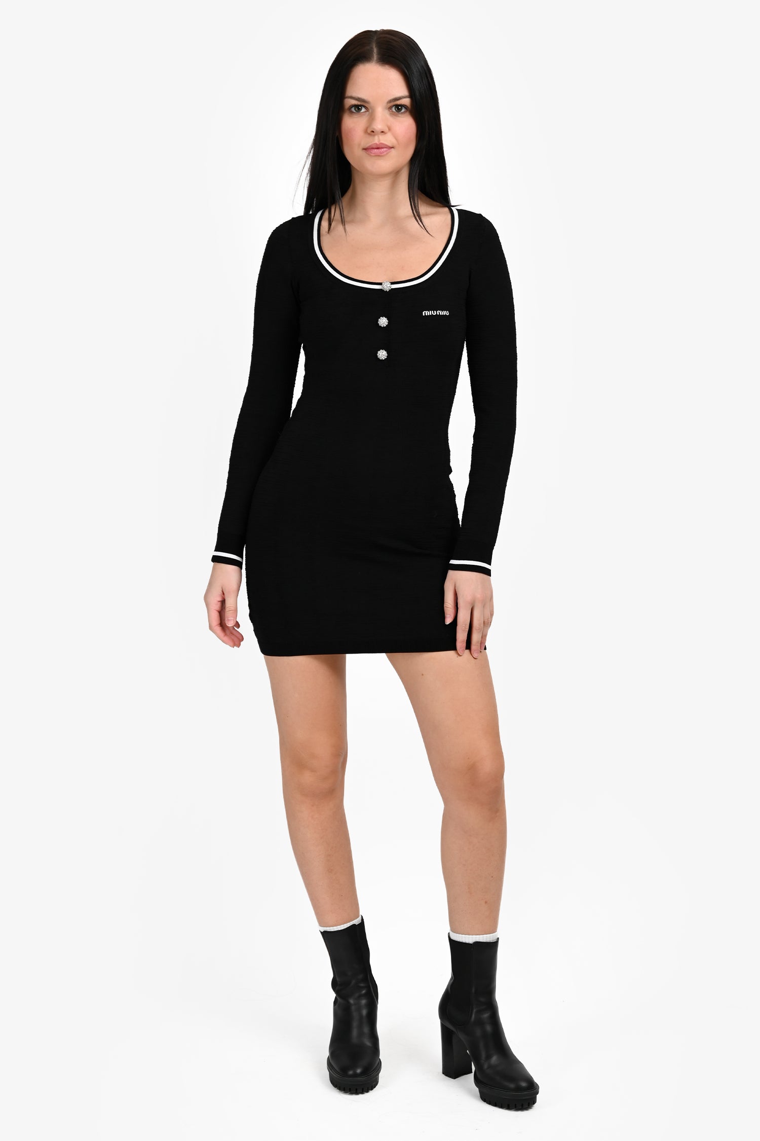 Refresh availabilityMiu Miu Black Logo Crystal Embellished Button Long Sleeve Mini Dress. Round neckline. Ribbed neck, cuffs, and hemline. Button detailing in the front. Silver-tone hardware. Tonal stitching.