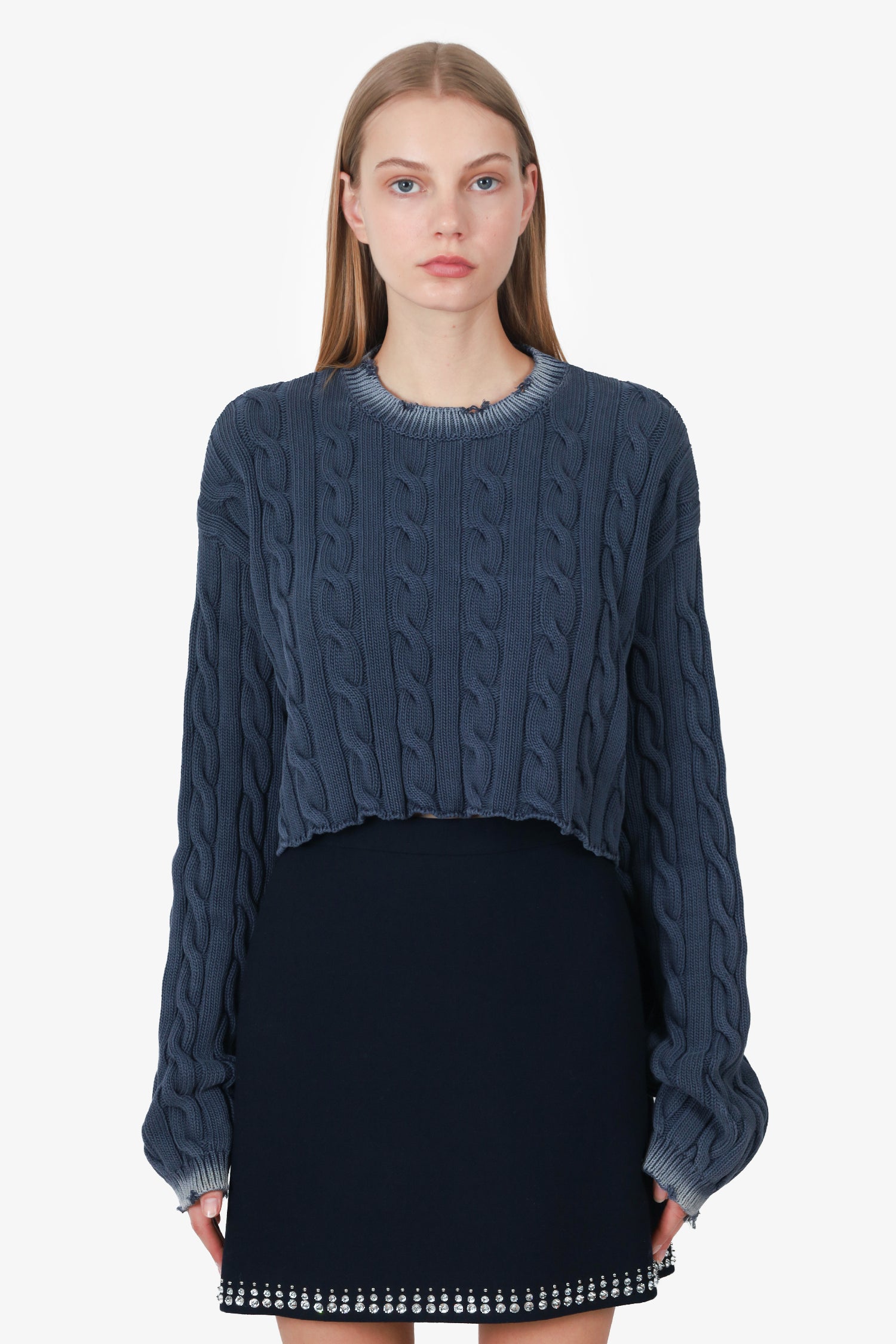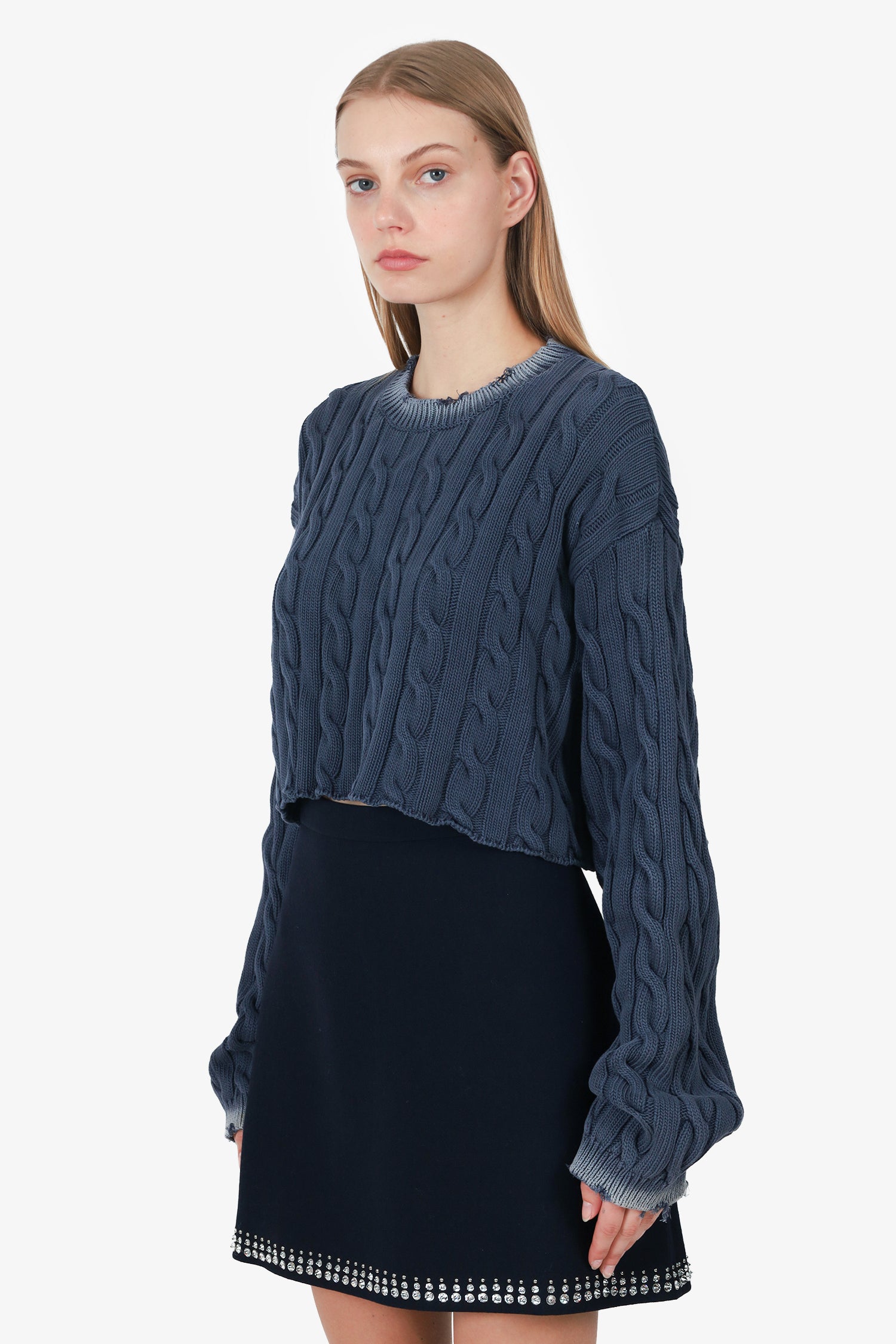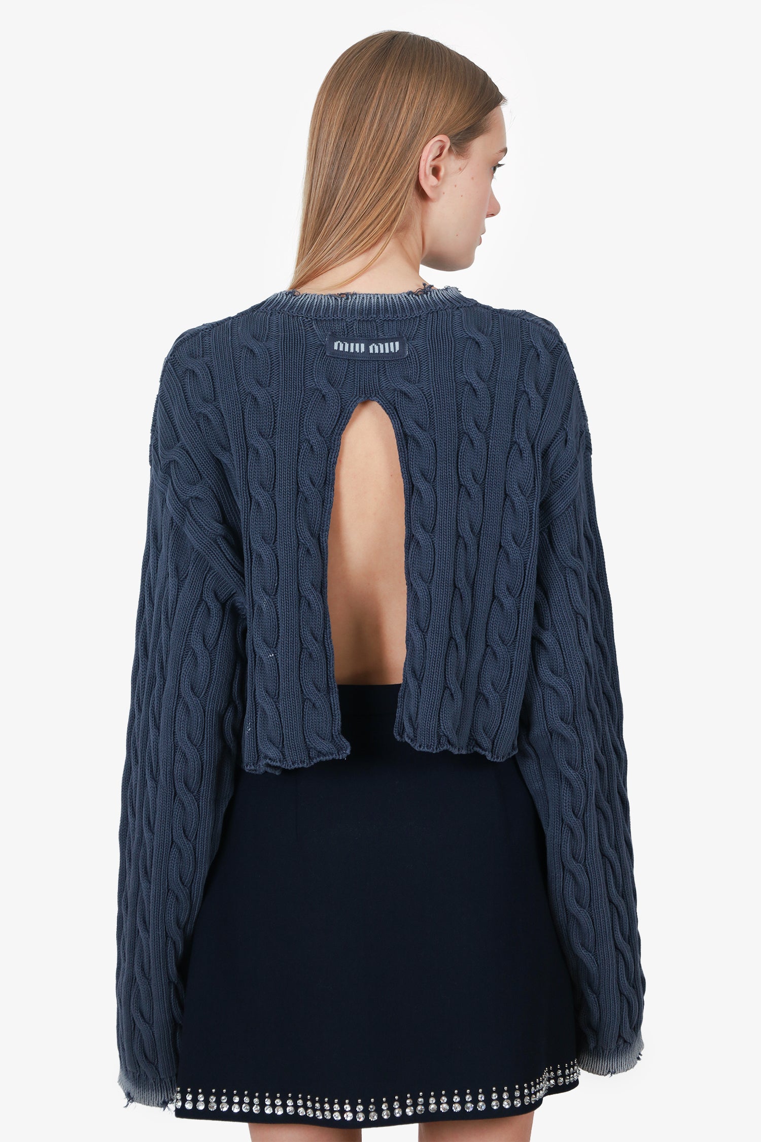Refresh availabilityMiu Miu Blue Cut-out Cropped Cable-Knit Distressed Sweater. Round neckline. Rear slit. Tonal stitching.