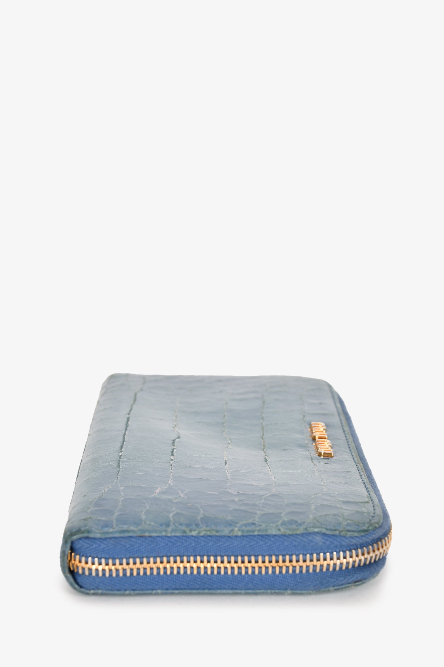 Refresh availabilityMiu Miu Blue Leather Croc Embossed Zip Wallet. Top zip closure. 8 card slots. 2 billfold compartments. 1 zippered coin compartment. Gold-toe hardware.