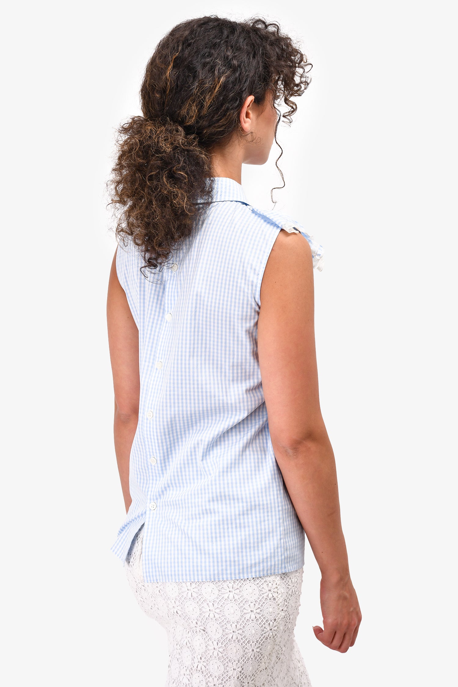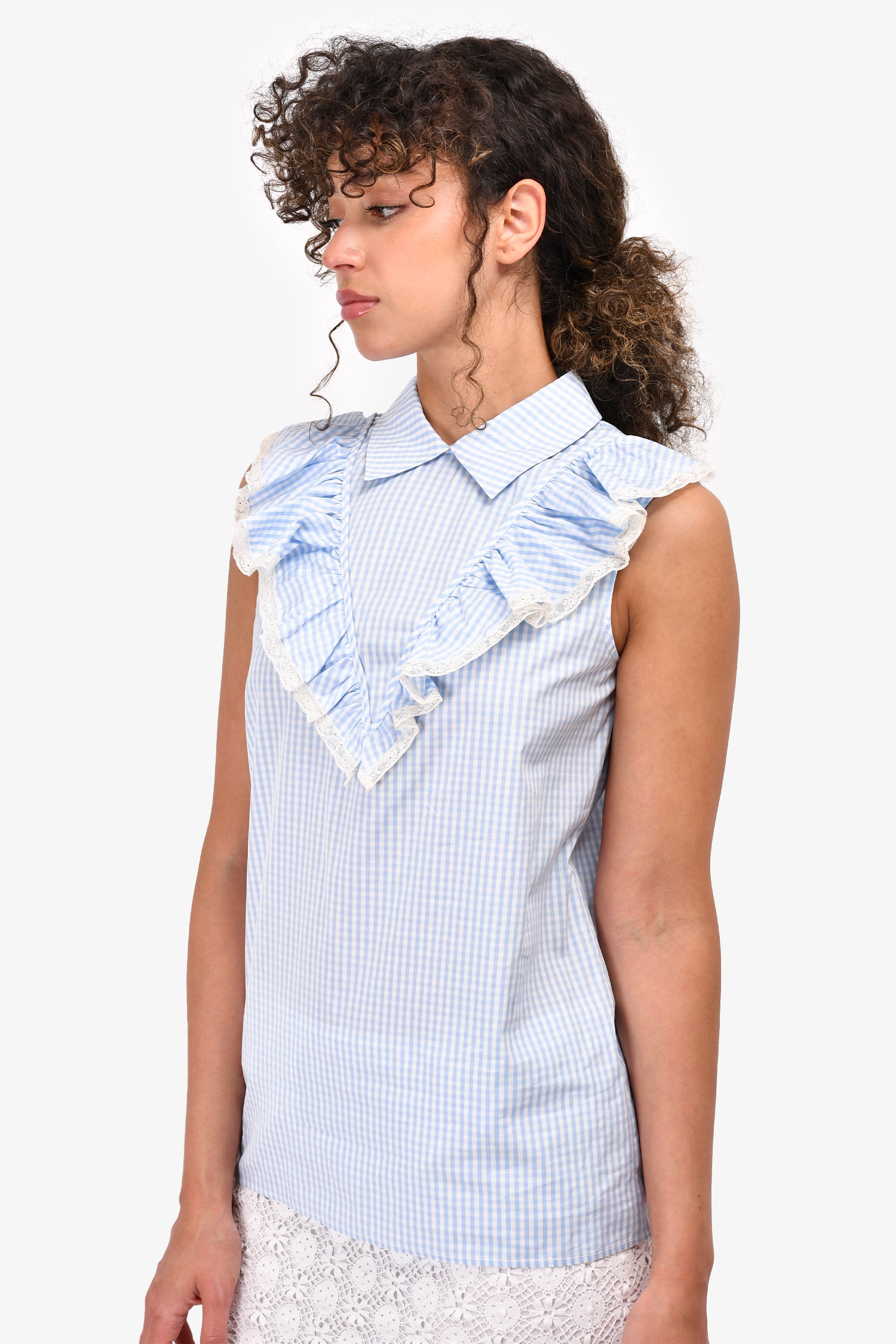Refresh availabilityMiu Miu Blue & White Gingham Ruffle Detail Collared Top. Lace trim around the ruffles. Back button-down closure. Tonal stitching.