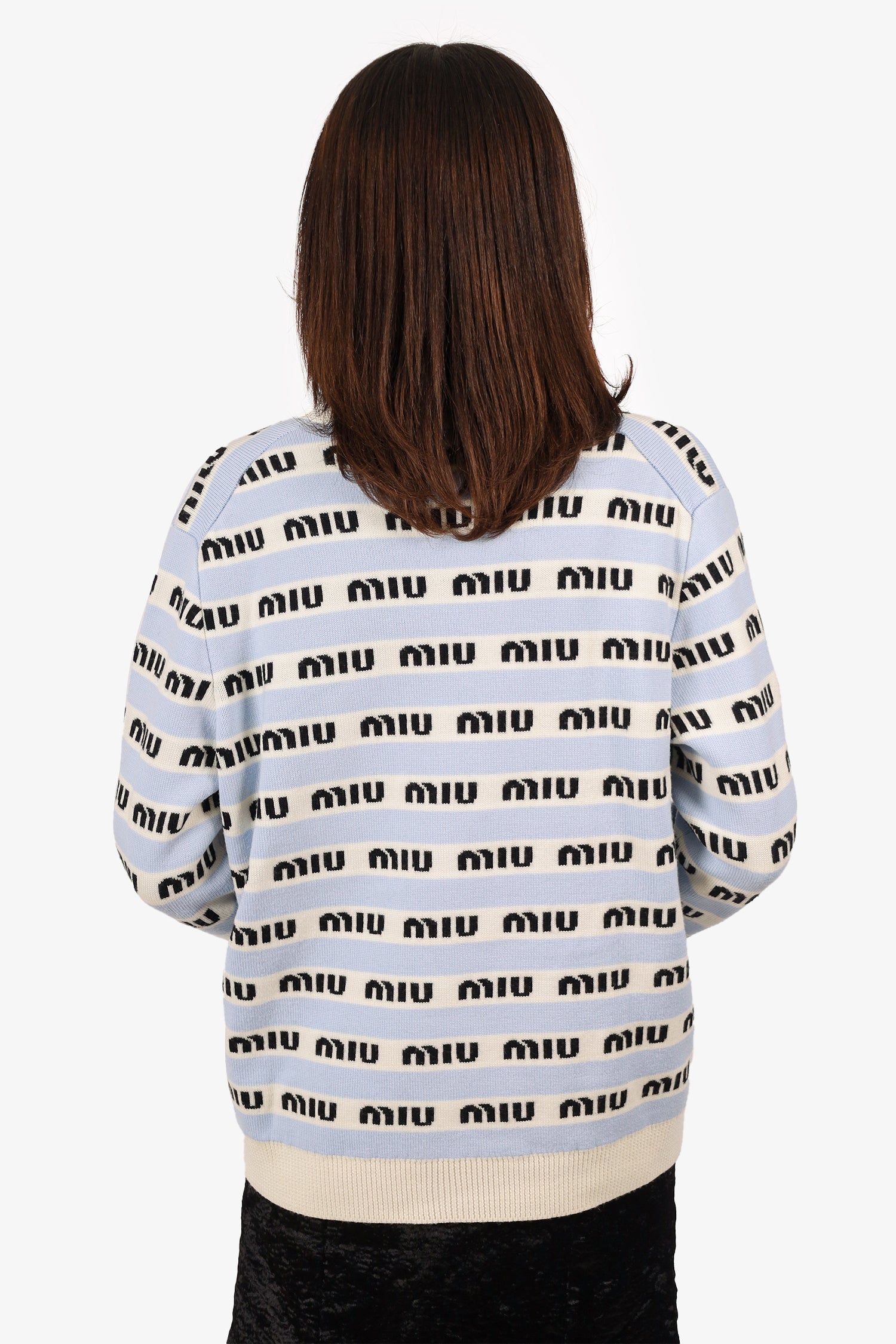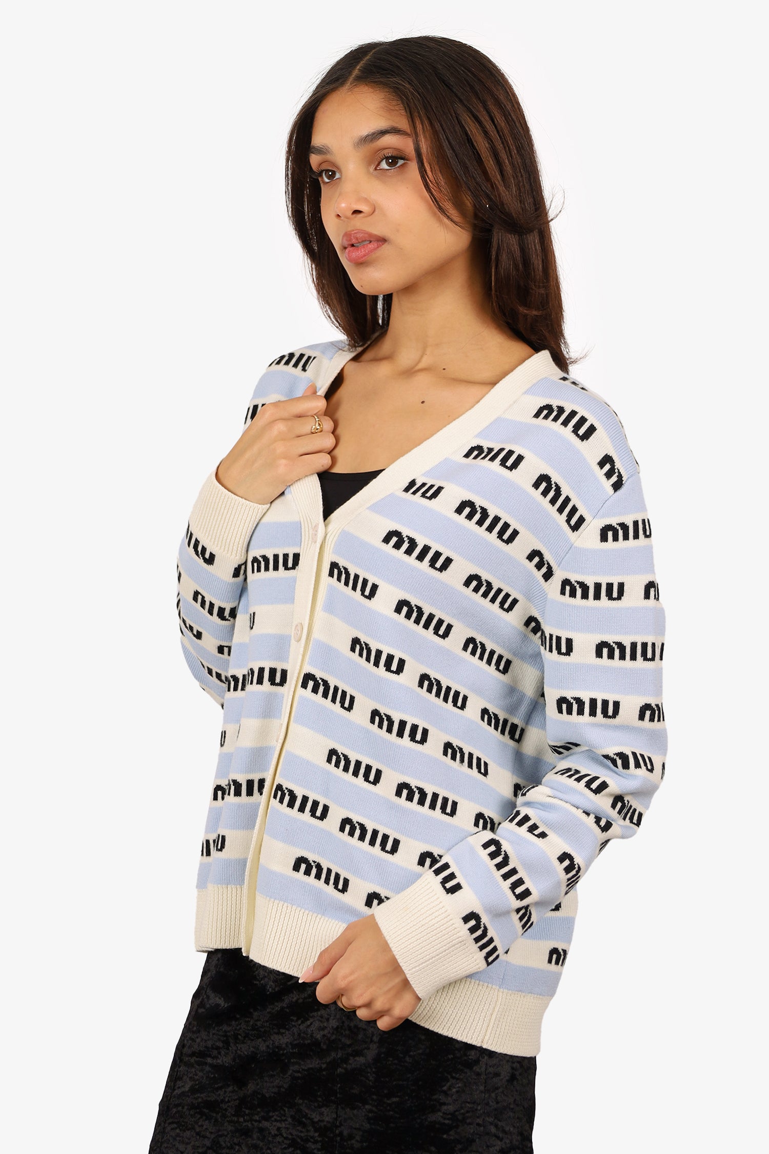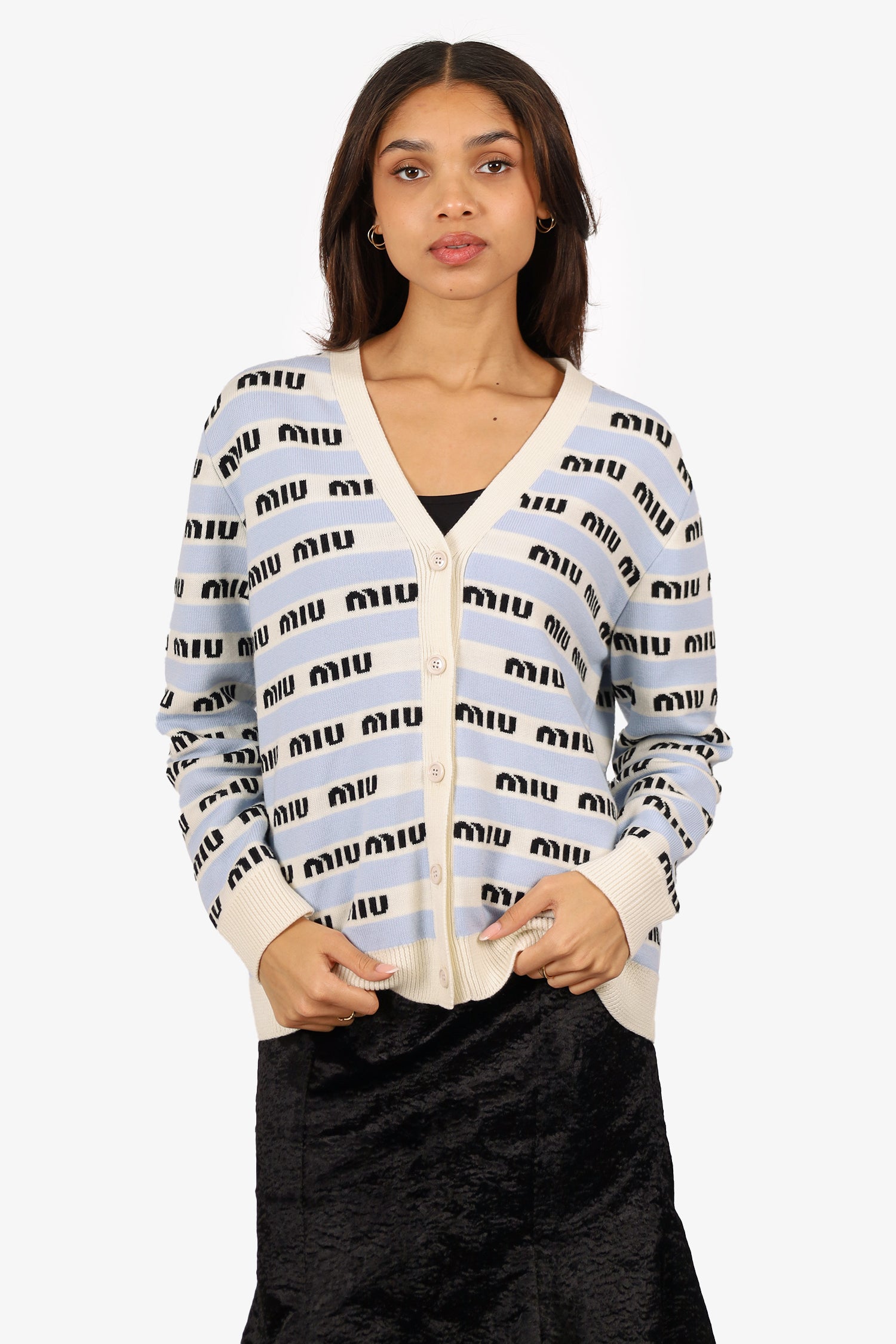Miu Miu Blue/White Wool Logo Cardigan. V-neckline. Front button-up closure. Ribbed neckline, sleeve cuffs and waistband. Tonal stitching.