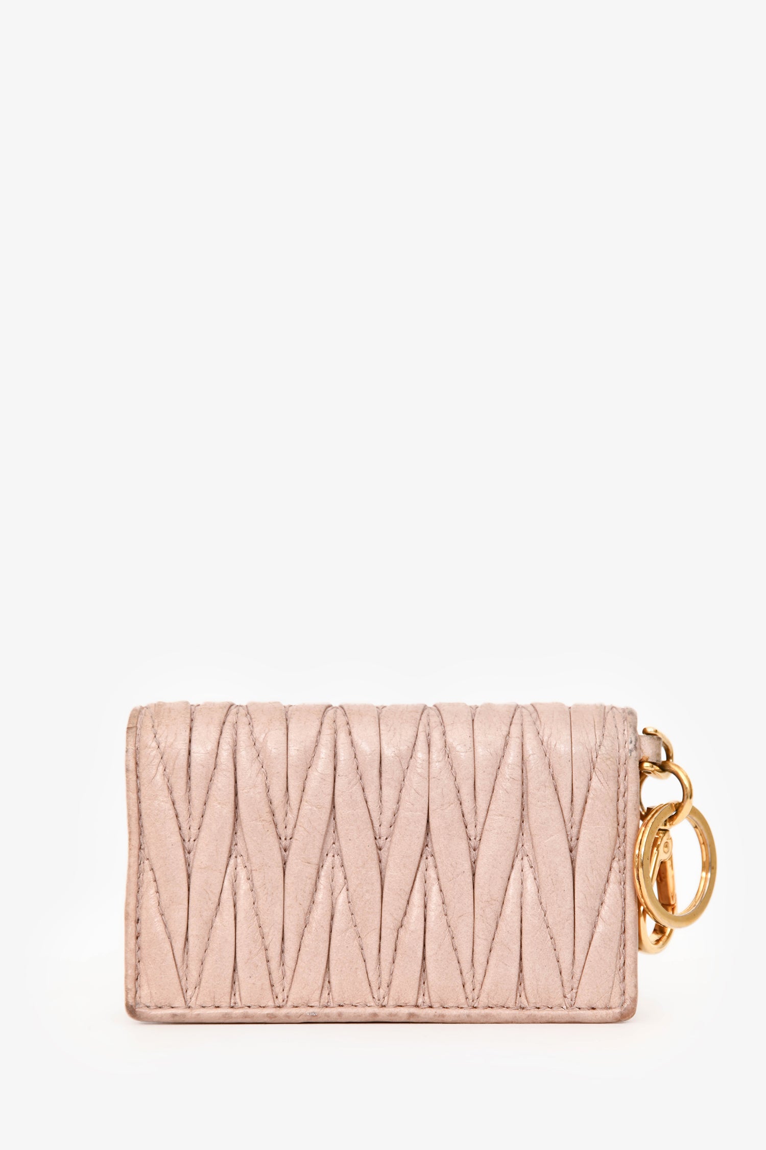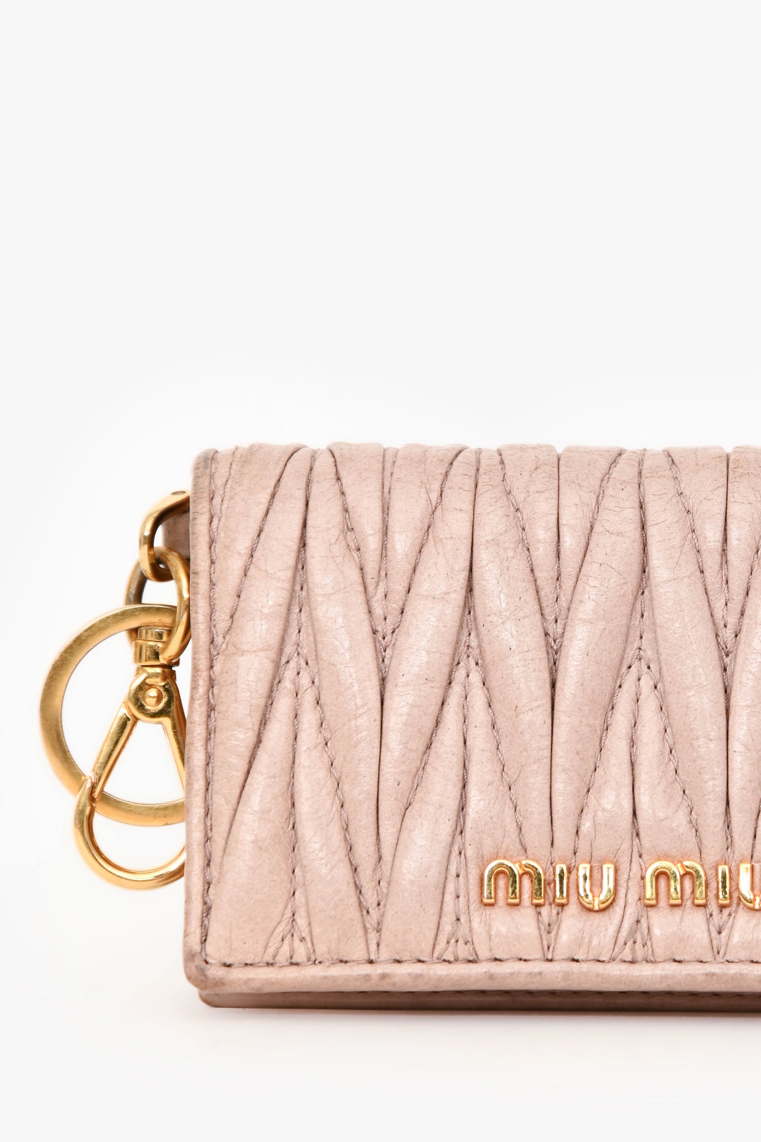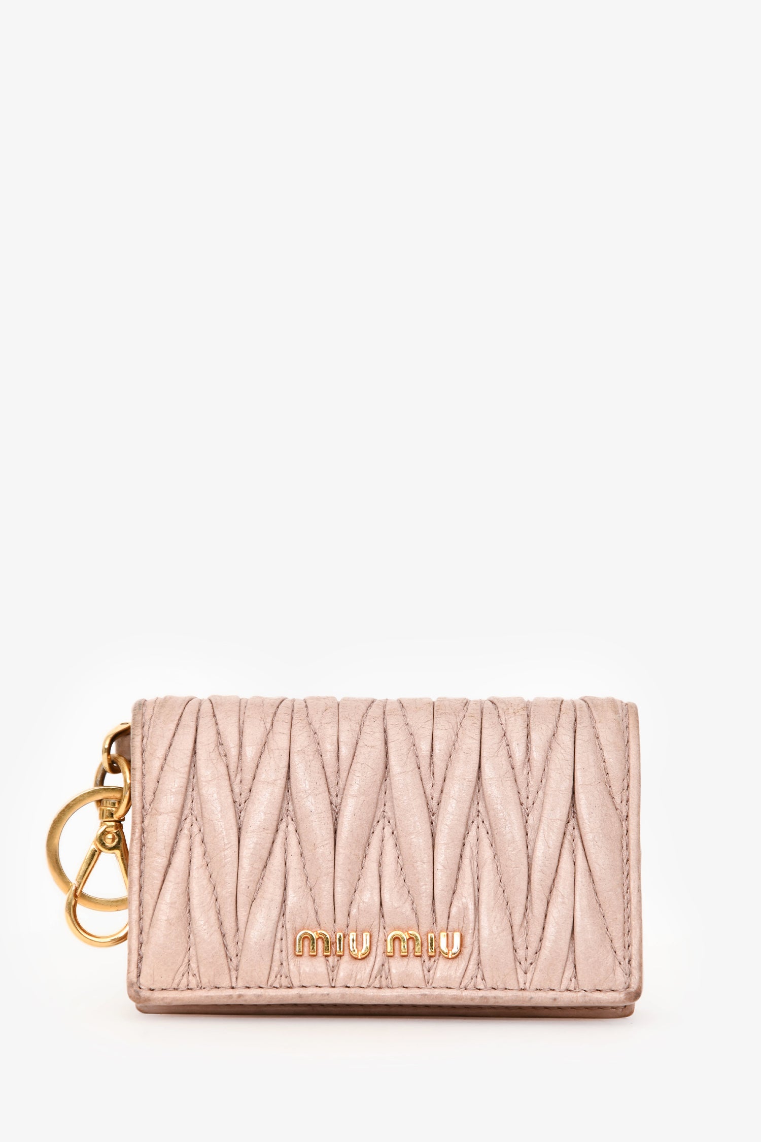 Refresh availabilityMiu Miu Cream Matelassé Leather Cardholder Keychain. Front fold-over flap with snap-button closure. 4 card slots. Key ring and lobster clasp. Gold-tone hardware. Tonal stitching.