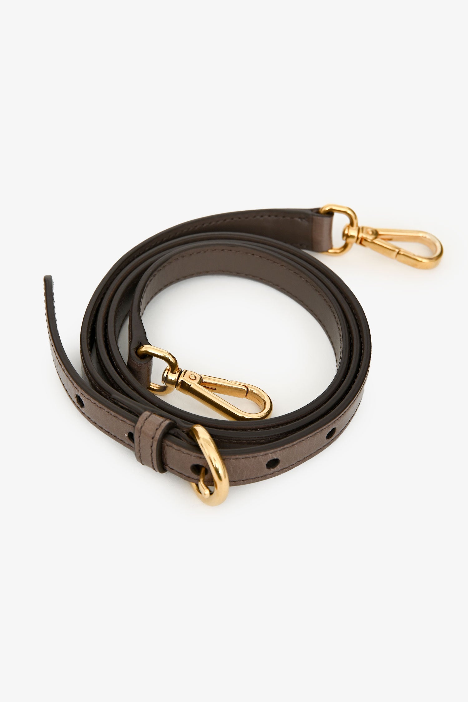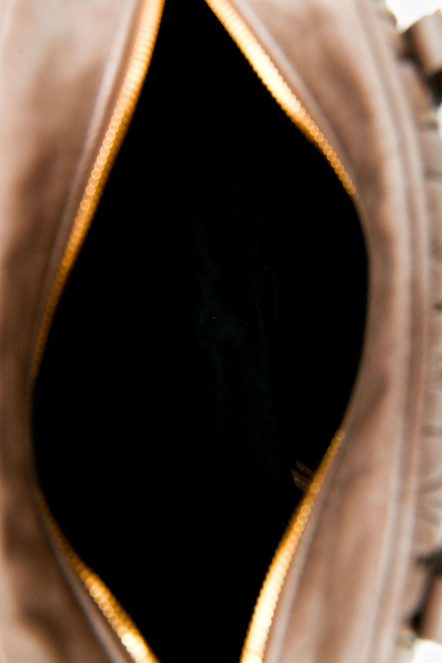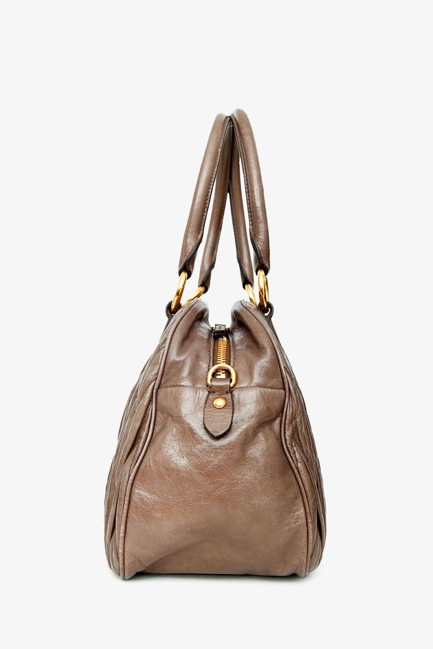Refresh availabilityMiu Miu Dark Beige Leather Matelassé Lux 'Baulleto' Top Handle Bag. Top zip closure. Twin top handles. Removable crossbody strap with lobster clasp closure. Fabric-lined interior. Single interior wall pocket with zip closure. Gold-tone hardware. Tonal stitching.