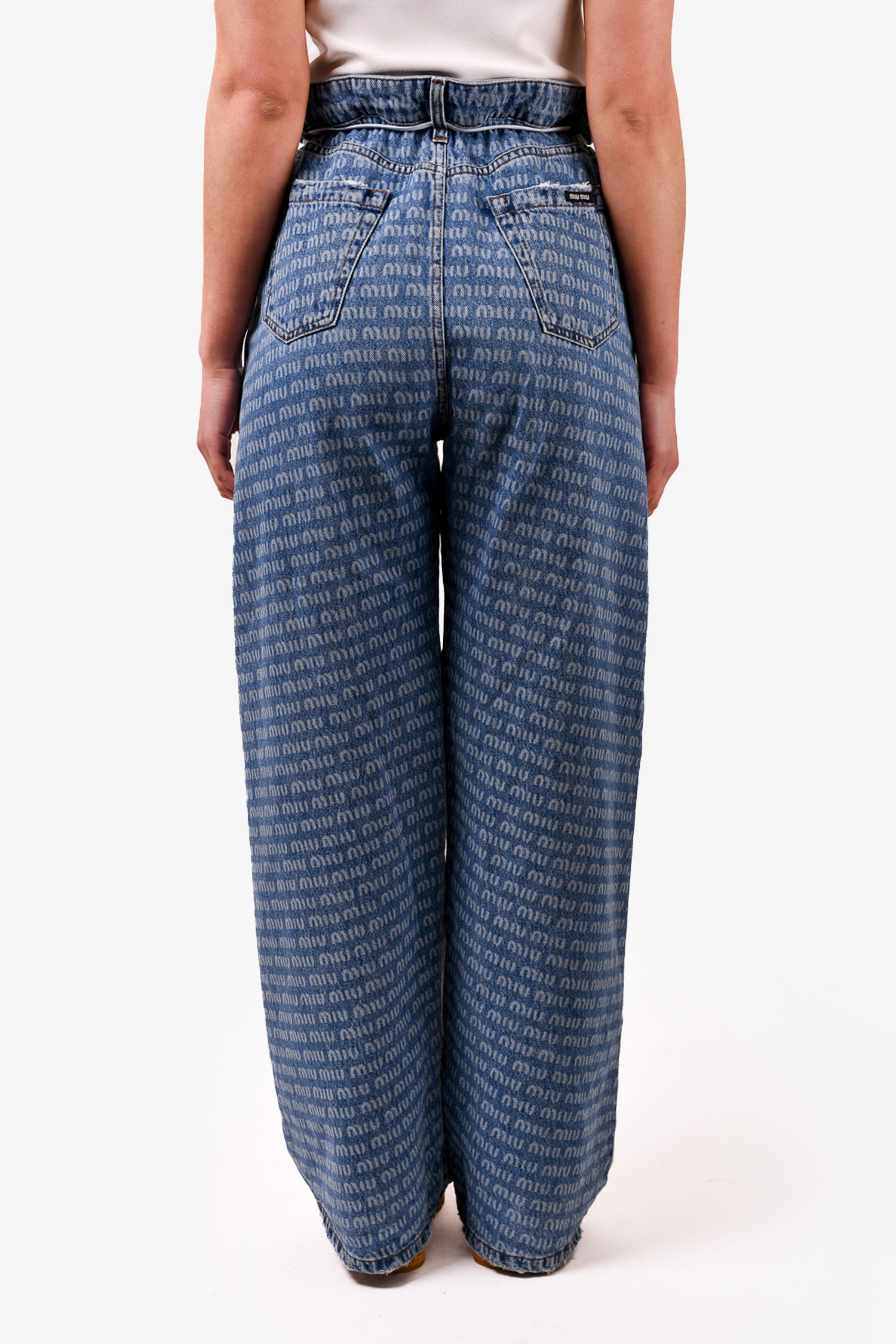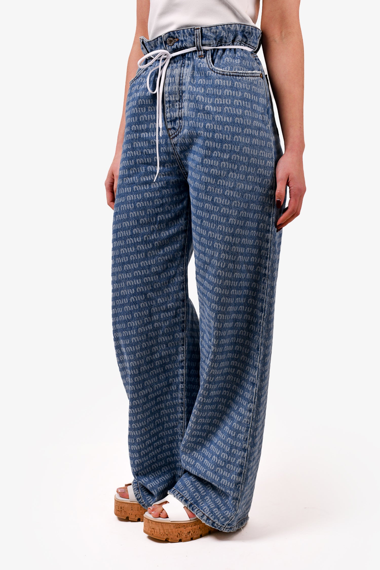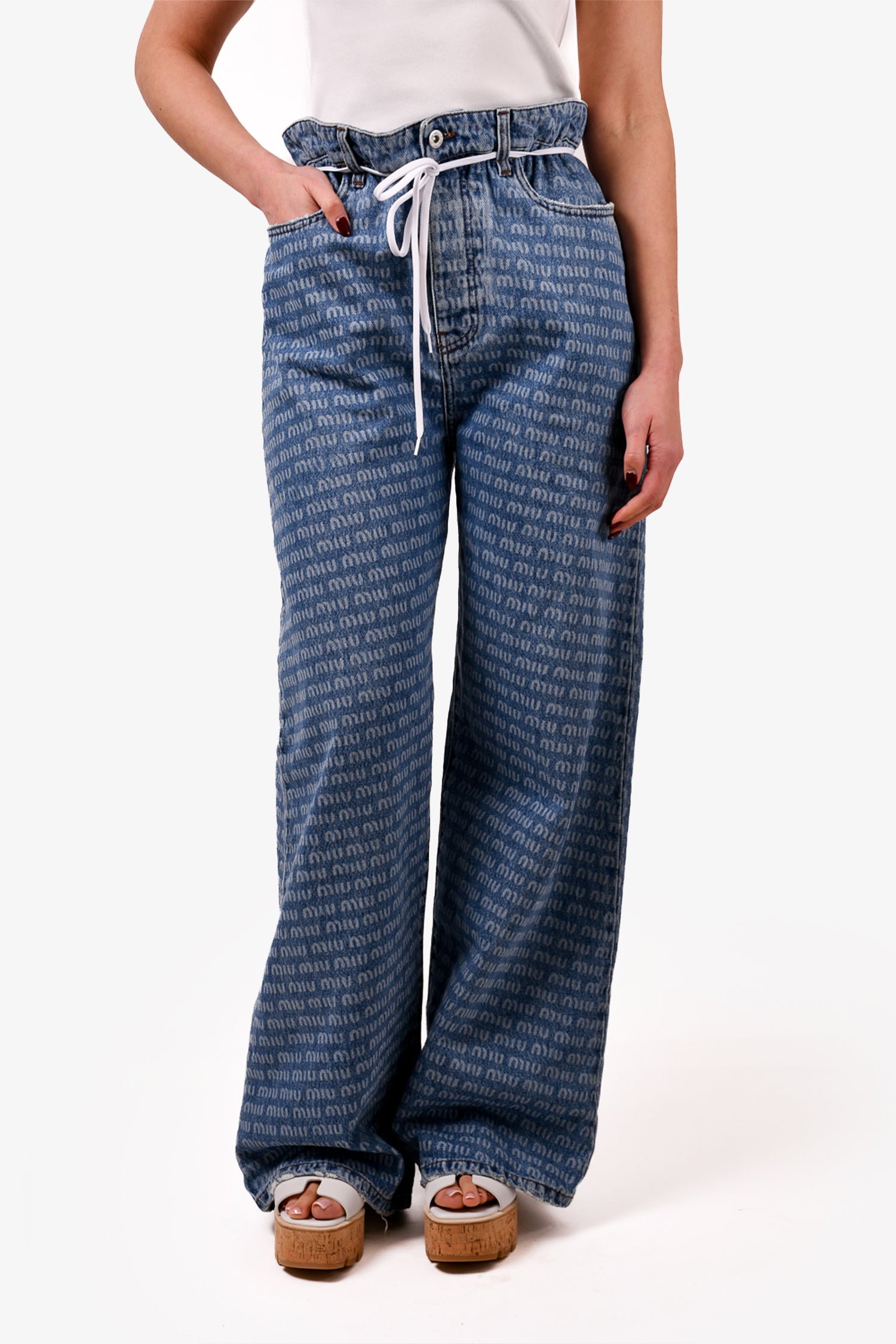 Refresh availabilityMiu Miu 2021 Denim Logo Printed Wide Leg Jeans. Front button-up closure. Front and rear pocket. Lace tie-up closure on the waist. Contrast and tonal stitching.