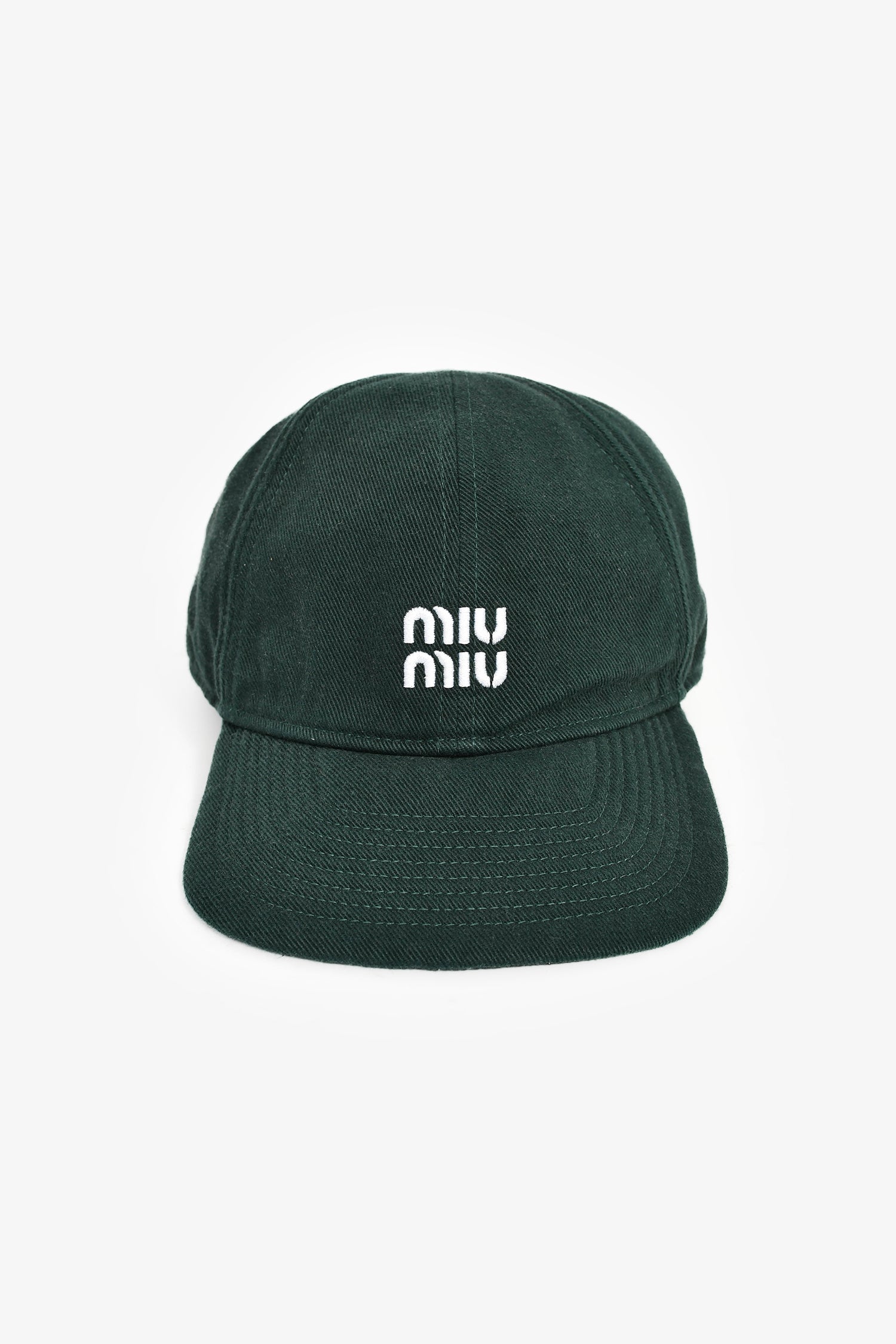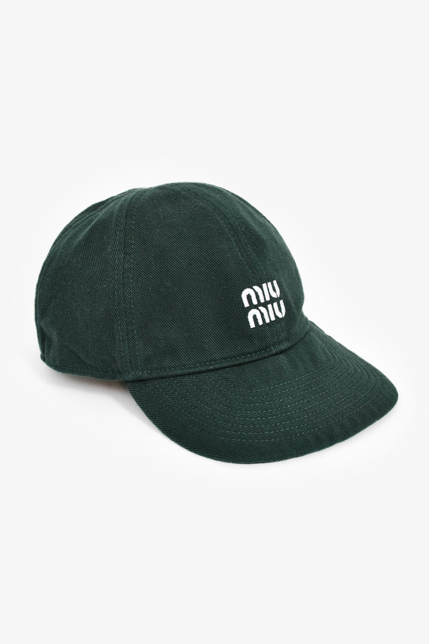 Refresh availabilityMiu Miu Green Cotton Logo Baseball Cap. Rear pull tabs. Gold-tone hardware. Tonal stitching.