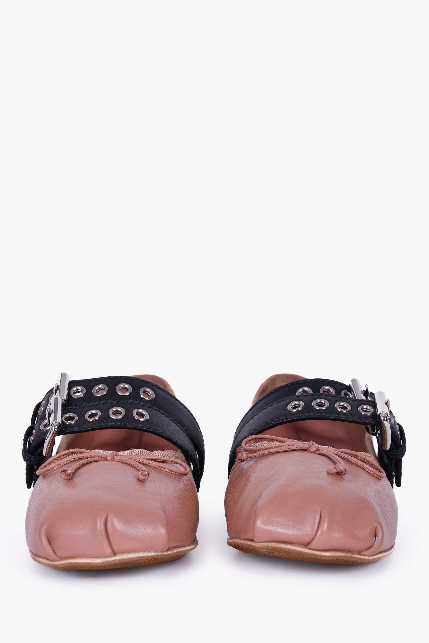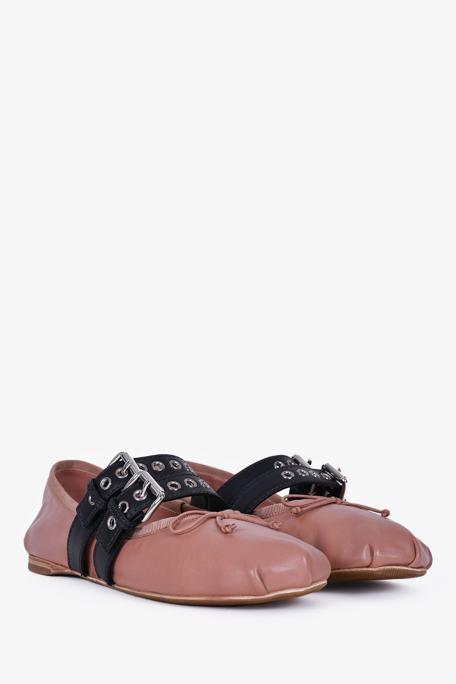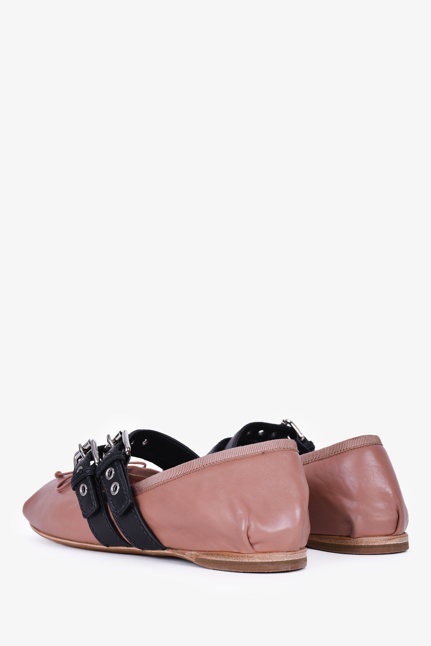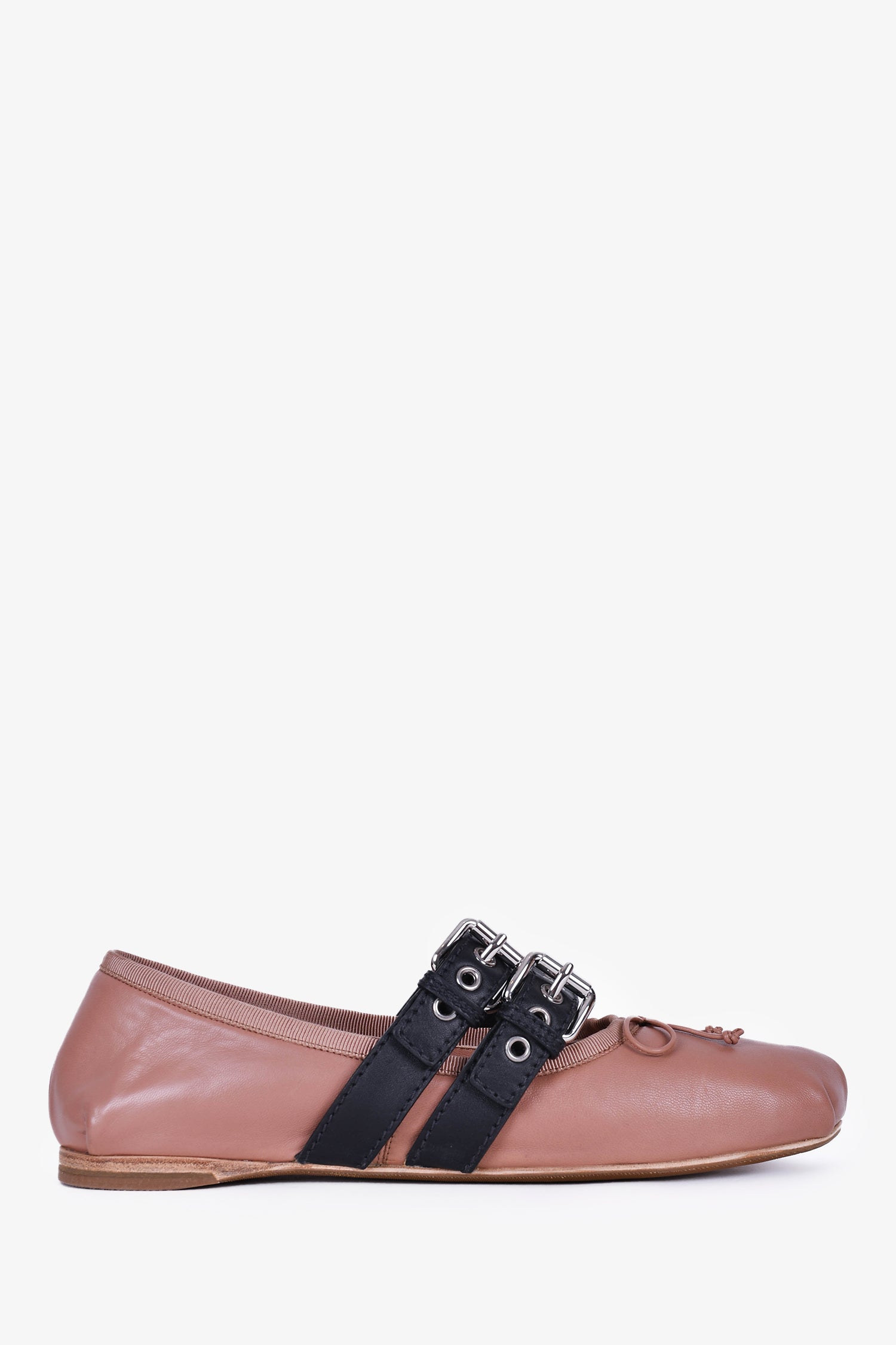 Refresh availabilityMiu Miu Pink Buckle Detail 'Nappa' Ballet Flats with Ribbon. Round toe. Bow detail on the toe-box. Interchangeable straps. Topy soles.
