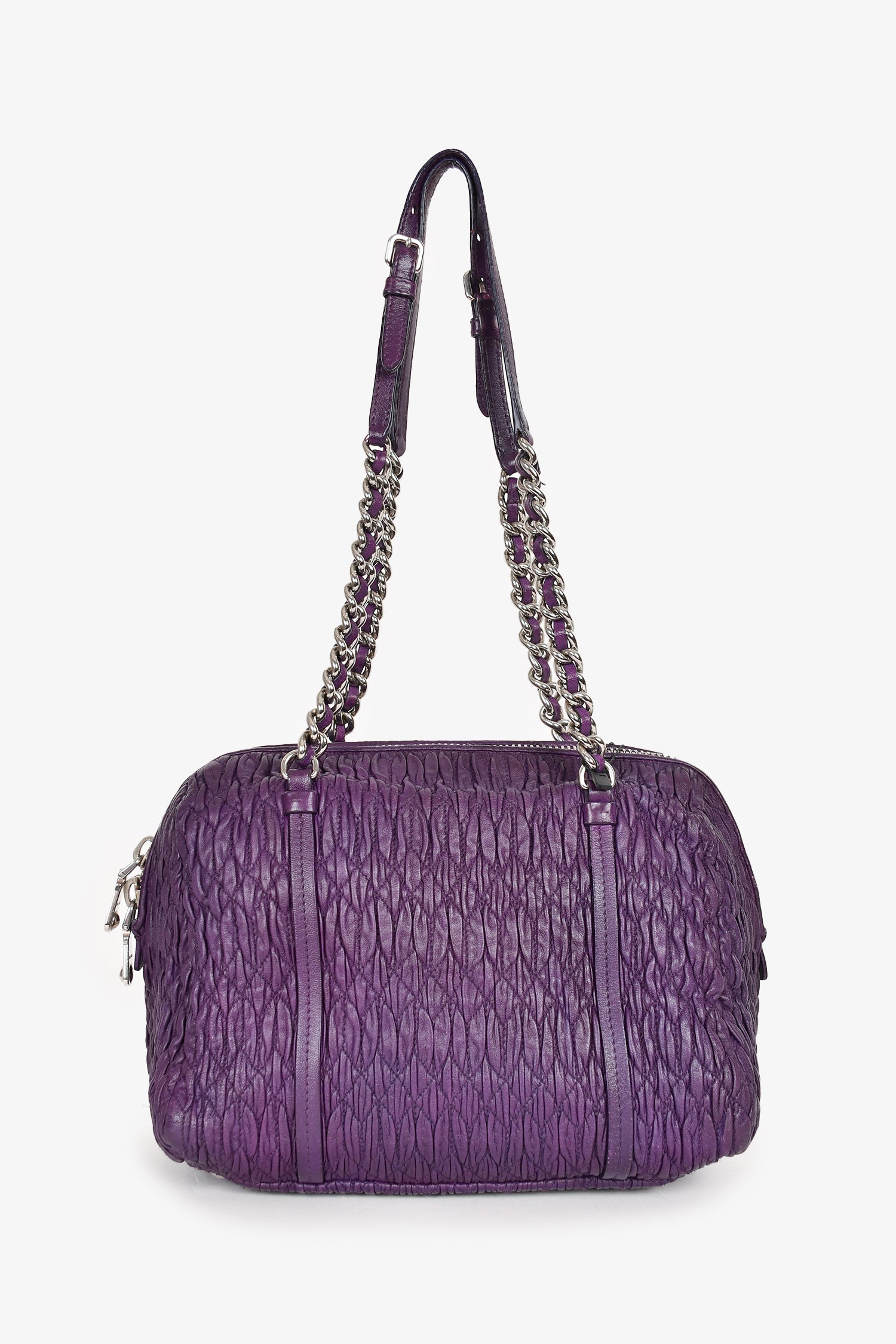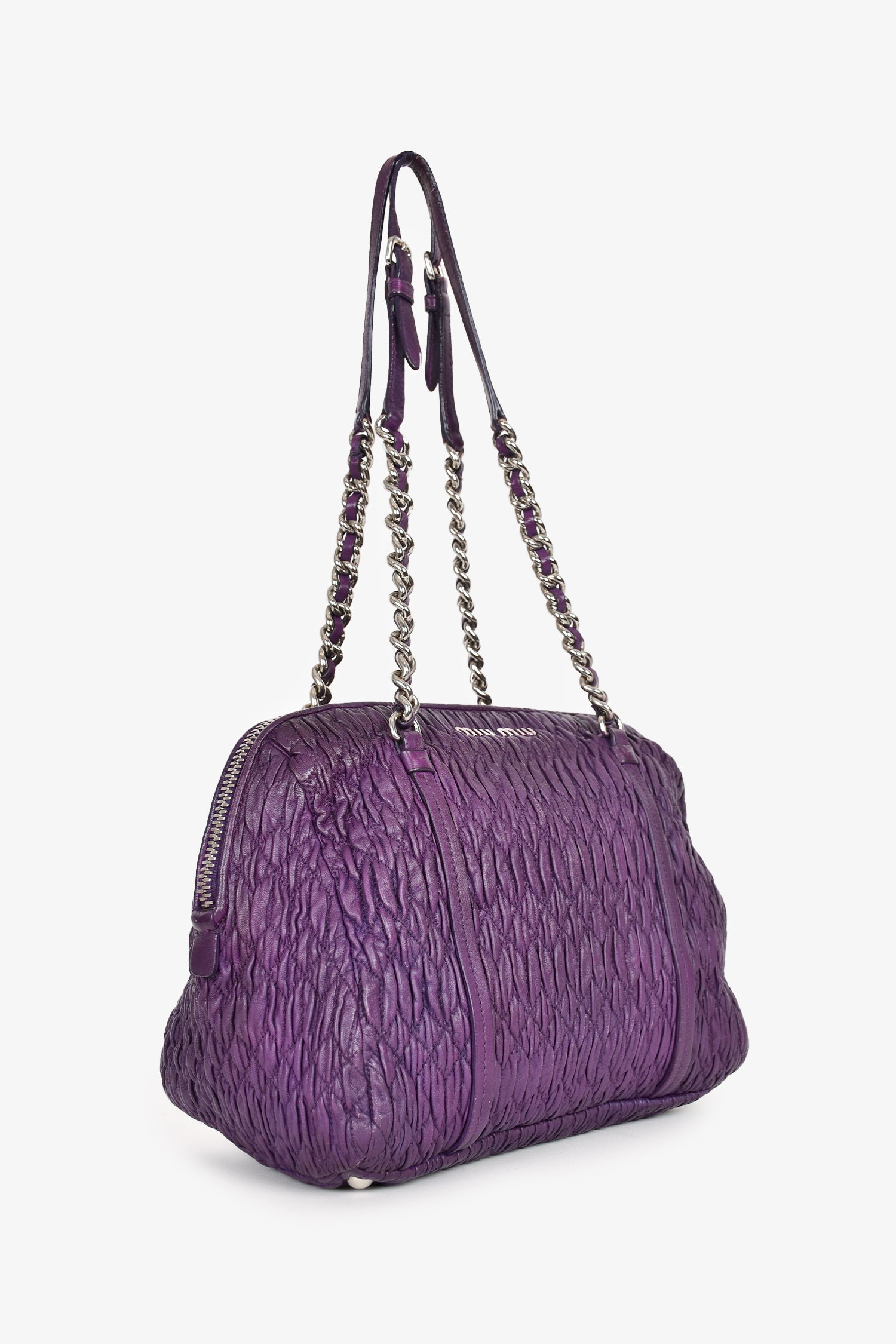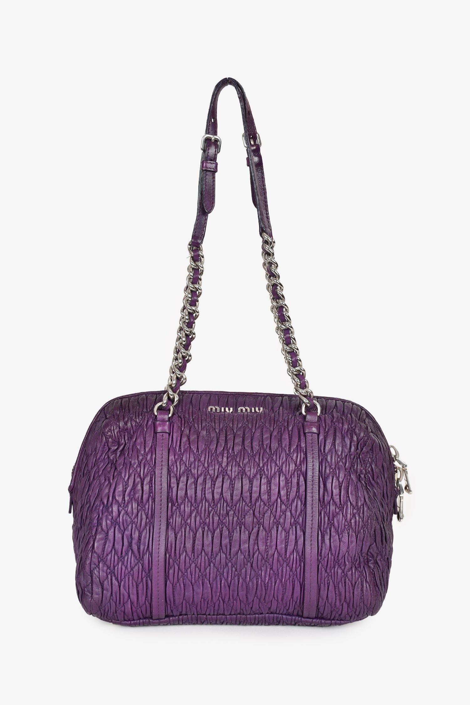 Refresh availabilityMiu Miu Purple Leather Matelasse Bag. Top zip closure. Twin handles. 2 interior wall slip pockets. 1 interior wall zip pocket. Silver-toned hardware. Tonal stitching.