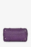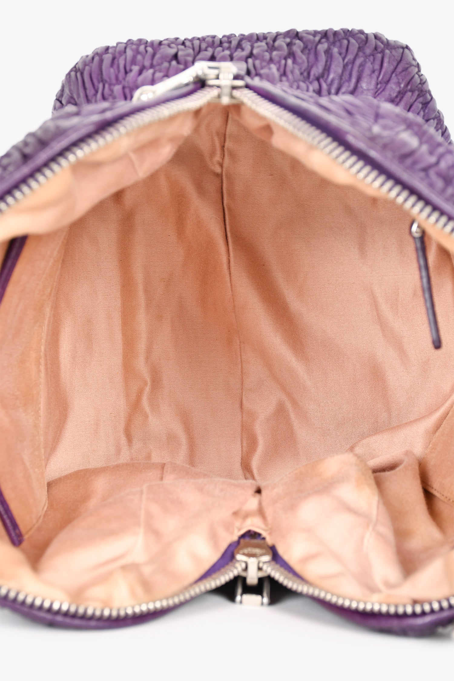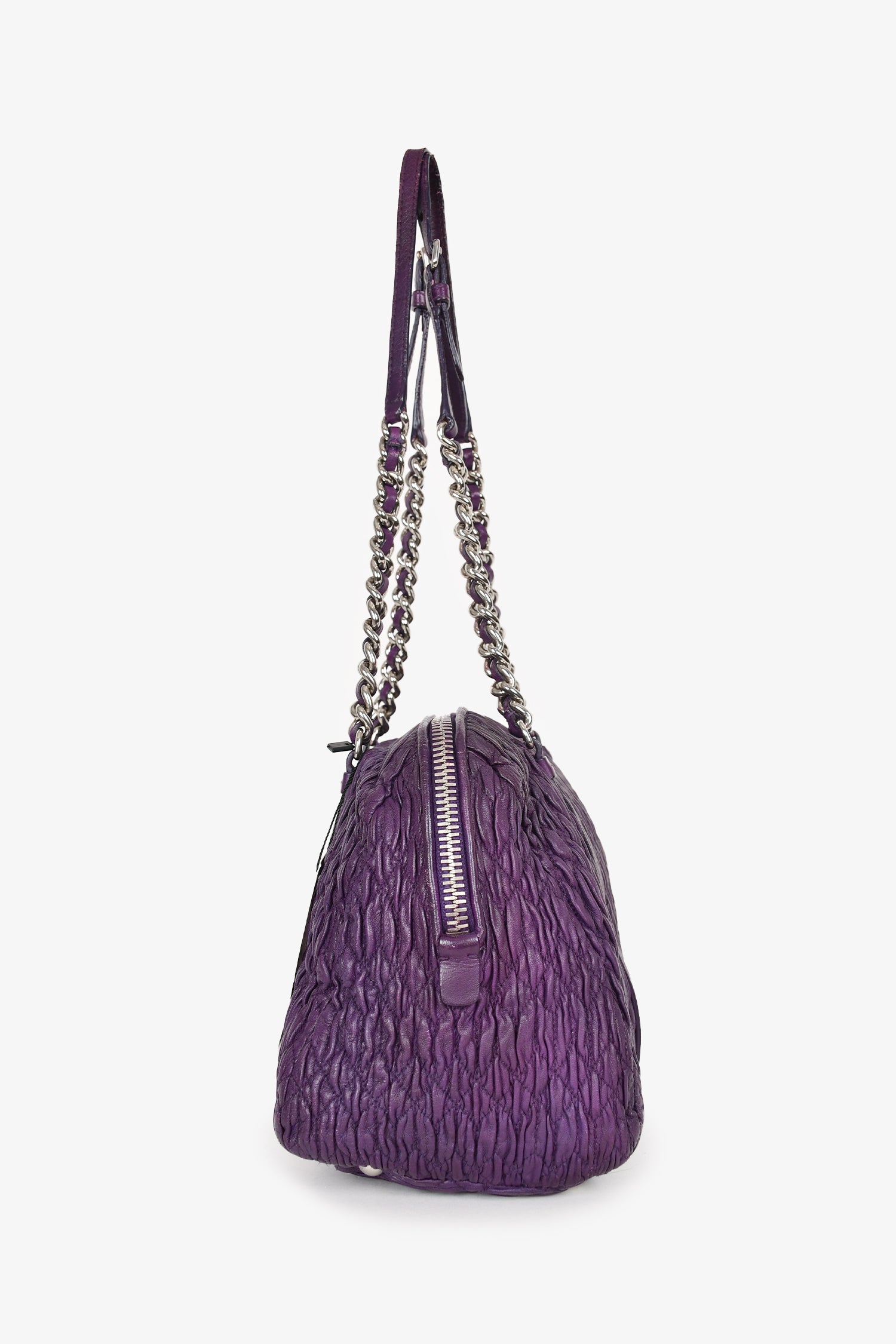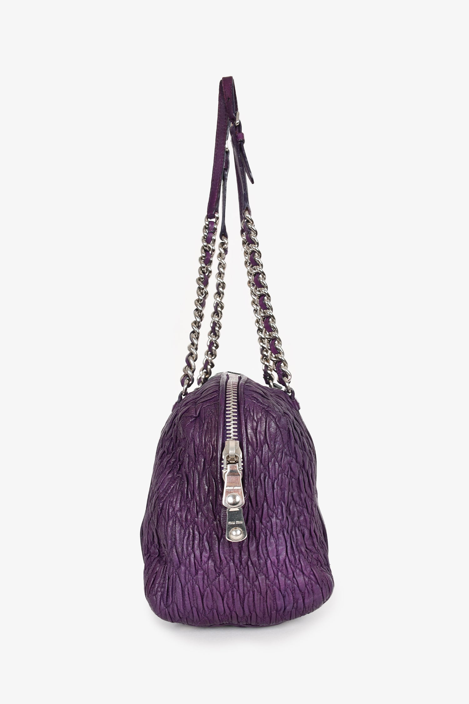 Refresh availabilityMiu Miu Purple Leather Matelasse Bag. Top zip closure. Twin handles. 2 interior wall slip pockets. 1 interior wall zip pocket. Silver-toned hardware. Tonal stitching.