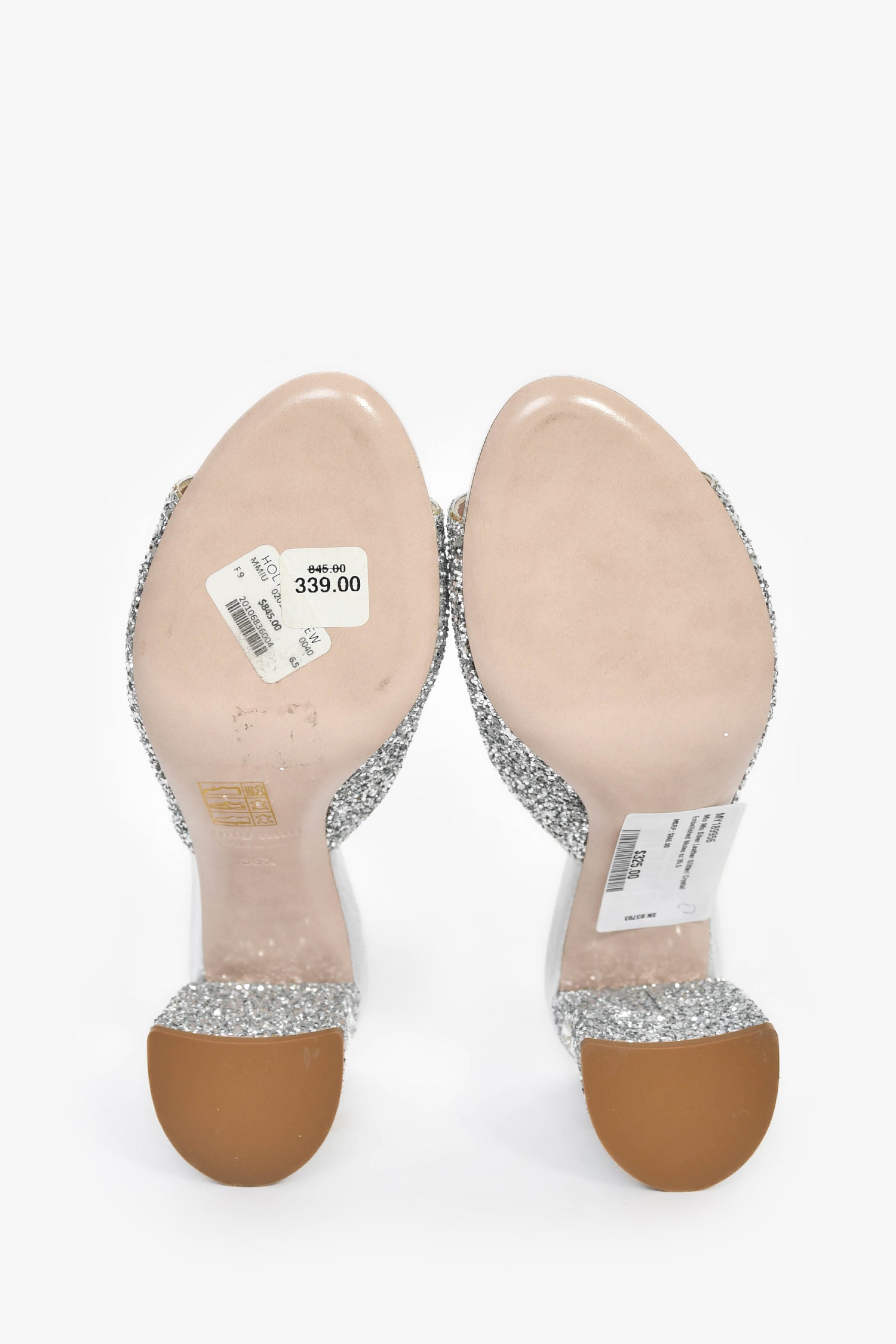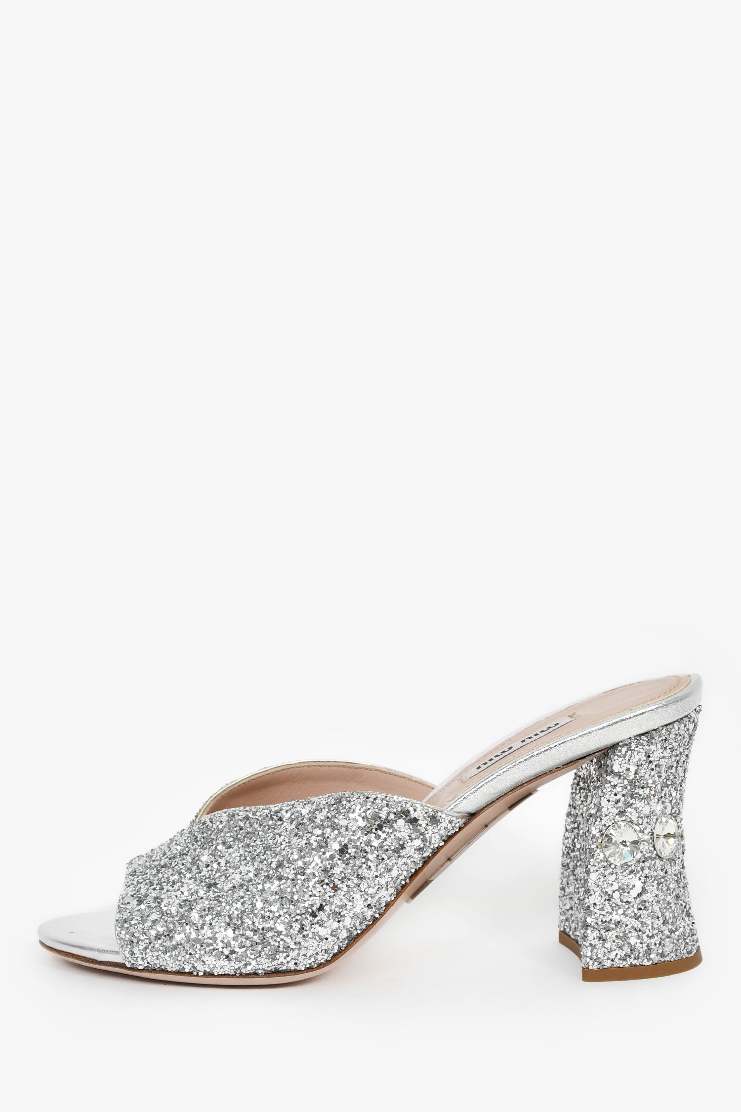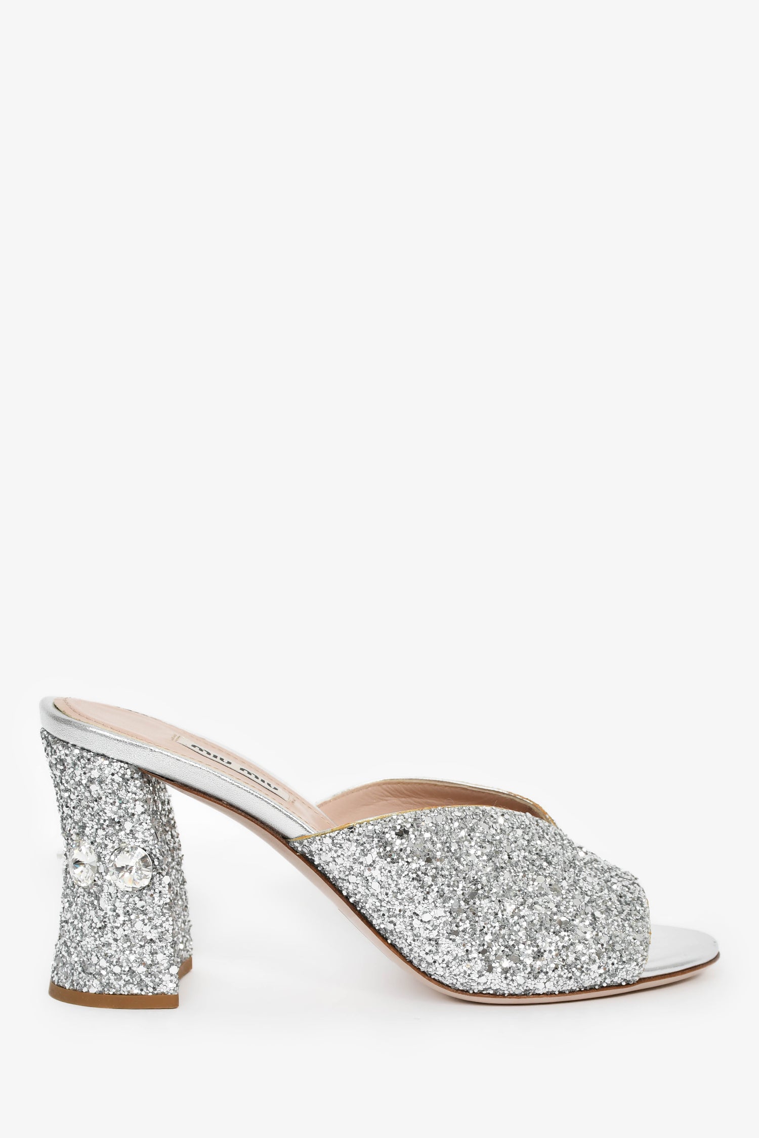 Refresh availabilityMiu Miu Silver Leather Glitter/ Crystal Embellished Mules. Pointed peep toes. Leather insoles. Silver-tone hardware. Tonal stitching.
