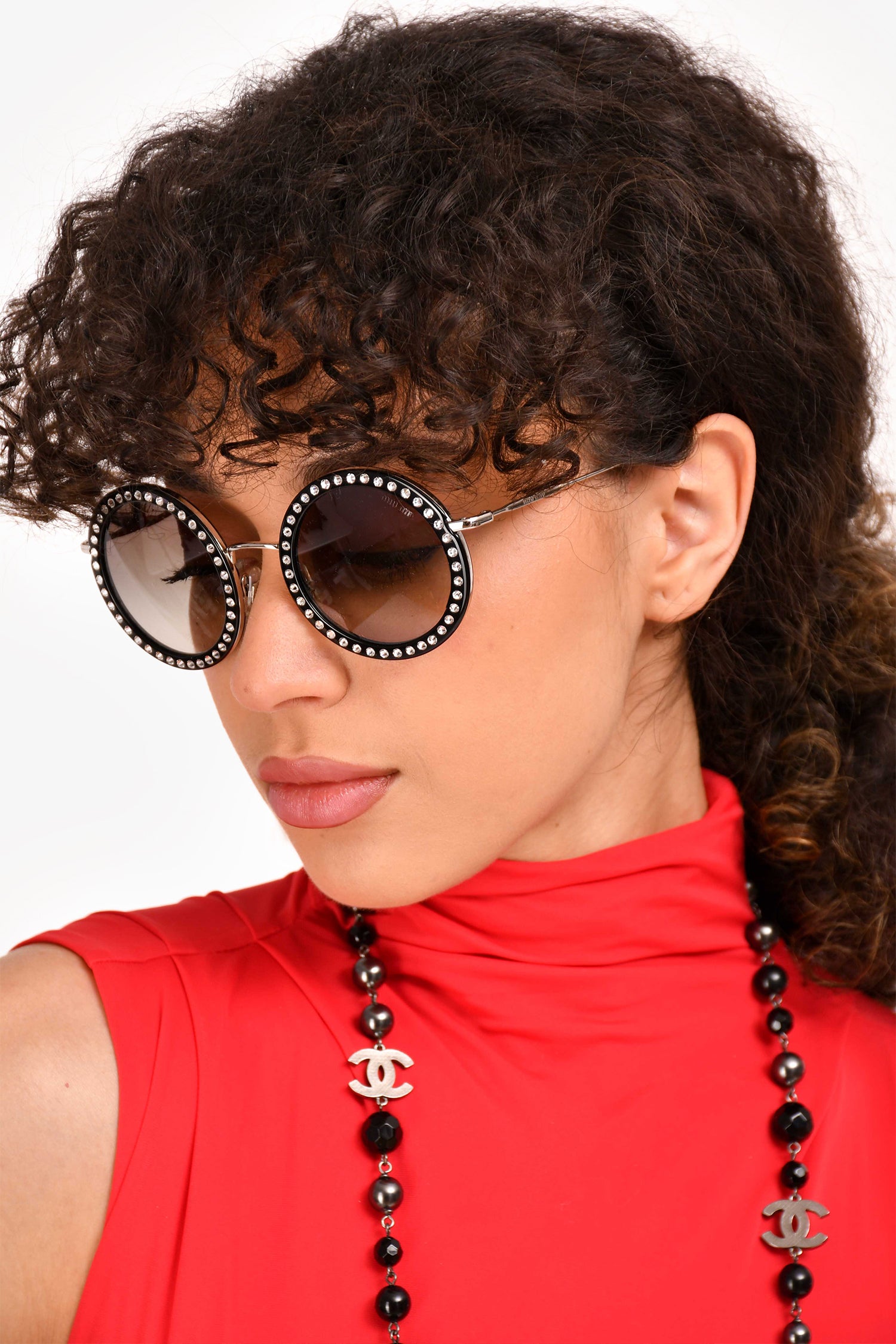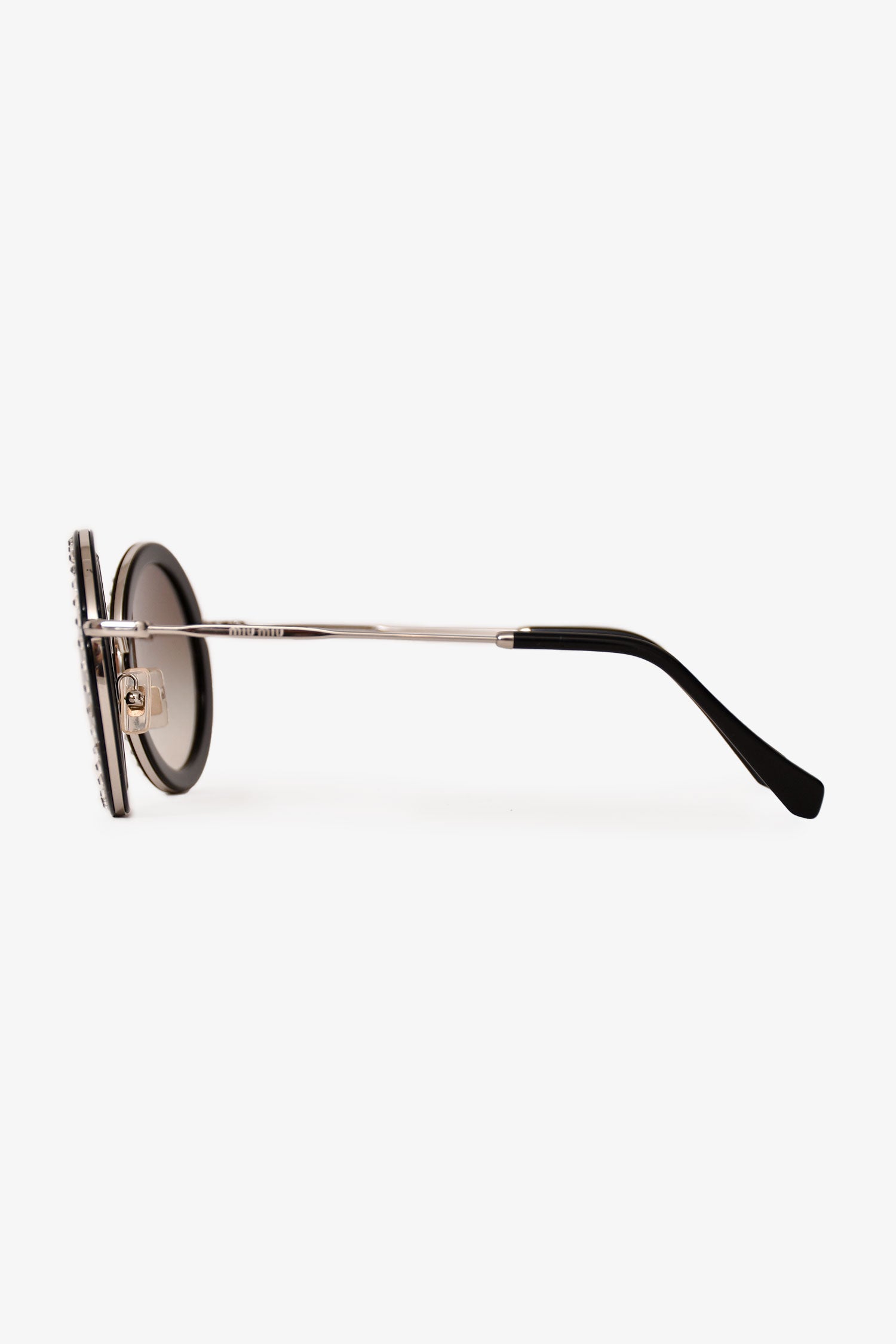 Refresh availabilityMiu Miu Silver Tone/Black Acrylic Crystal Embellished Round Sunglasses. Adjustable nose pads. Silver-tone hardware.