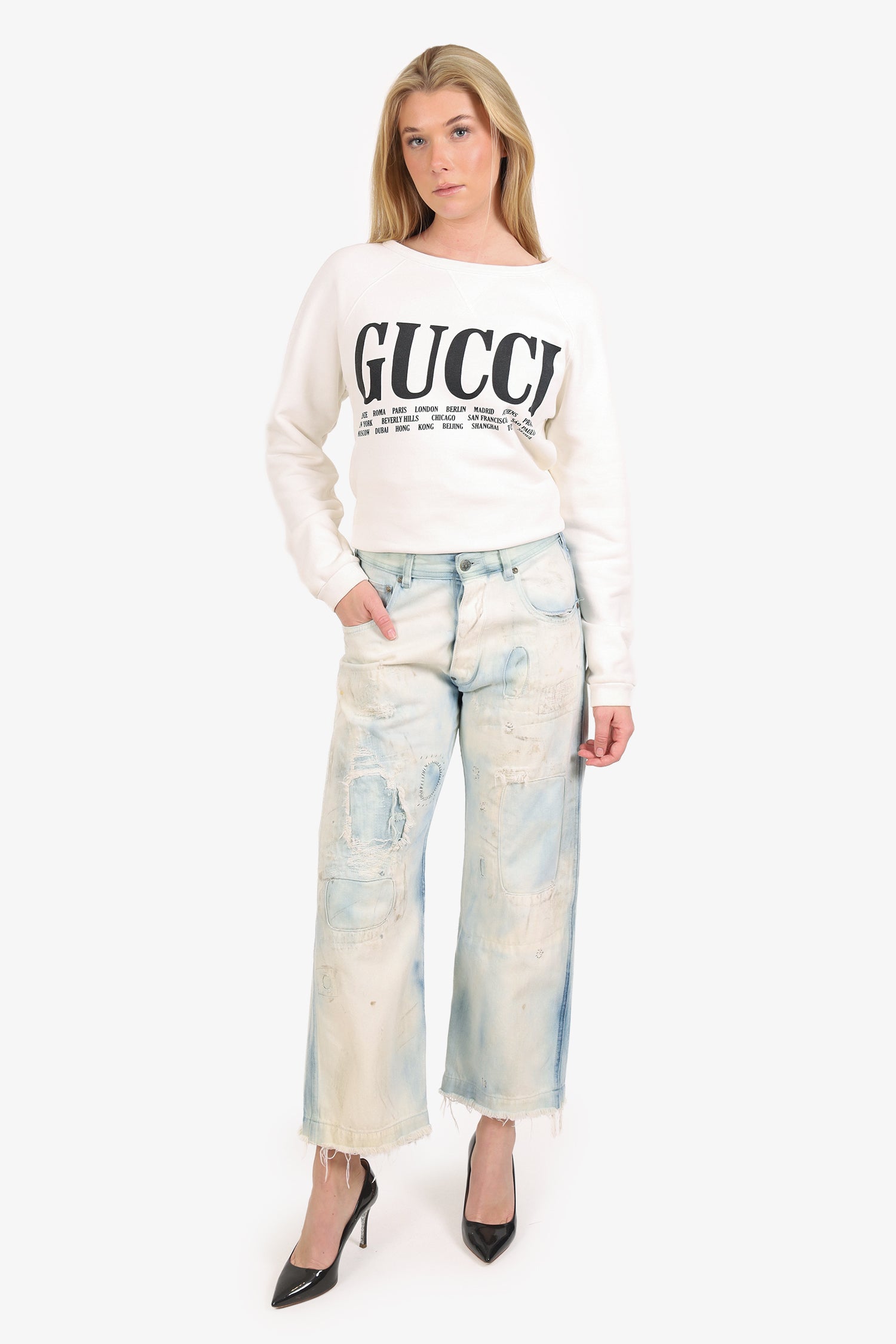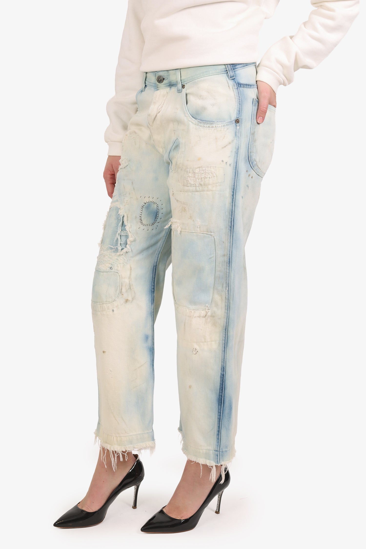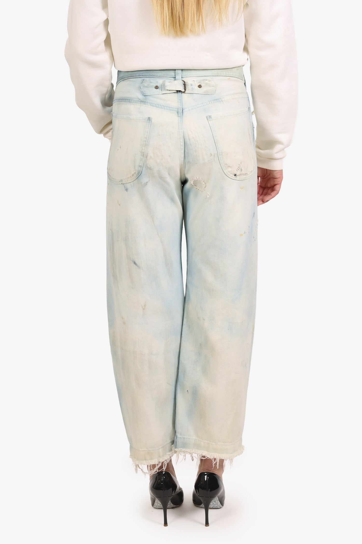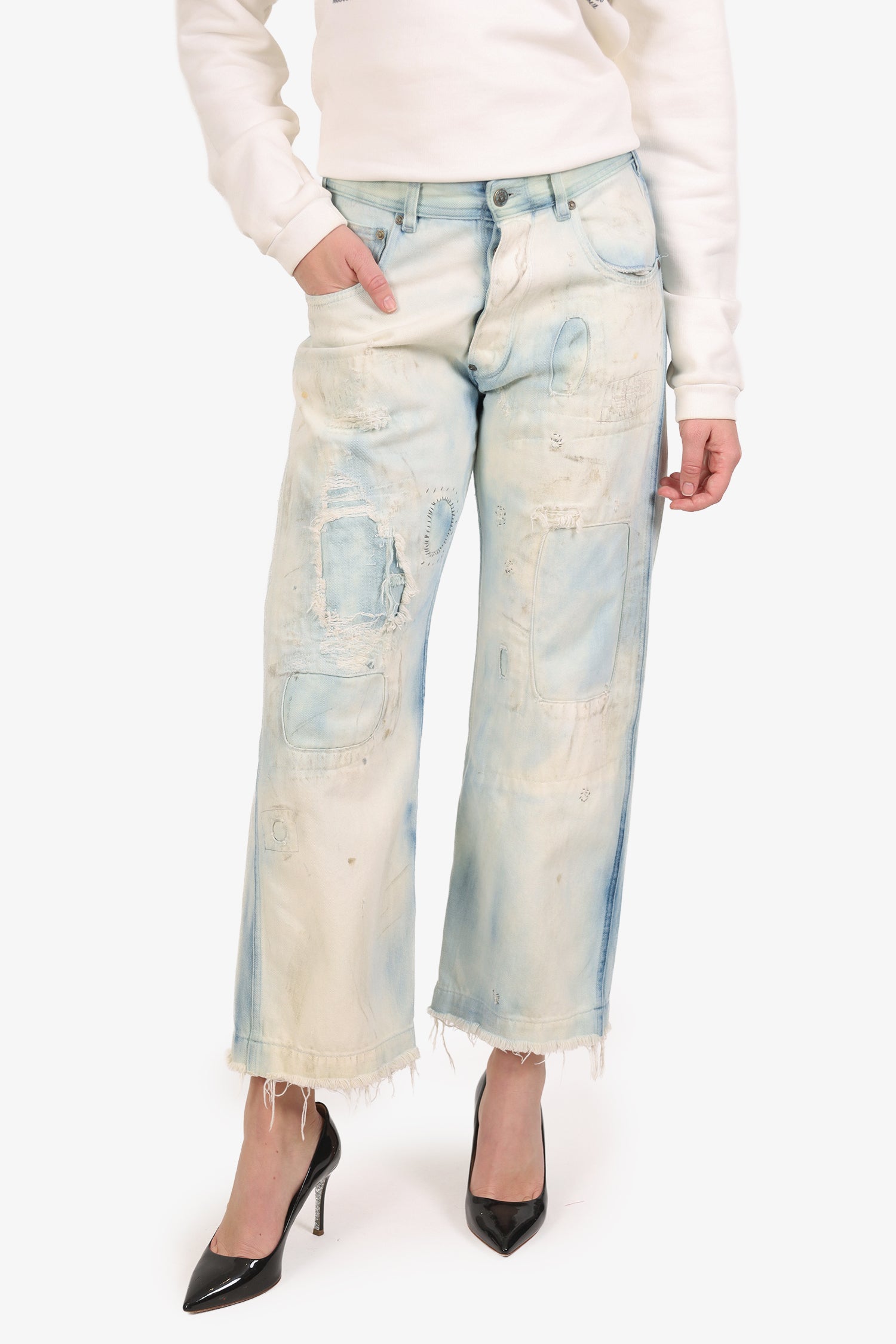 Refresh availabilityMM6 Maison Margiela Blue Denim Distressed Jeans. Slip on. Front zip with button-up closure. Waistband belt-loops. Adjustable pull-through buckle closure to rear. 5 exterior pockets; 2 front slip, 1 mini compartment, and 2 rear slip. Brass-tone hardware. Tonal stitching.