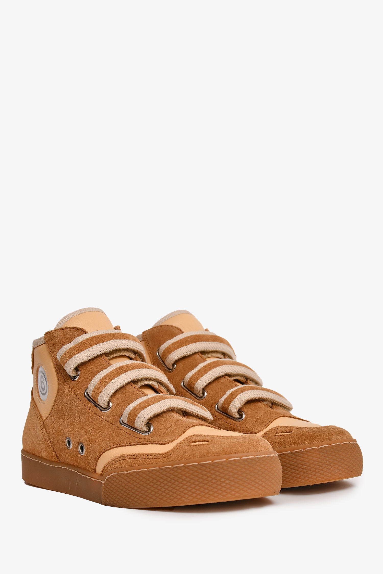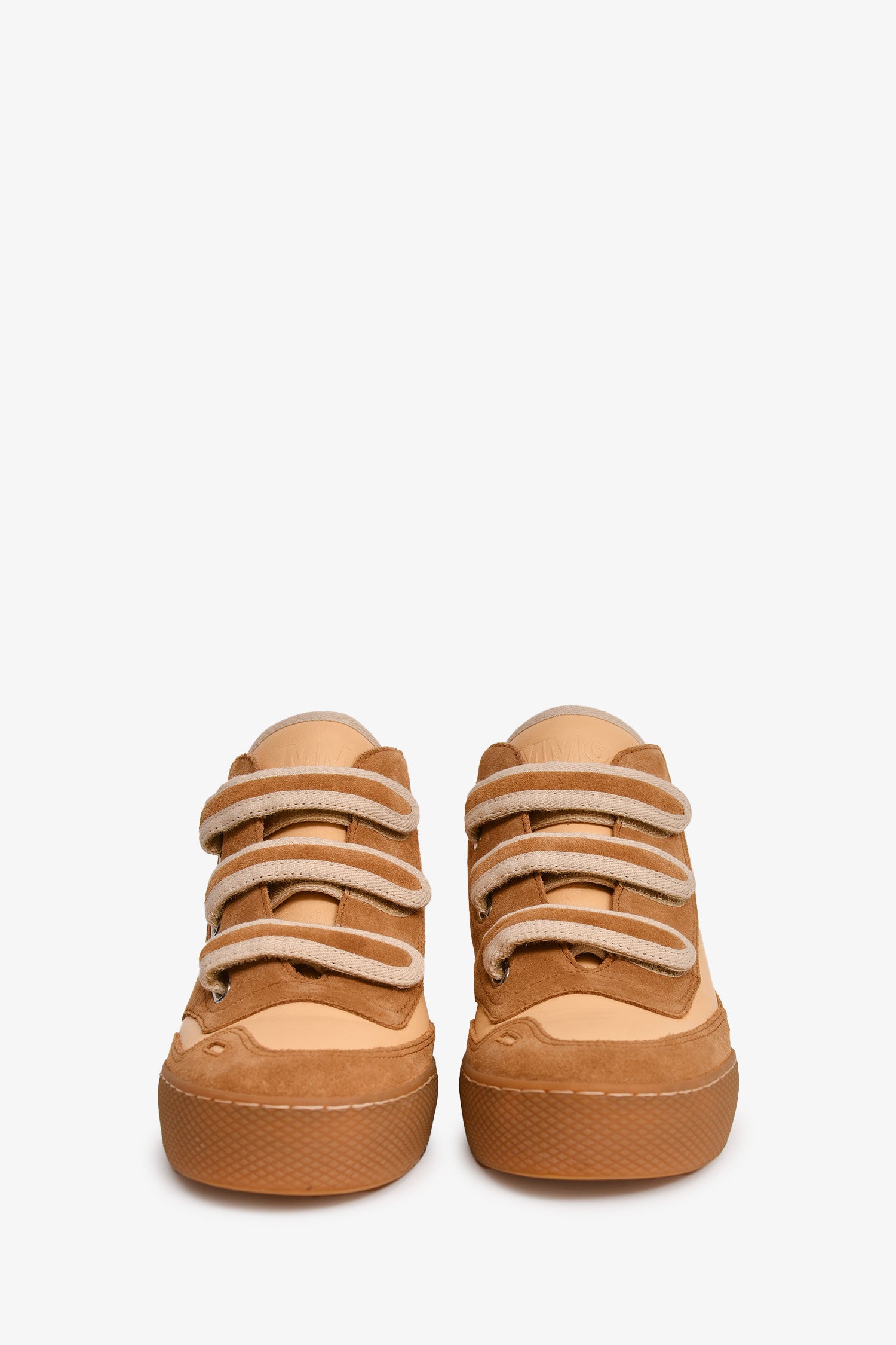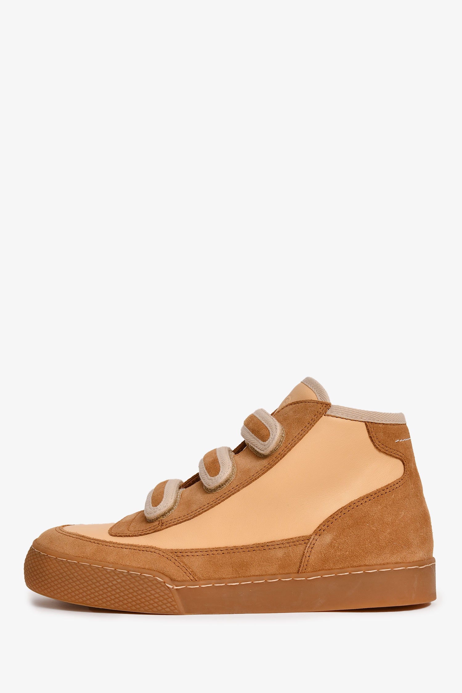 Refresh availabilityMM6 Maison Margiela Brown Suede/Leather High Top Sneakers. Top velcro closure. Silver-tone hardware. Side '6' detailing. Tonal stitching.