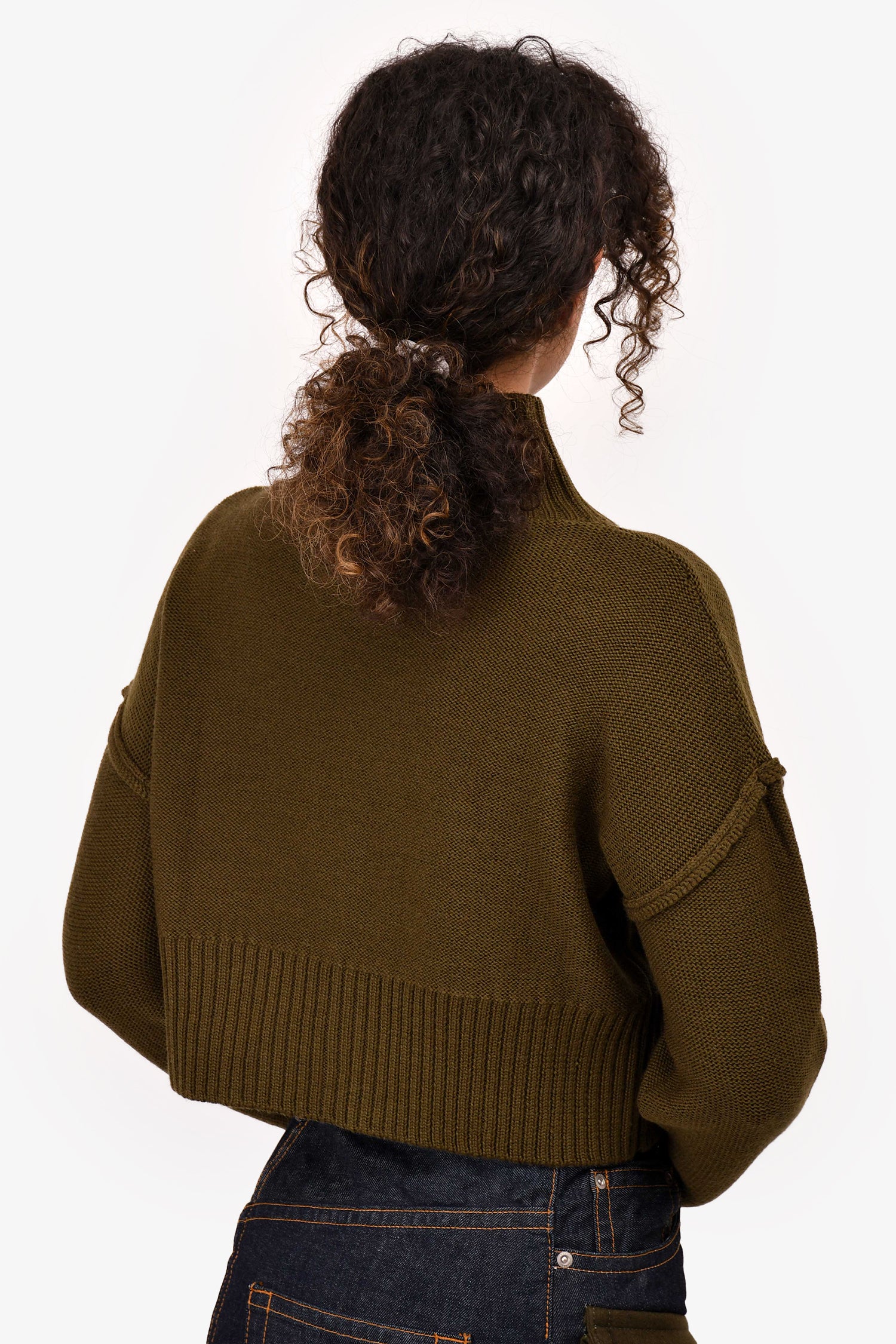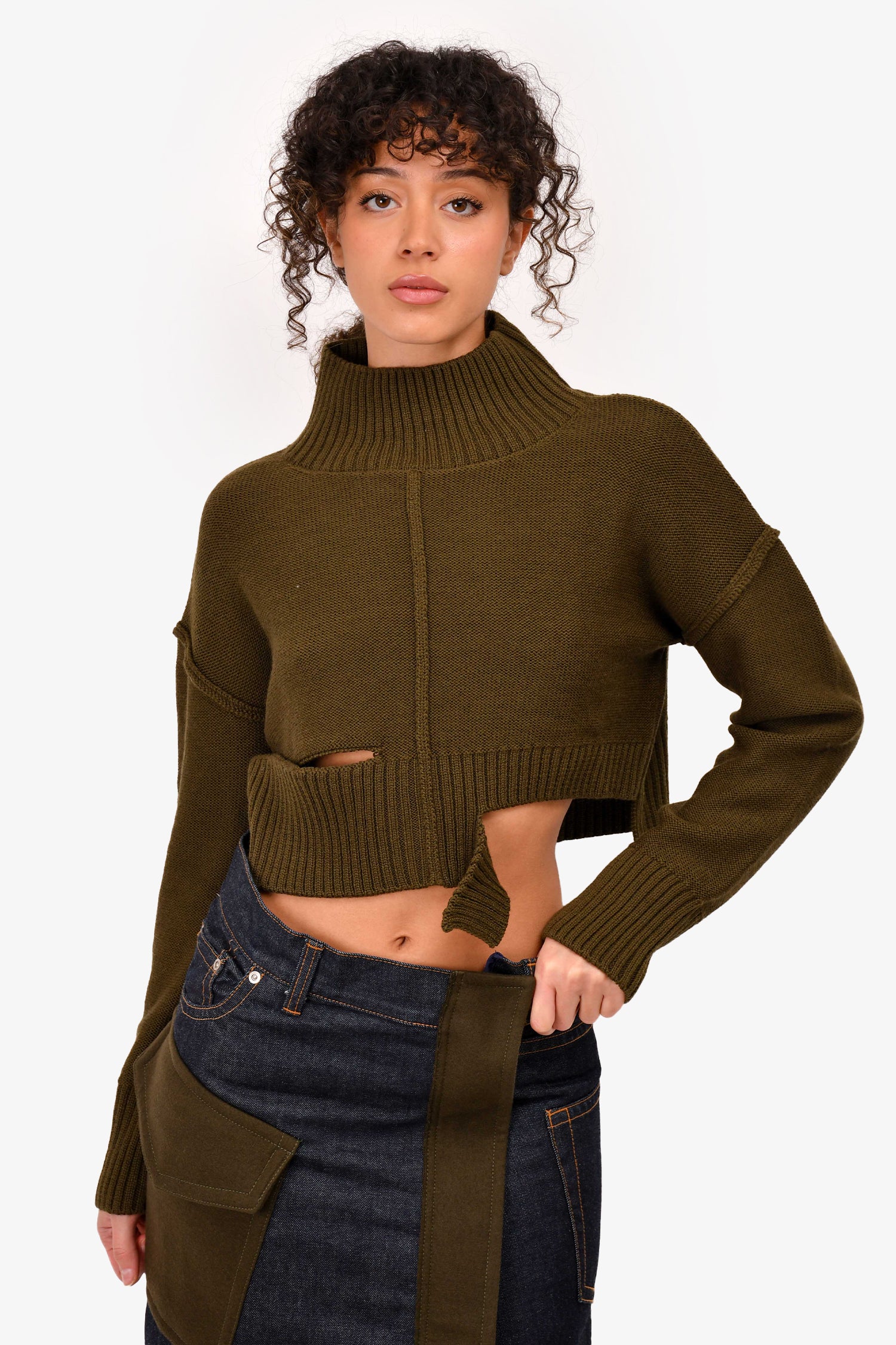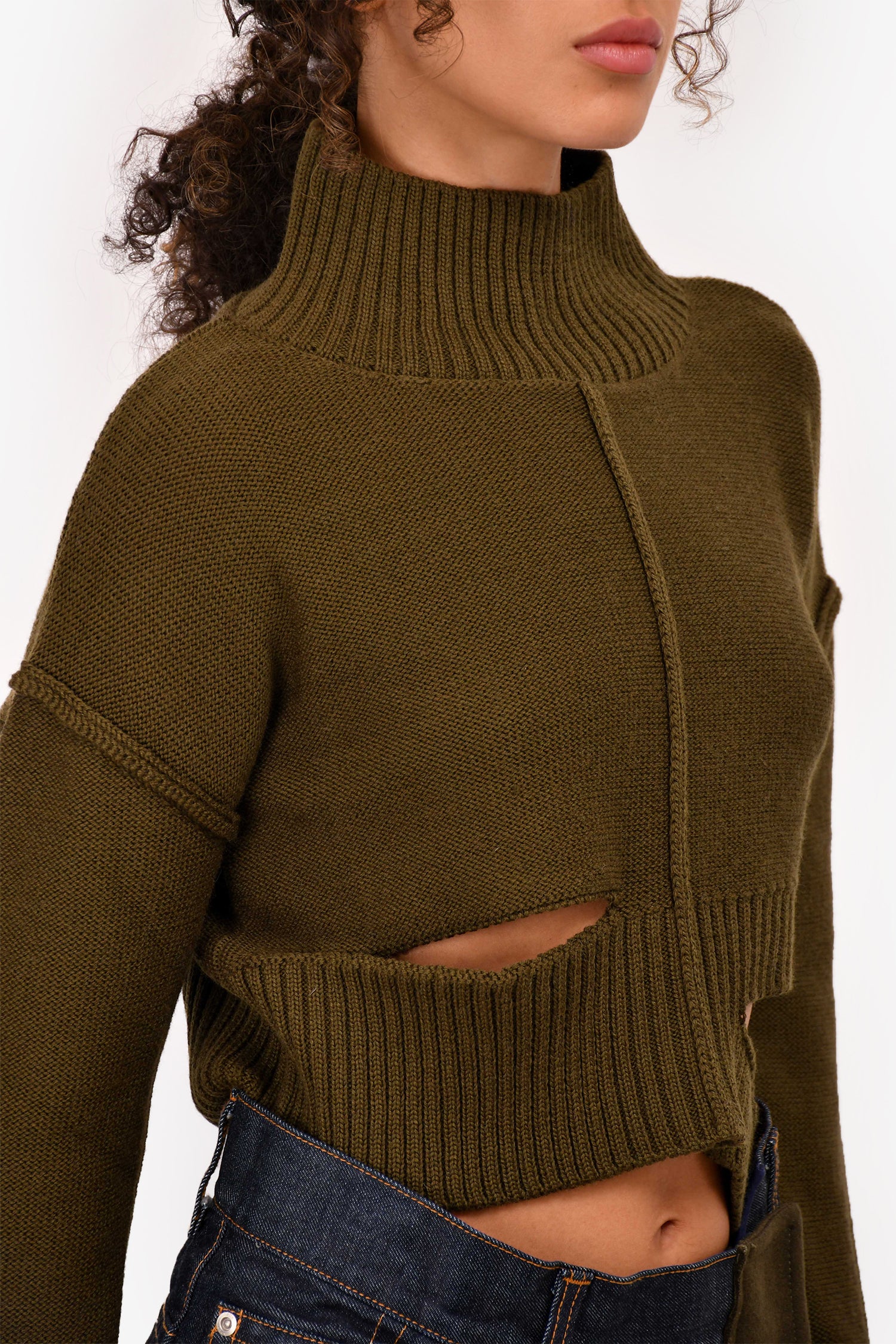 Refresh availabilityMM6 Maison Margiela Dark Green Cropped Cut Out Sweater. Long sleeves. Ribbed collar, sleeves, and waistband. Tonal stitching.