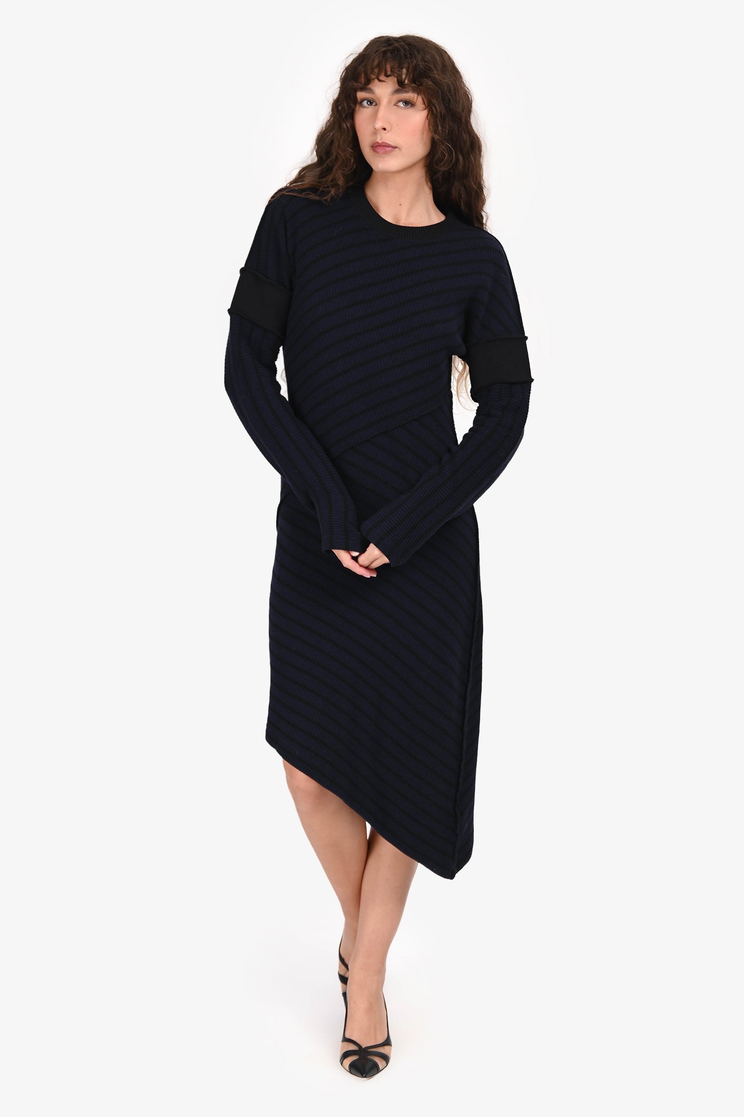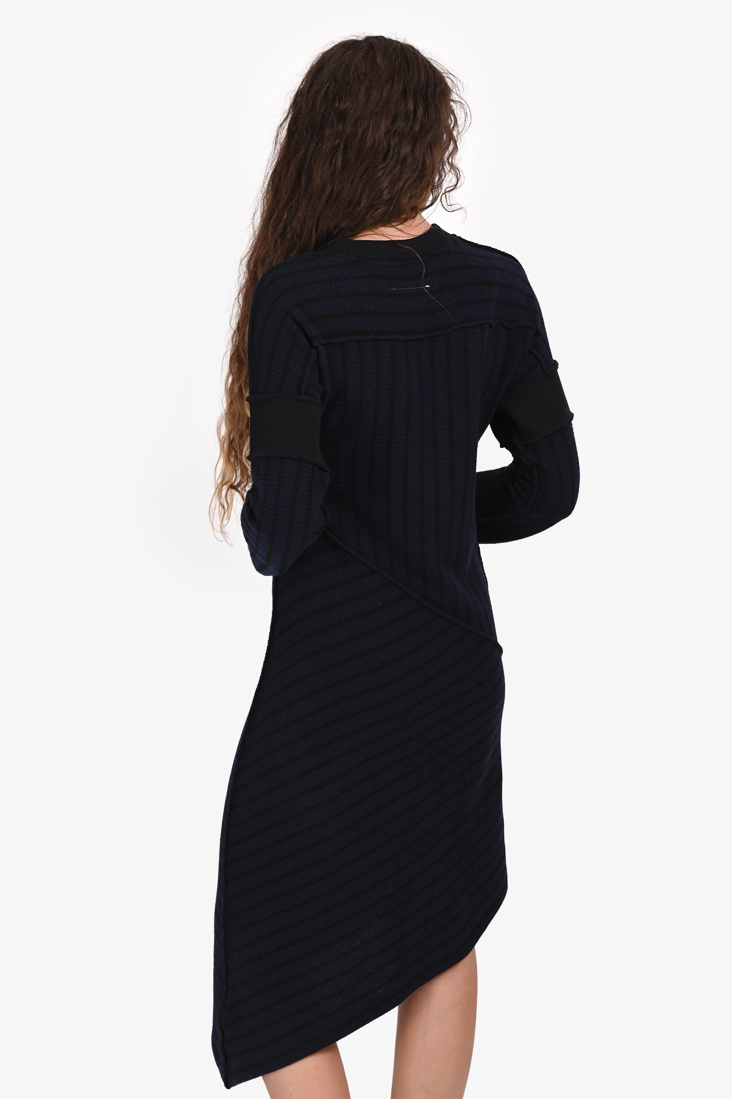 Refresh availabilityMM6 Maison Margiela Navy/Black Wool Striped Midi Dress. Pull-on. Round neckline. Ribbed neck, cuffs, and hem. Tonal stitching.
