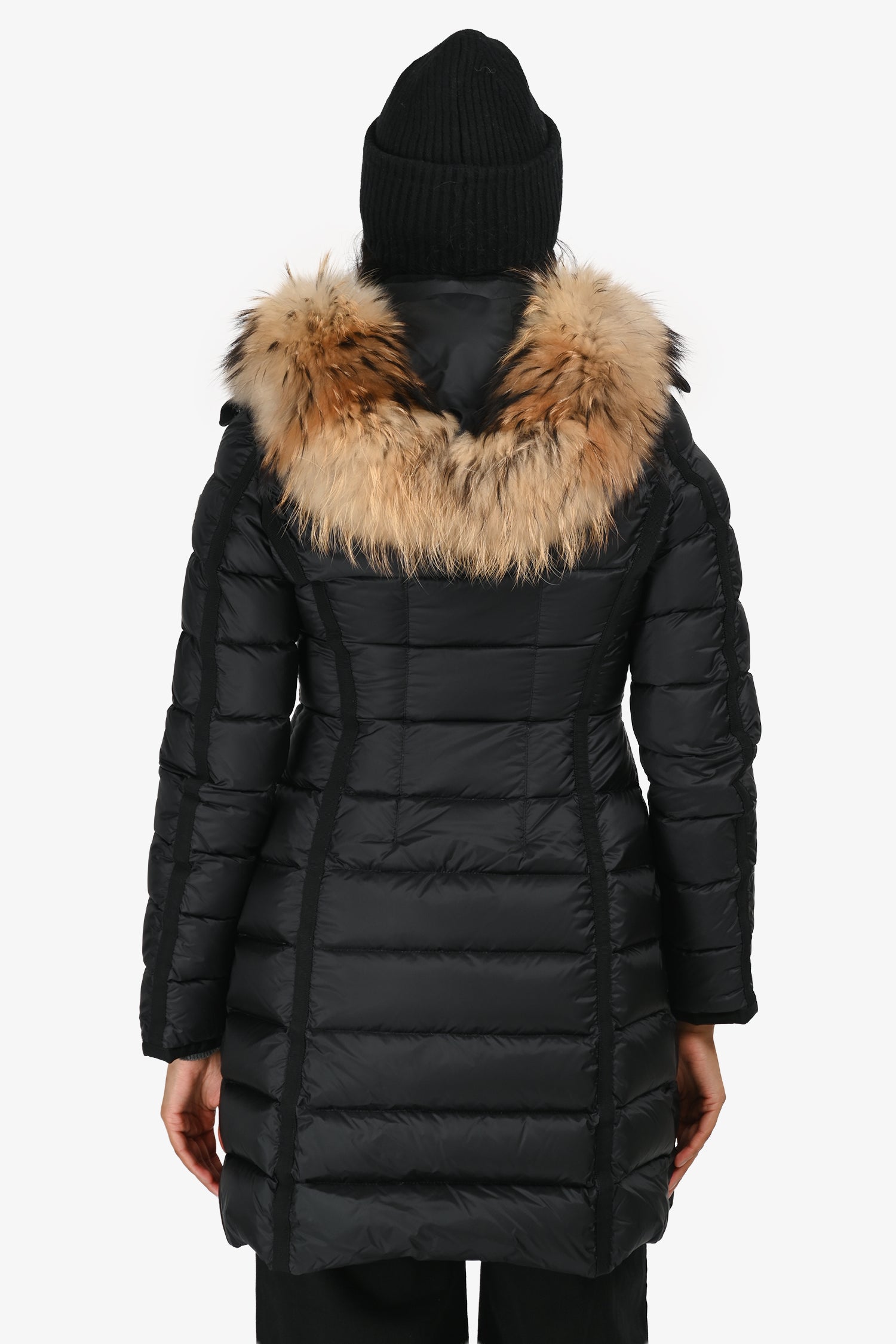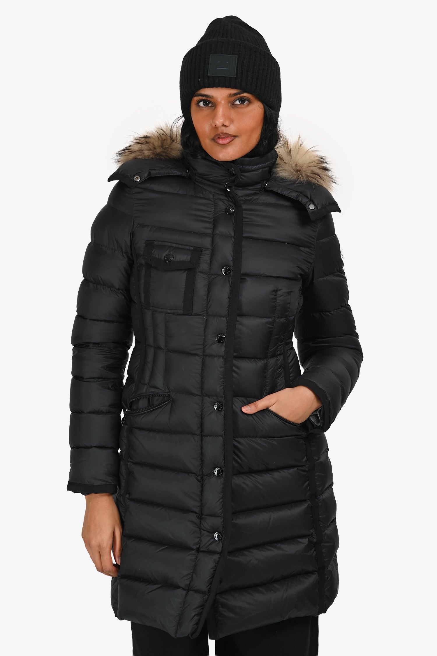 Refresh availabilityMoncler Black Down Hirmafur Raccoon Trim Mid Length Coat. Slip-on. Front zip closure with snap placket. Removable adjustable hood with raccoon fur trim. 2 exterior zip pockets. 1 exterior patch pocket with flap and snap button closure. Drawstring waistband. Silver-tone hardware. Tonal stitching.