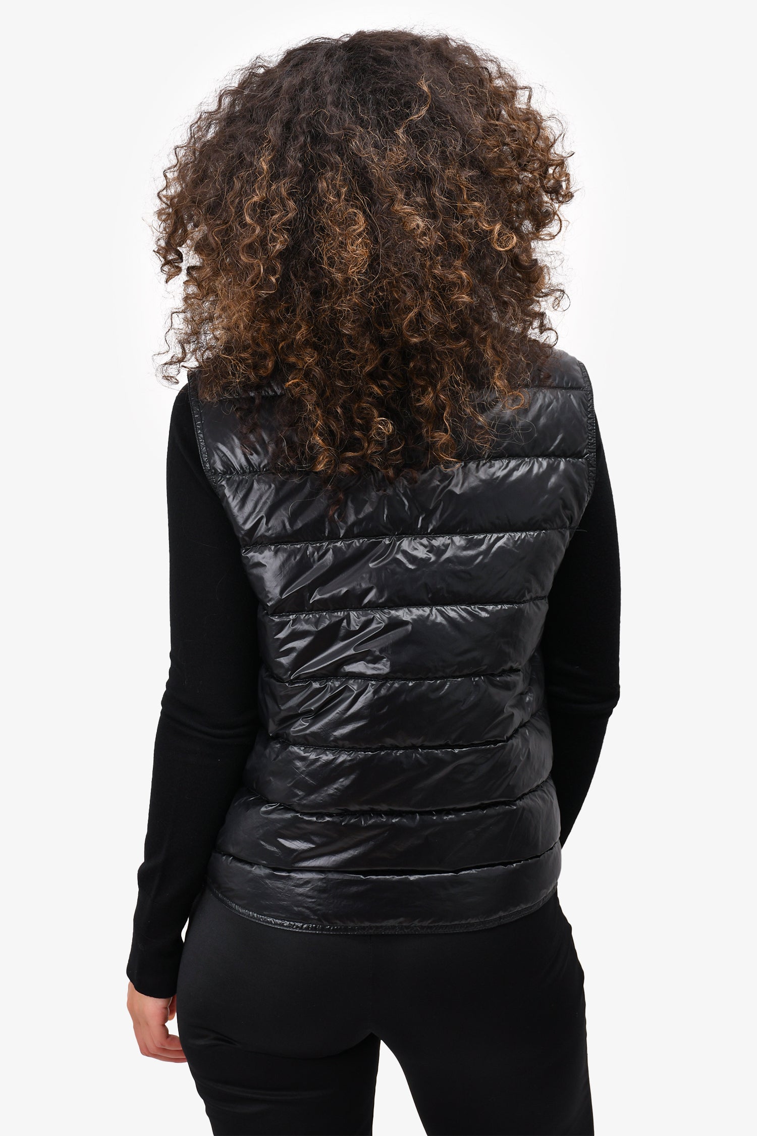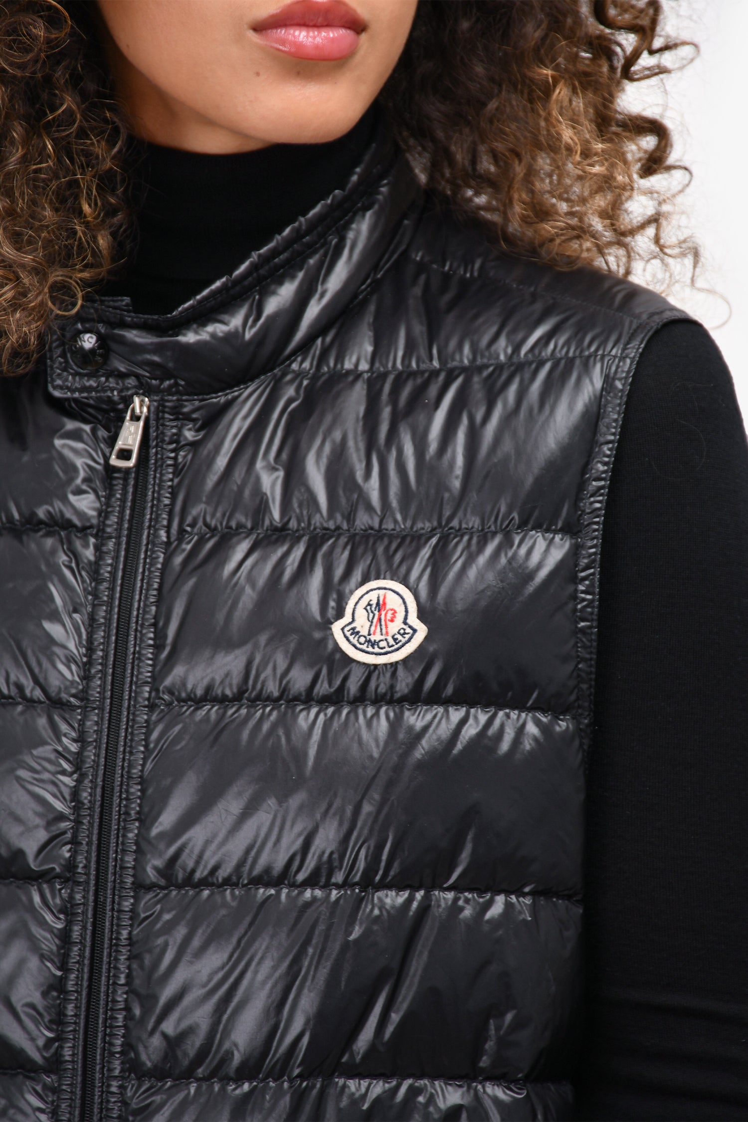 Refresh availabilityMoncler Black Down Puffer Vest. Front two-way zip closure. Front zip pockets. Front brand logo patch.