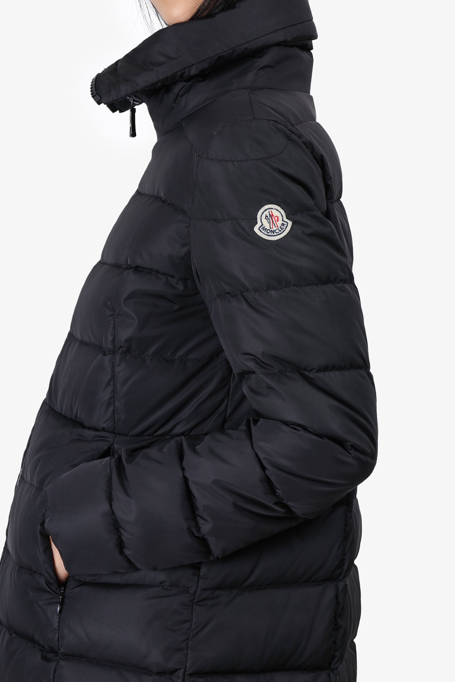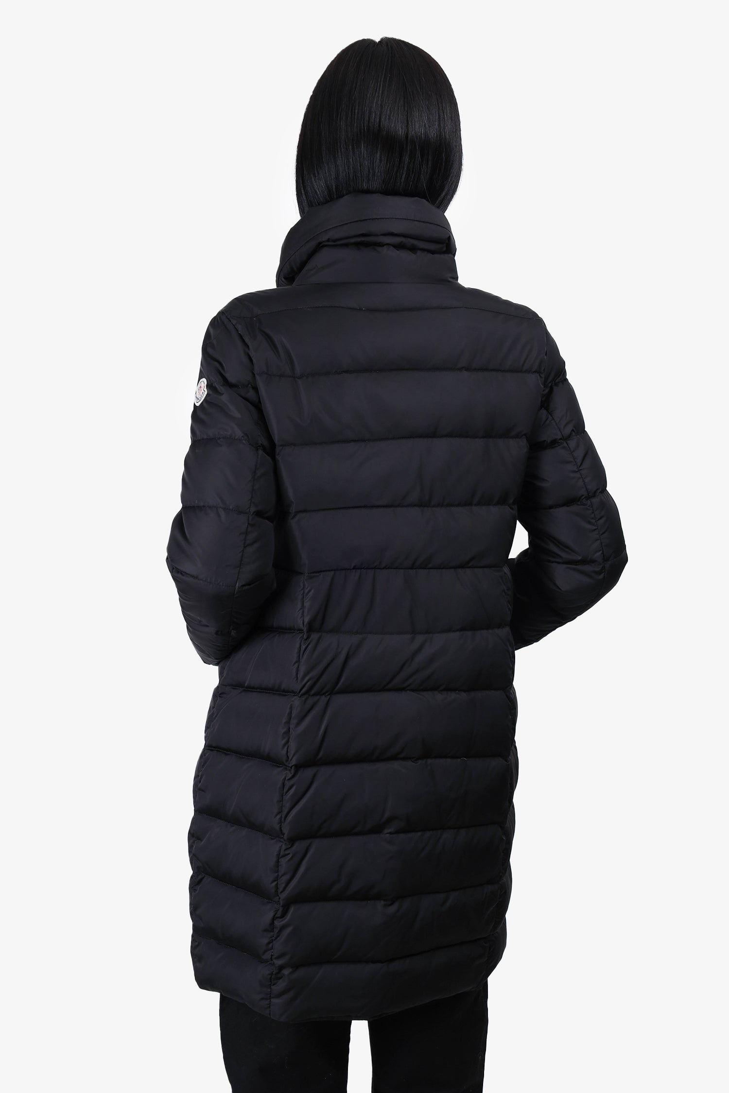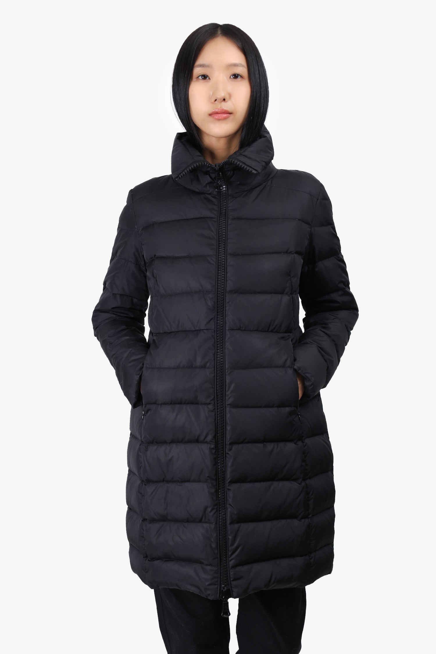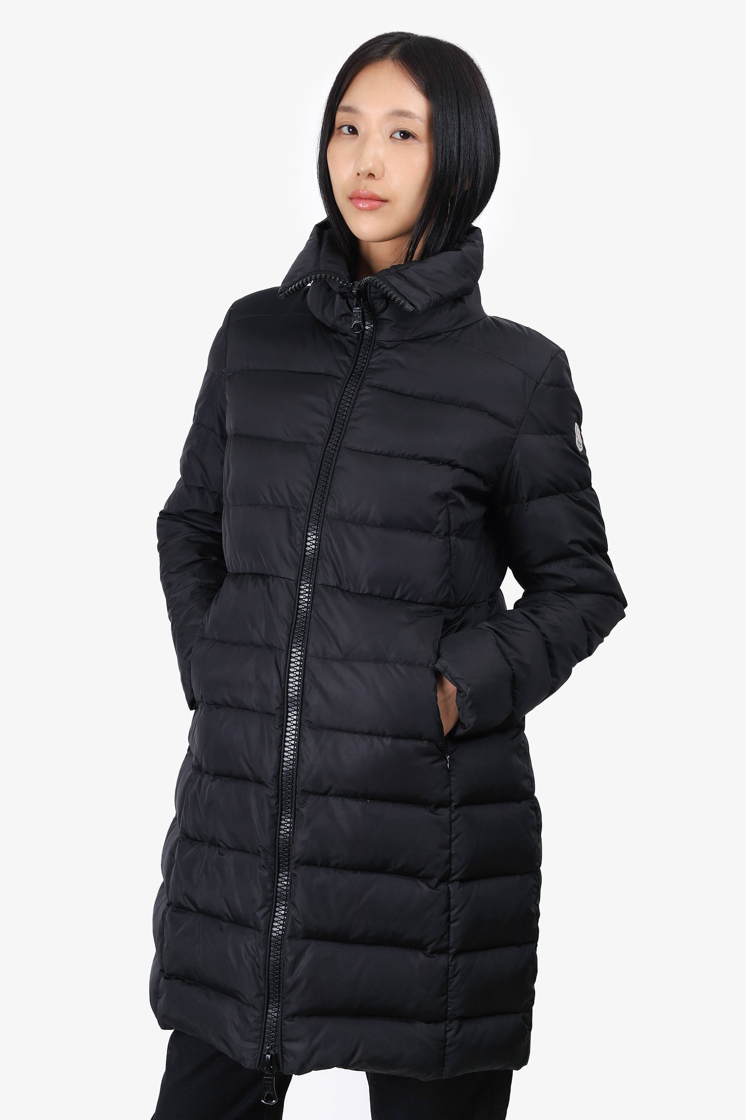 Refresh availabilityMoncler Black Down Quilted Puffer Coat. Front double ended zip closure. High neckline. 2 front pockets with zip closure.