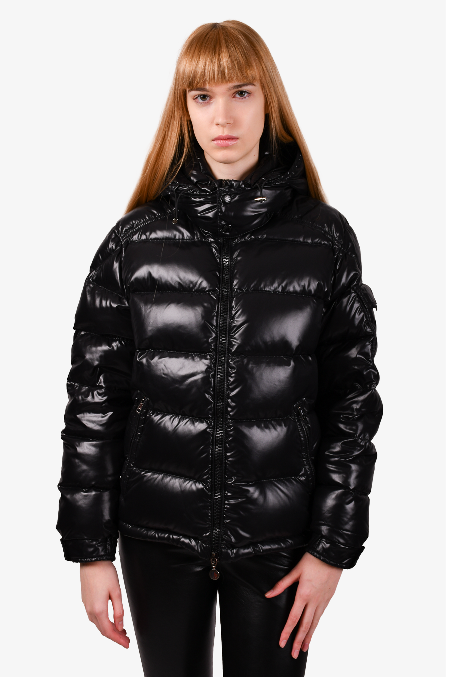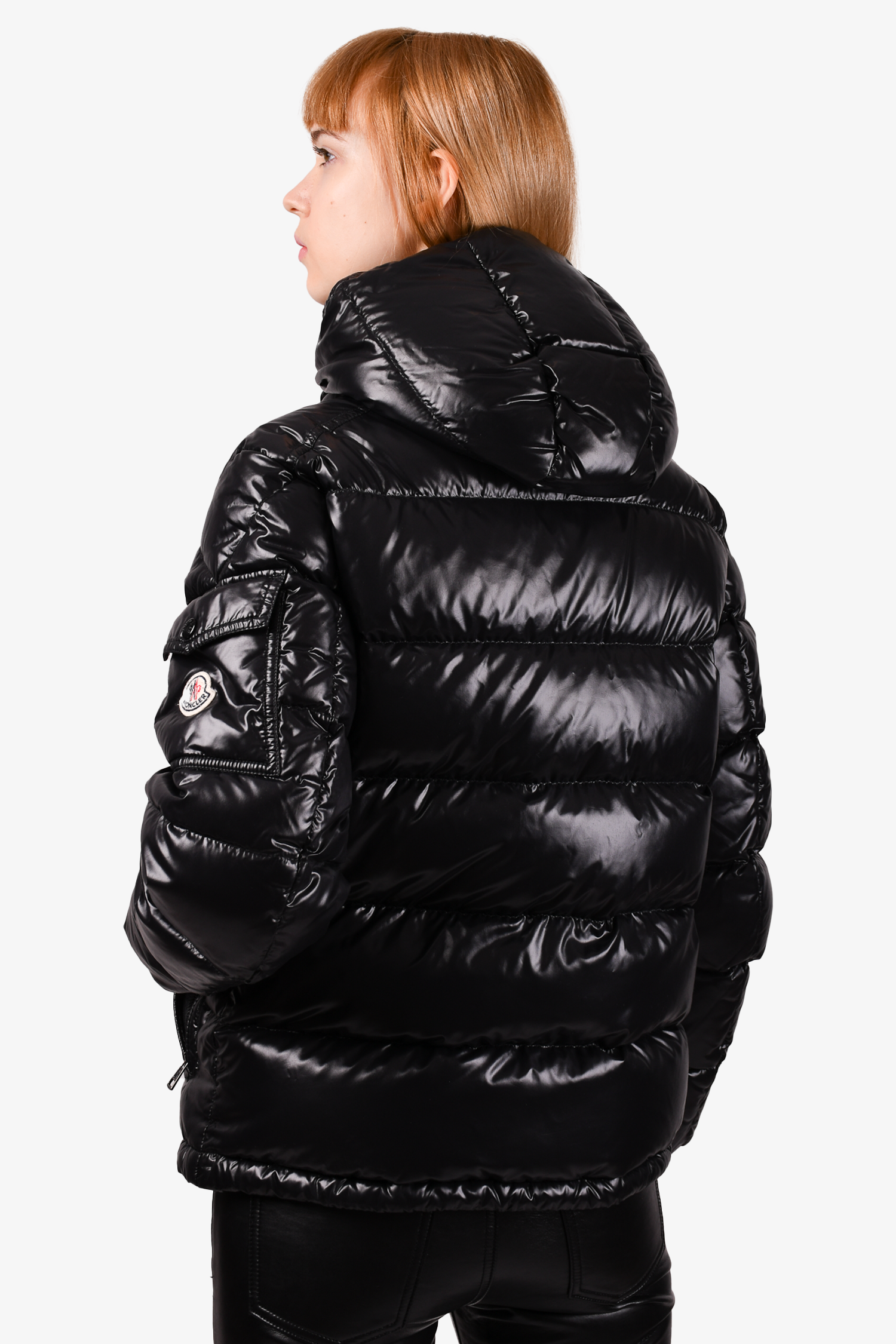 Refresh availabilityMoncler Black 'Maya Giubbotto' Hooded Down Jacket. 2 front pockets with zip closure. Elasticized hood. Shoulder patch-pocket with button closure. Grey lined interior. Tonal stitching.