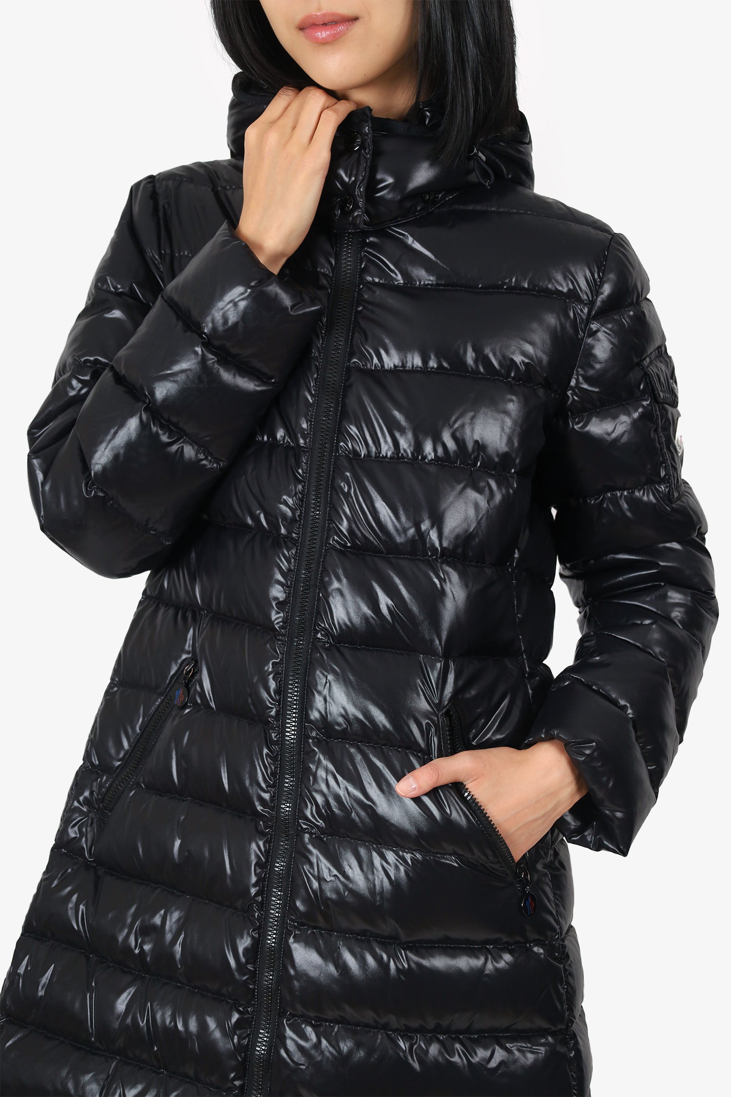 Refresh availabilityMoncler Black Nylon Blend Hooded Moka Down Puffer Coat. Pull-on. Front zip-closure. Detachable hood with snap-button closure. 2 exterior front zip pockets. 1 exterior side sleeve pocket with snap closure. Tonal stitching.
