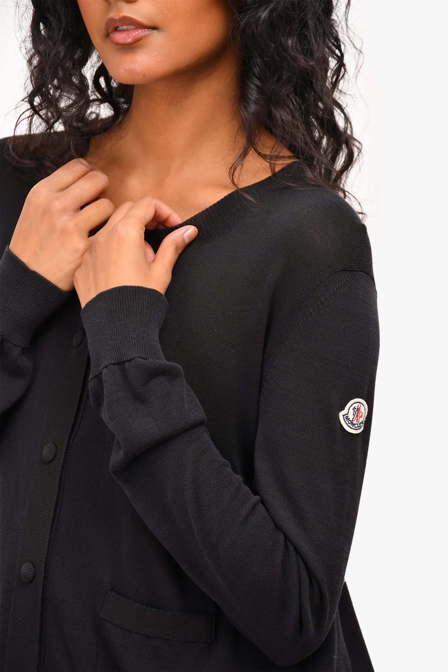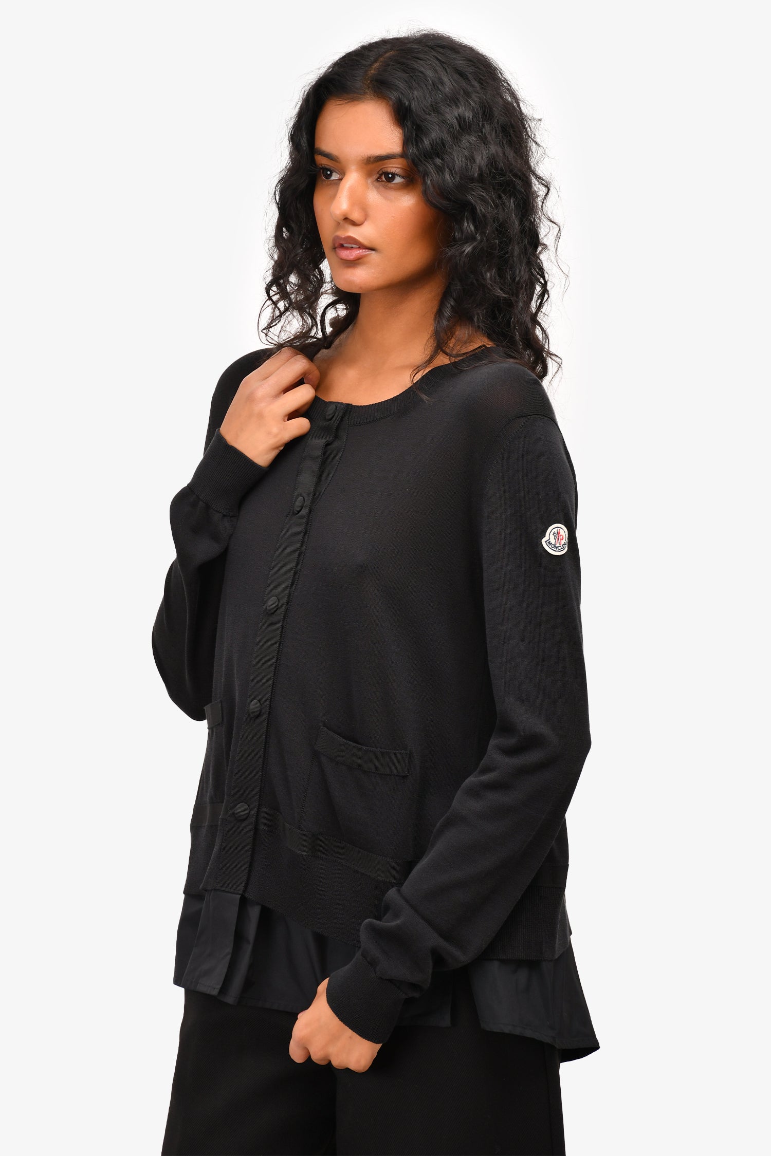 Refresh availabilityMoncler Black Nylon/Knit Button-Up Cardigan. Round neck. Front pockets. Ruffled hem trim. Brand logo patch on the left sleeve.