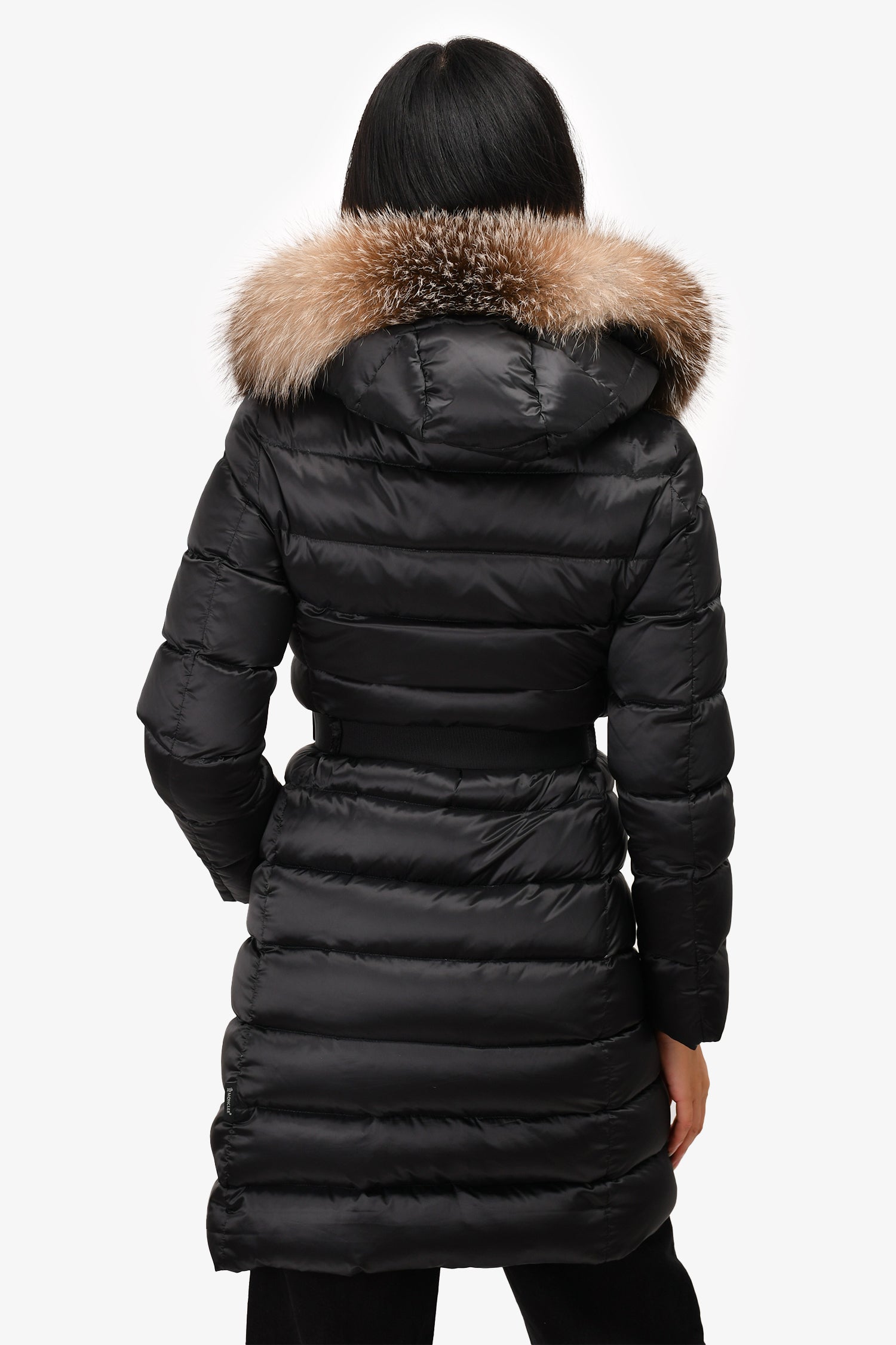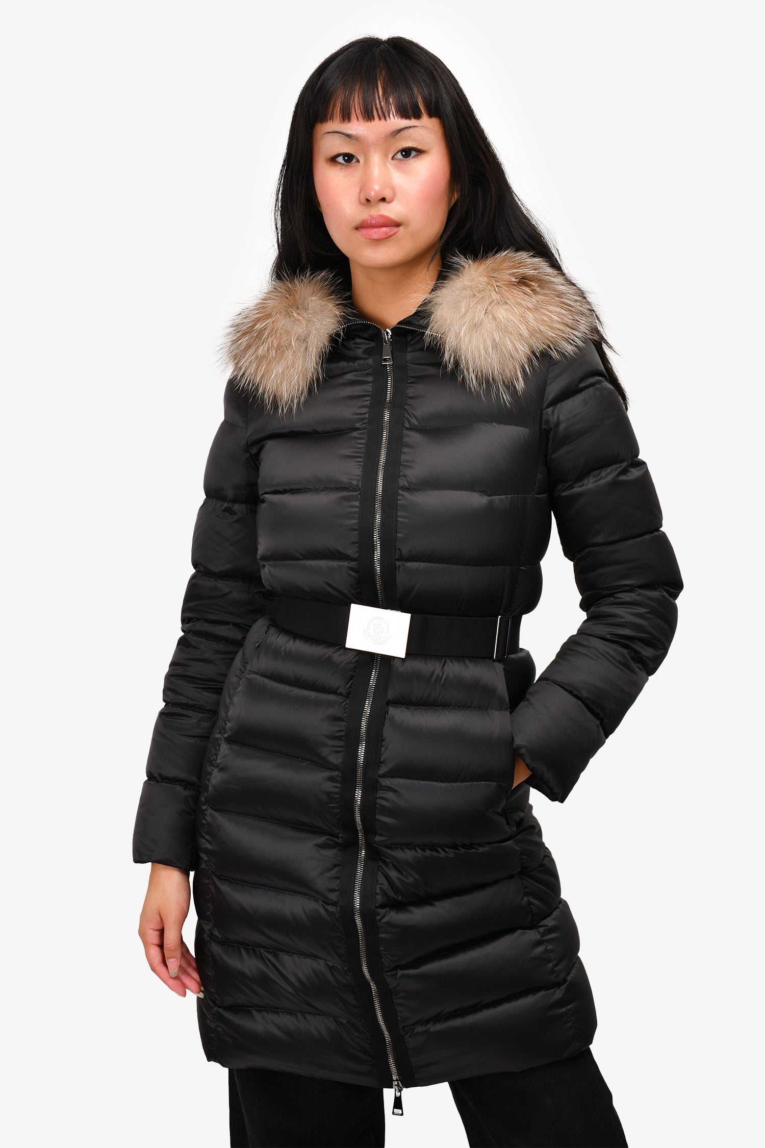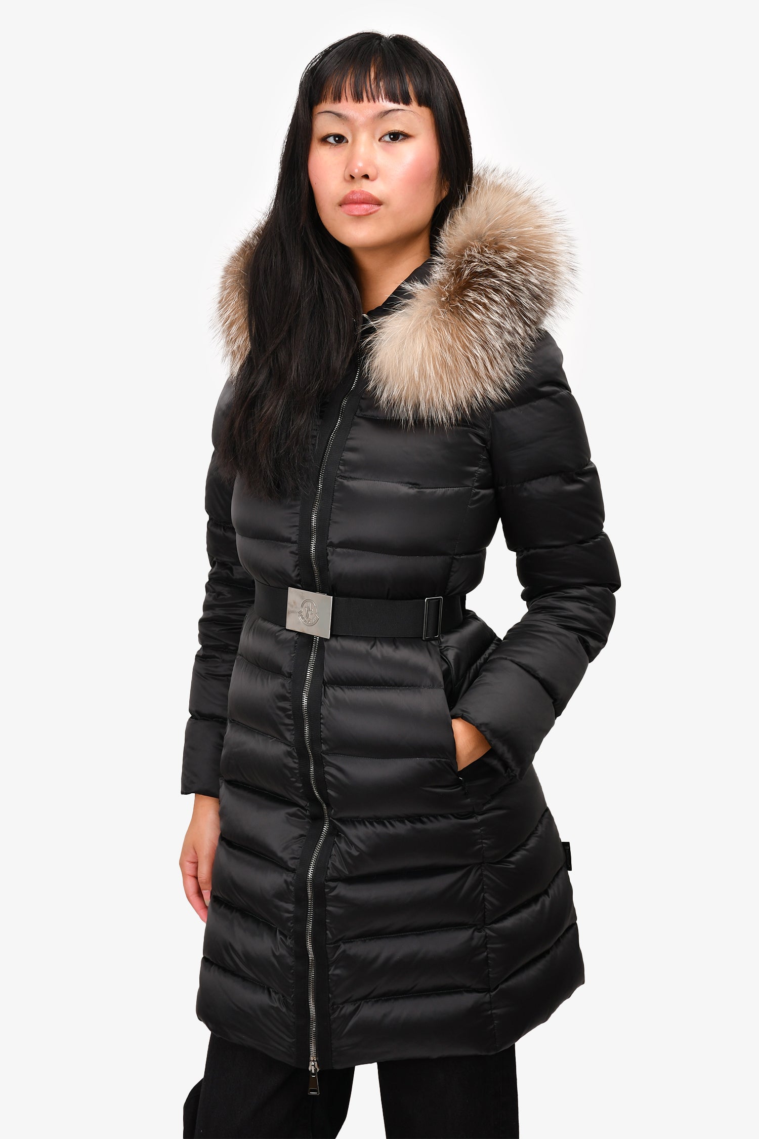 Refresh availabilityMoncler Black Tinuviel Giubbotto Fox Fur Hooded Down Coat. Front two-way zip closure. Front zip pockets. Detachable fur hood trim. Waist belt with buckle closure.