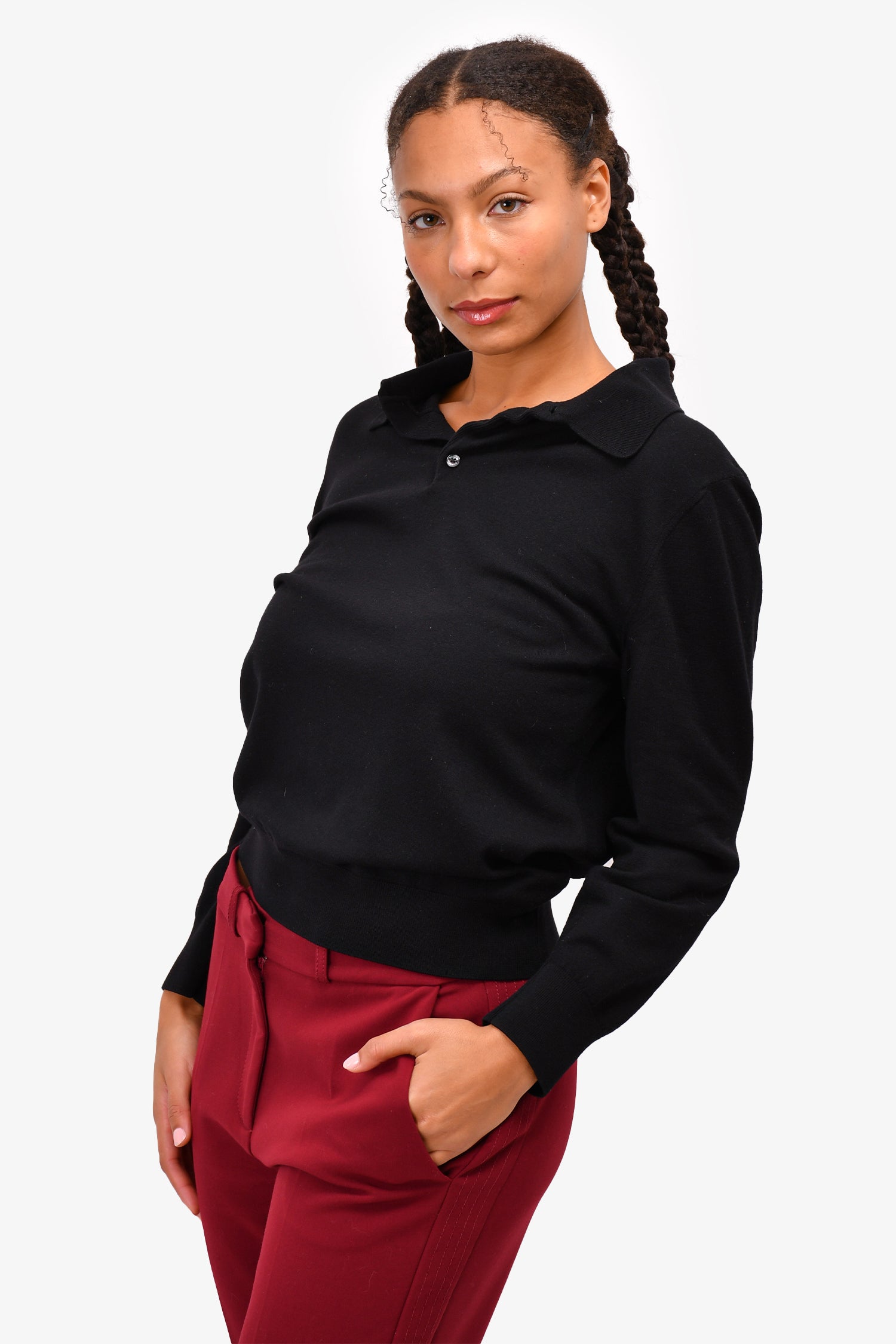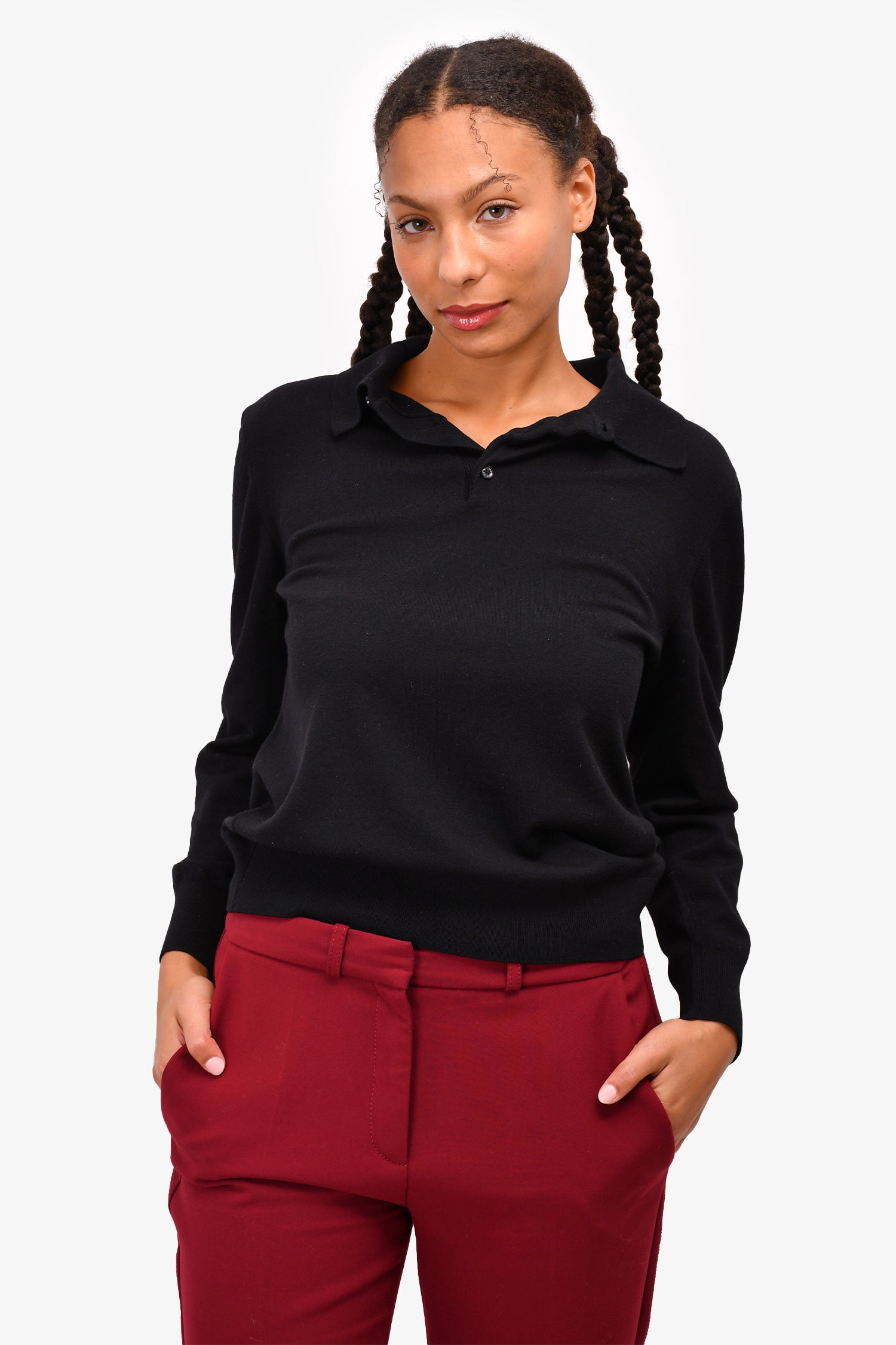 Refresh availabilityMoncler Black Virgin Wool Polo Tricot Sweater. Front button-up closure. Elasticized sleeve cuffs and bottom hem. Unlined. Tonal stitching.