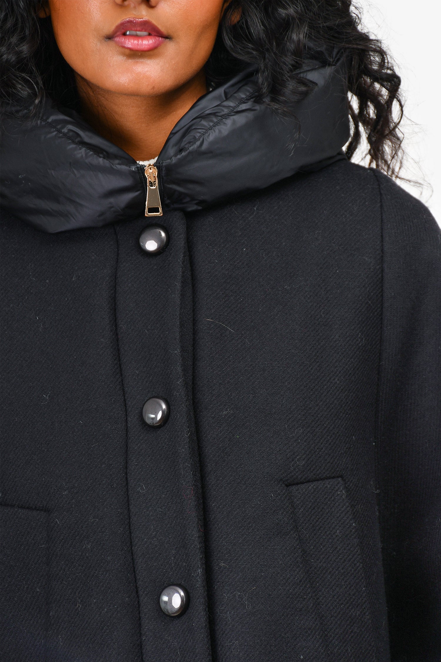 Refresh availabilityMoncler Black Wool Eudore Guibbotto 2 In 1 Down Jacket. Zipped fastening. Snap closures. Padded trimming. Nylon hood and sleeves Lined. Down filled. Tonal stitching.