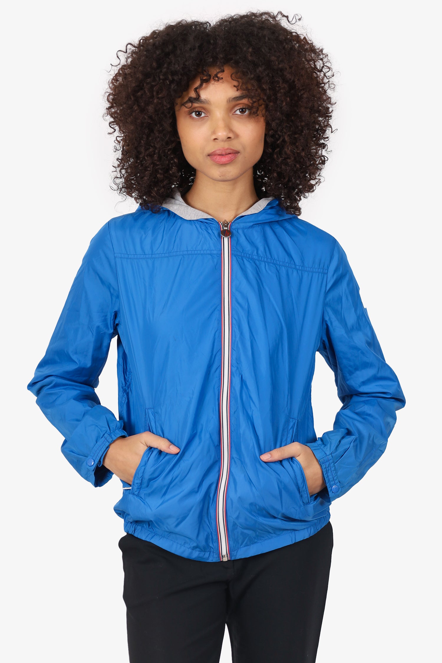 Refresh availabilityMoncler Blue Nylon Solid Woven Windbreaker. Pull on. Round neckline with hood. Front zip closure. 2 exterior front zip pockets. Snap buttons to sleeve cuffs. Lined interior. Silver-tone hardware. Tonal stitching.