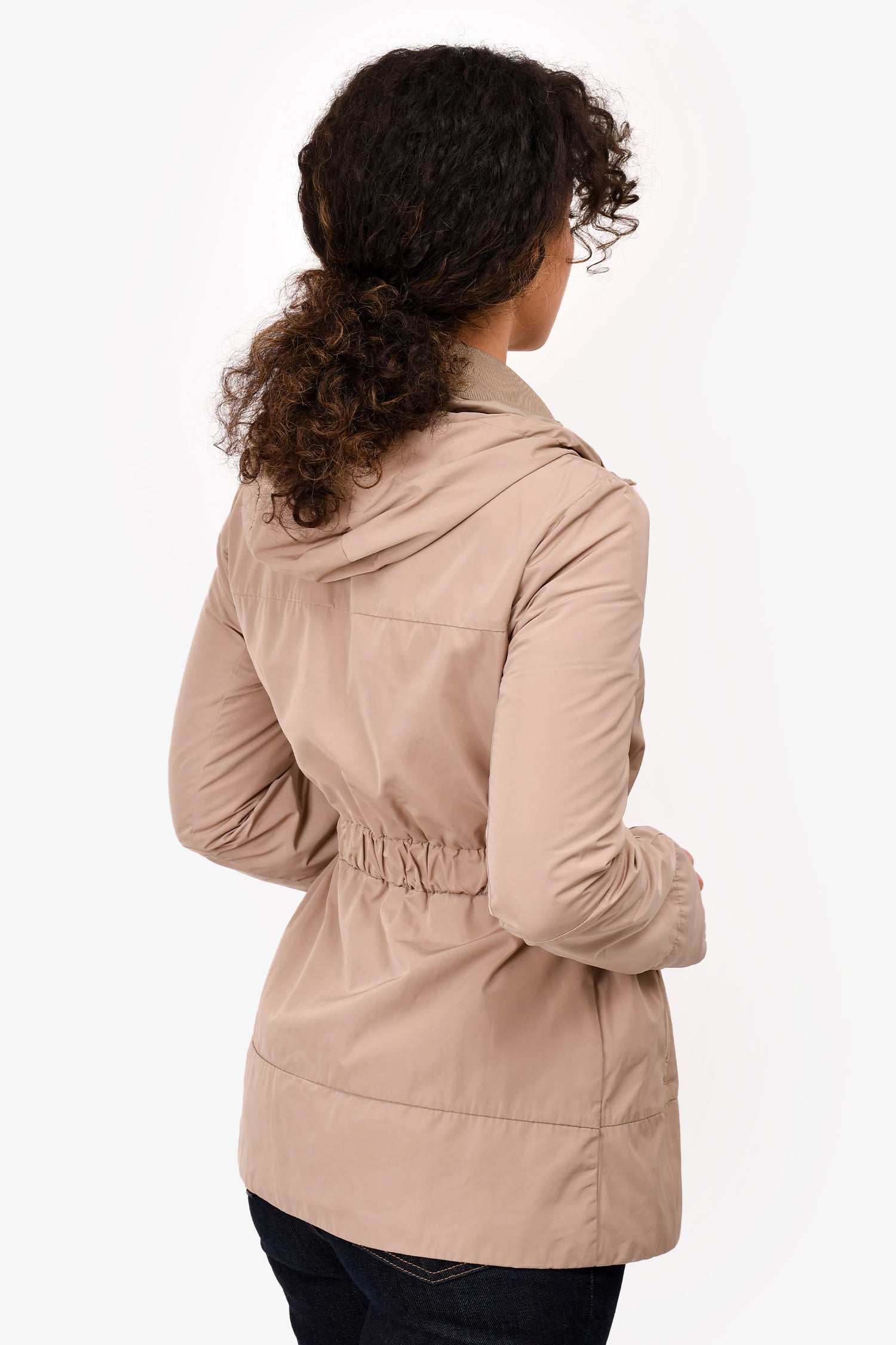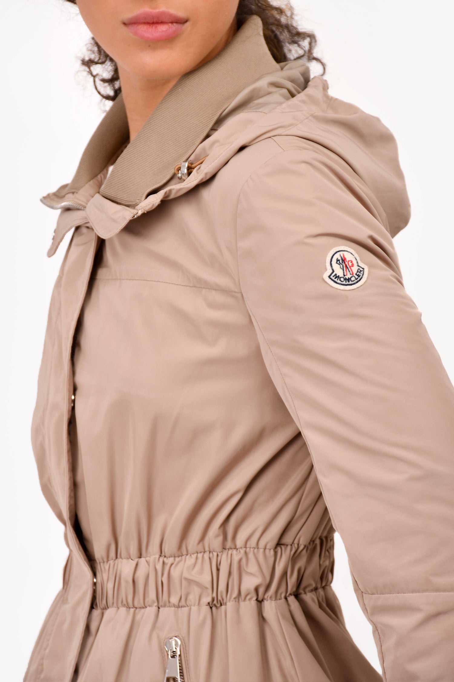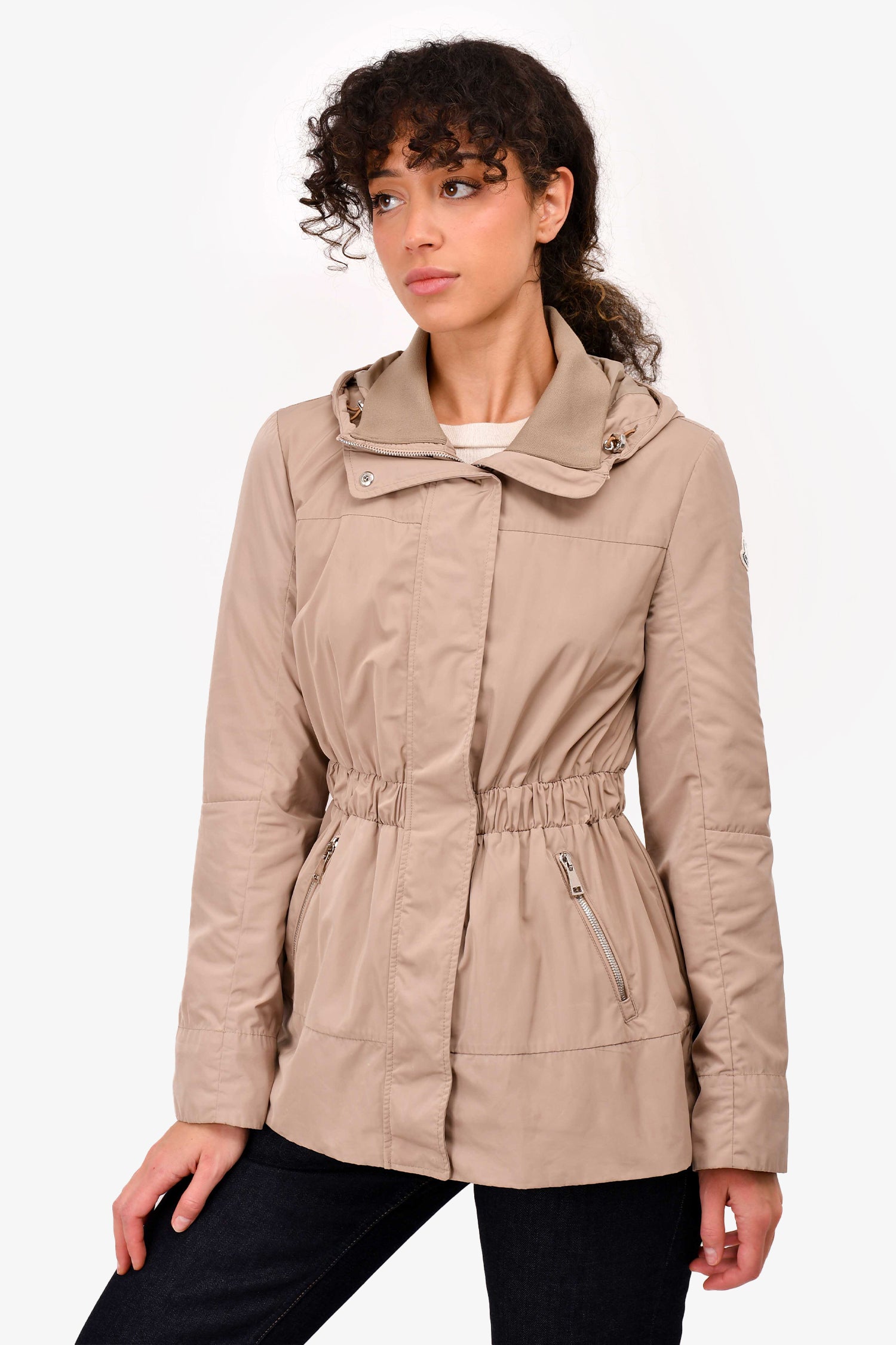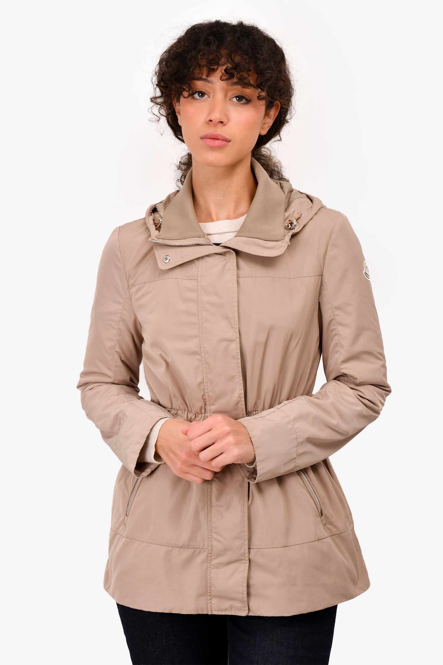 Refresh availabilityMoncler Brown Nylon Light Weight Cinched Jacket. Front two-way zip closure. Front zip pockets. Brand logo patch on the left sleeve.