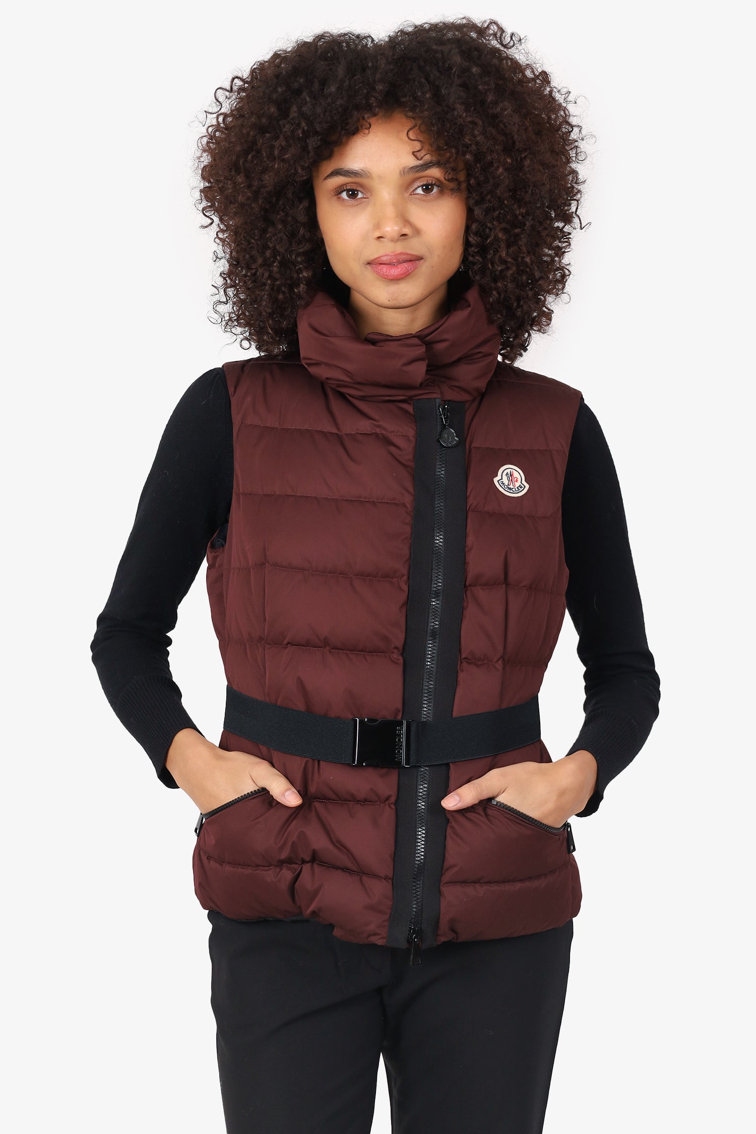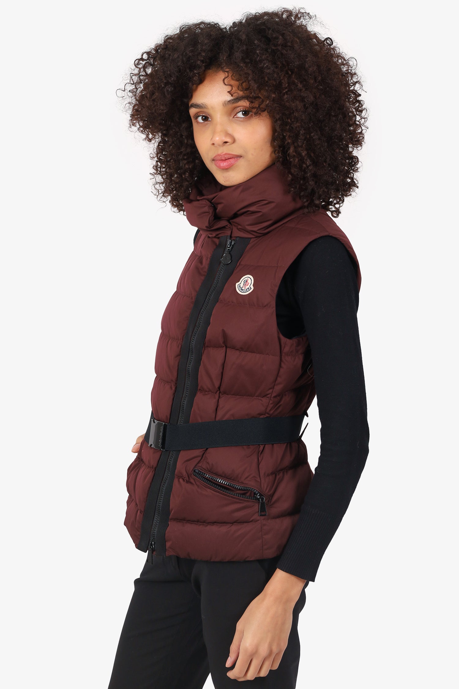 Refresh availabilityMoncler Burgundy Down 'Labas' Belted Vest. Pull-on. High neckline. 2-way front zip closure. Removable elasticated belt with buckle closure. 2 front zip pockets. Lined interior. Tonal stitching.