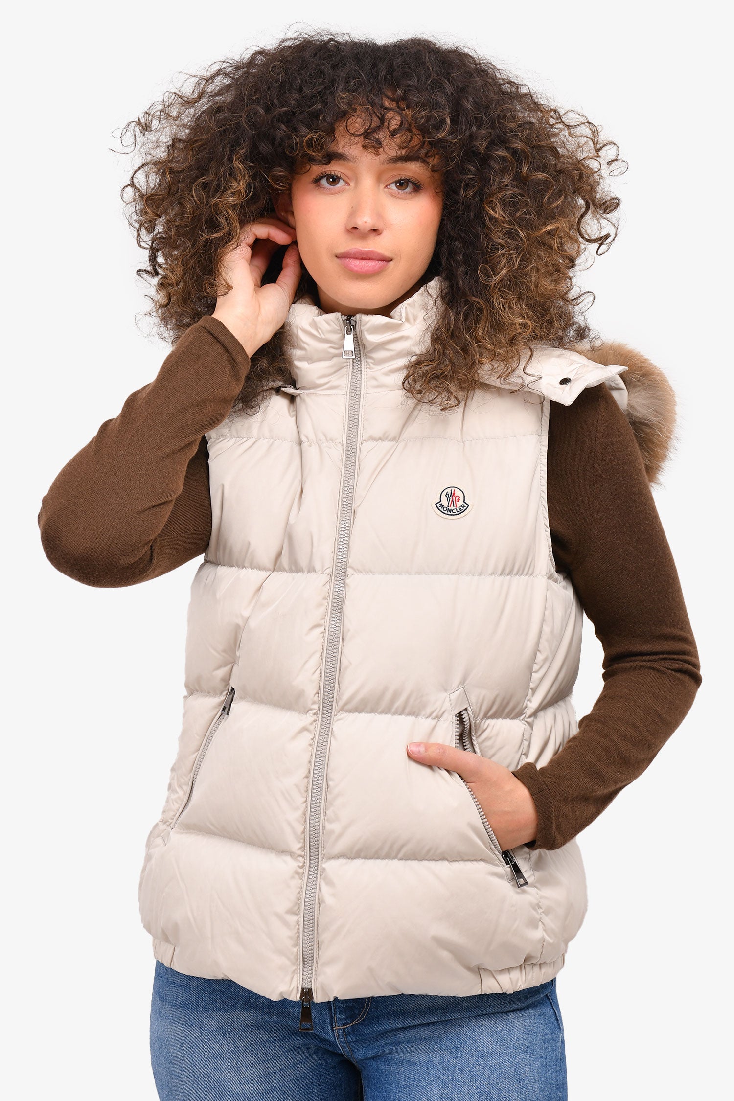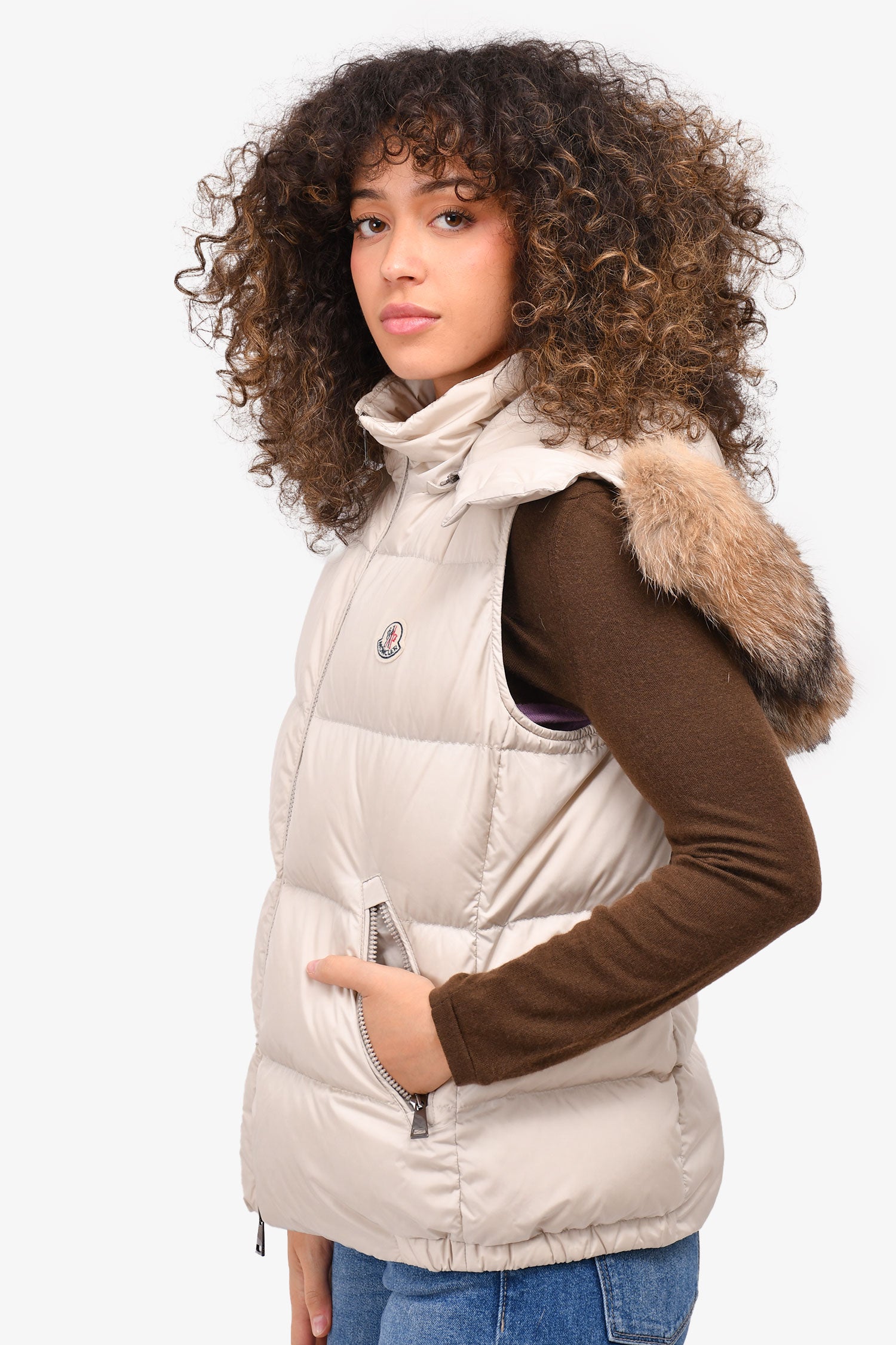 Refresh availabilityMoncler Cream Down Vest with Fur Hood. Tonal stitching. Silver-tone hardware. Double front zippers. Zipped side pockets. Lined interior. Zipped, detachable fur lined hood. Felt 'Moncler' stitched brand logo. Down and feather filled.